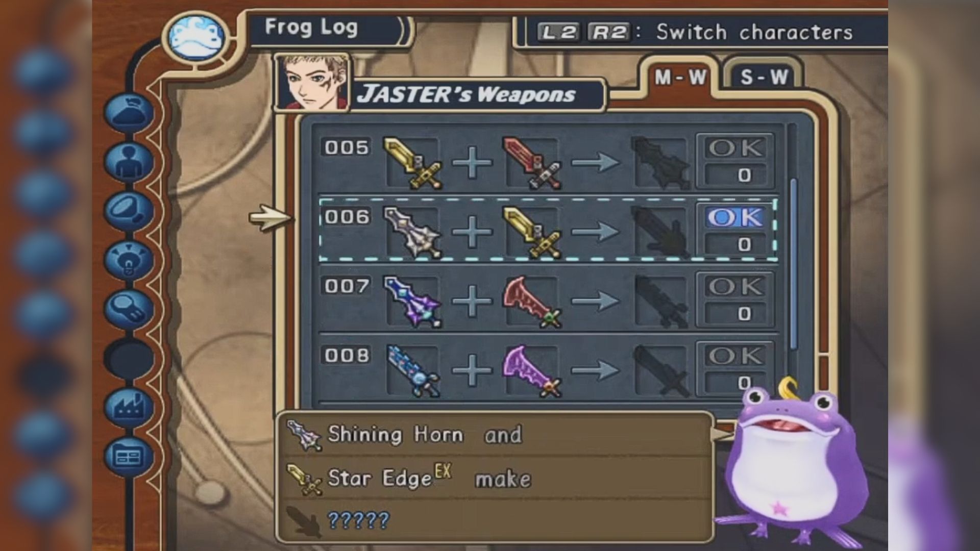 In Rogue Galaxy, weapons can be upgraded through use. The more you battle with a weapon, the better it becomes. Once a weapon reaches its full potential, you can combine it with another to create an even more powerful one. This creates a compelling, but potentially endless, cycle of wanting to improve and combine weapons, which can consume a lot of your time as you chase the best gear.