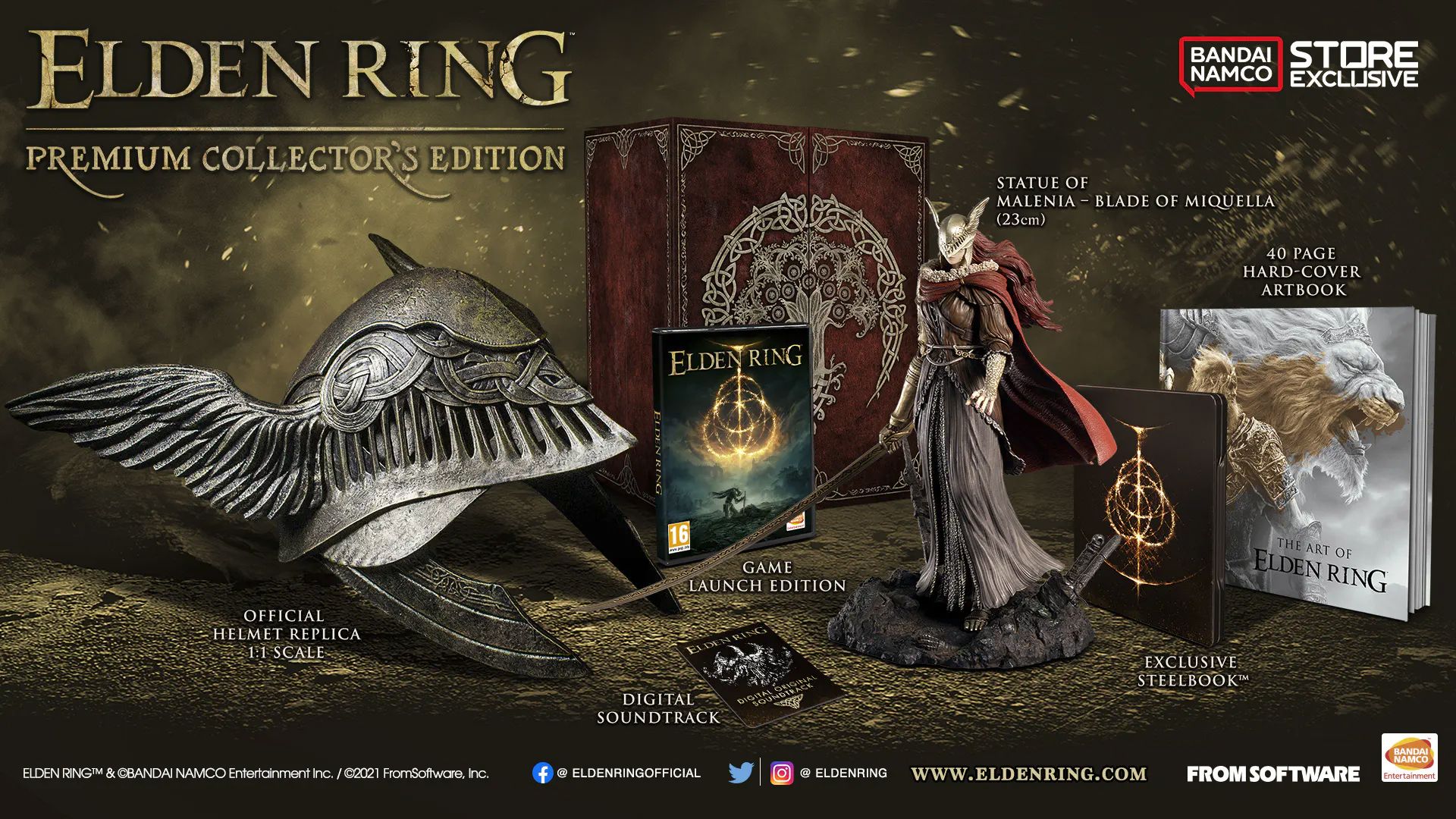 This special edition of Elden Ring includes a poster, woven patch, steelbook case, a Malenia statue, art cards, stickers, a digital soundtrack, a hardcover artbook, and a replica helmet. Originally, a more basic version of this edition was available for $189.99, but it didn’t include the helmet. This edition was produced in limited quantities, and pre-orders had to be closed due to high demand.