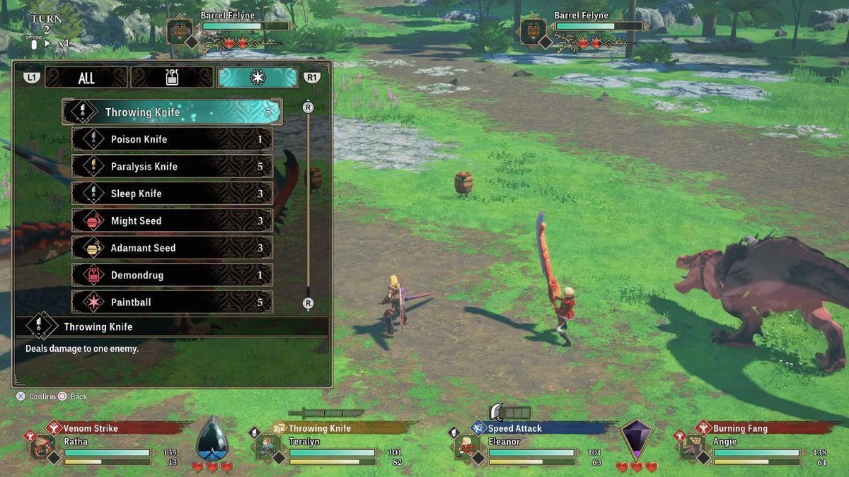 In Monster Hunter Stories 3, defeating Barrel Felynes earns you experience points, making them valuable targets. However, they’re protected by surrounding barrels that significantly boost their defense. While Barrel Bombs are effective against these barrels, throwing knives are a great substitute if you don’t have any. Throwing knives deal a set amount of damage, allowing you to quickly break the barrels and defeat the Barrel Felynes.
