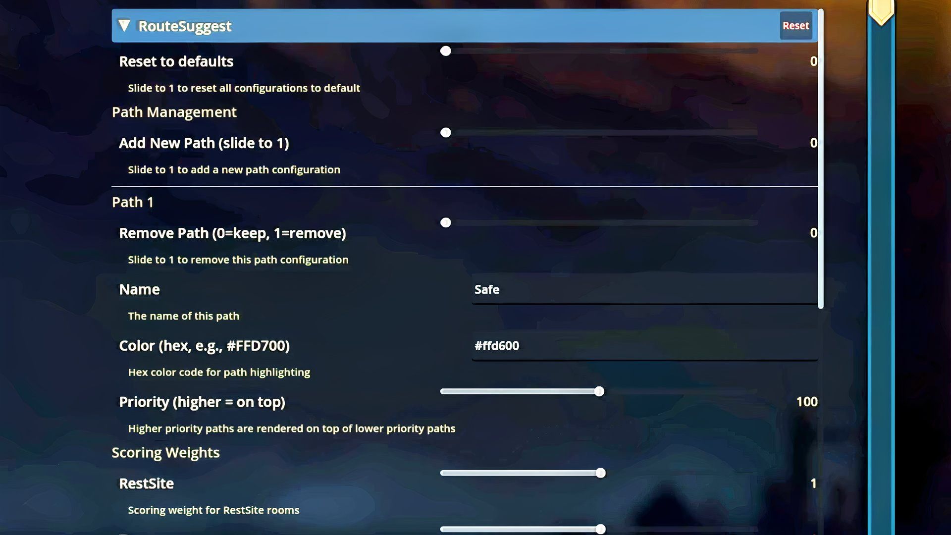 Although Route Suggest will work without it, we highly recommend using ModConfig alongside it. ModConfig adds Route Suggest to the game’s mod menu, making it easier to find and adjust settings. Without ModConfig, you’d have to manually edit a configuration file. These settings let you personalize the mod by changing the color of the suggested paths and adjusting how different room types are scored.