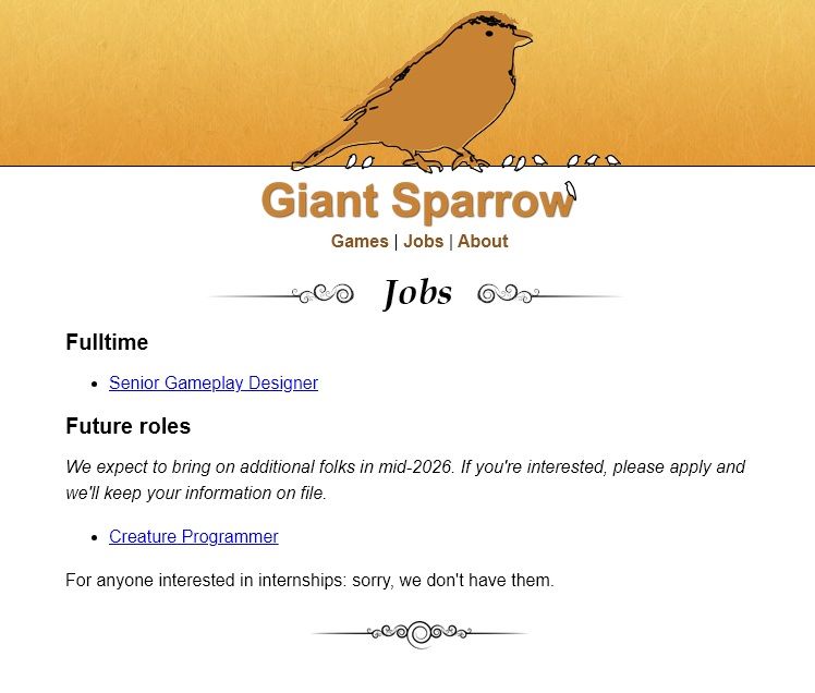 Giant Sparrow is currently hiring a Senior Gameplay Designer and plans to add a Creature Programmer to the team around mid-2026. This suggests development on their third game is gaining momentum. However, details like a trailer release date, the game’s title, and a potential playtest timeframe remain unknown.