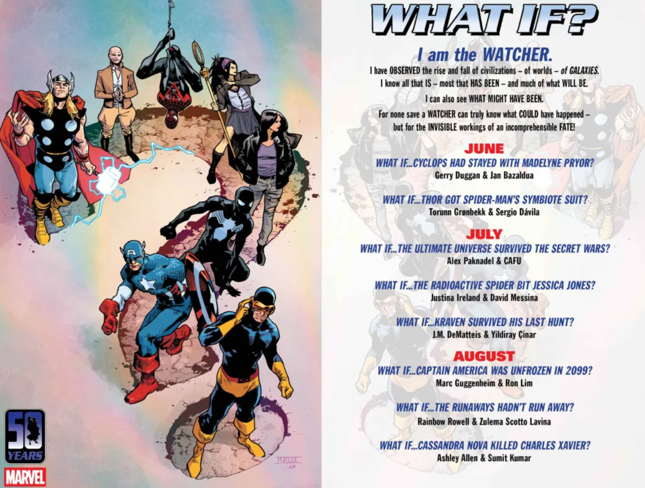 As a huge Marvel fan, I’m so excited about all the cool stuff coming up! Besides the awesome variant covers – like that giant Daredevil one – we’re finally getting some proper What If…? comics! In June, they’re going to show us what Cyclops’ life would have been like if he’d stayed with Madelyne Pryor, and it’s wild to think about Thor getting the Symbiote instead of Spider-Man. Then in July, they’re diving into an alternate version of the original Ultimate universe surviving Secret Wars, imagining Jessica Jones with spider-powers, and exploring what would’ve happened if Kraven lived. And August? Get ready for Captain America waking up in the year 2099, the Runaways not actually running away, and a seriously dark take where Cassandra Nova kills Professor X! It’s going to be a great few months!