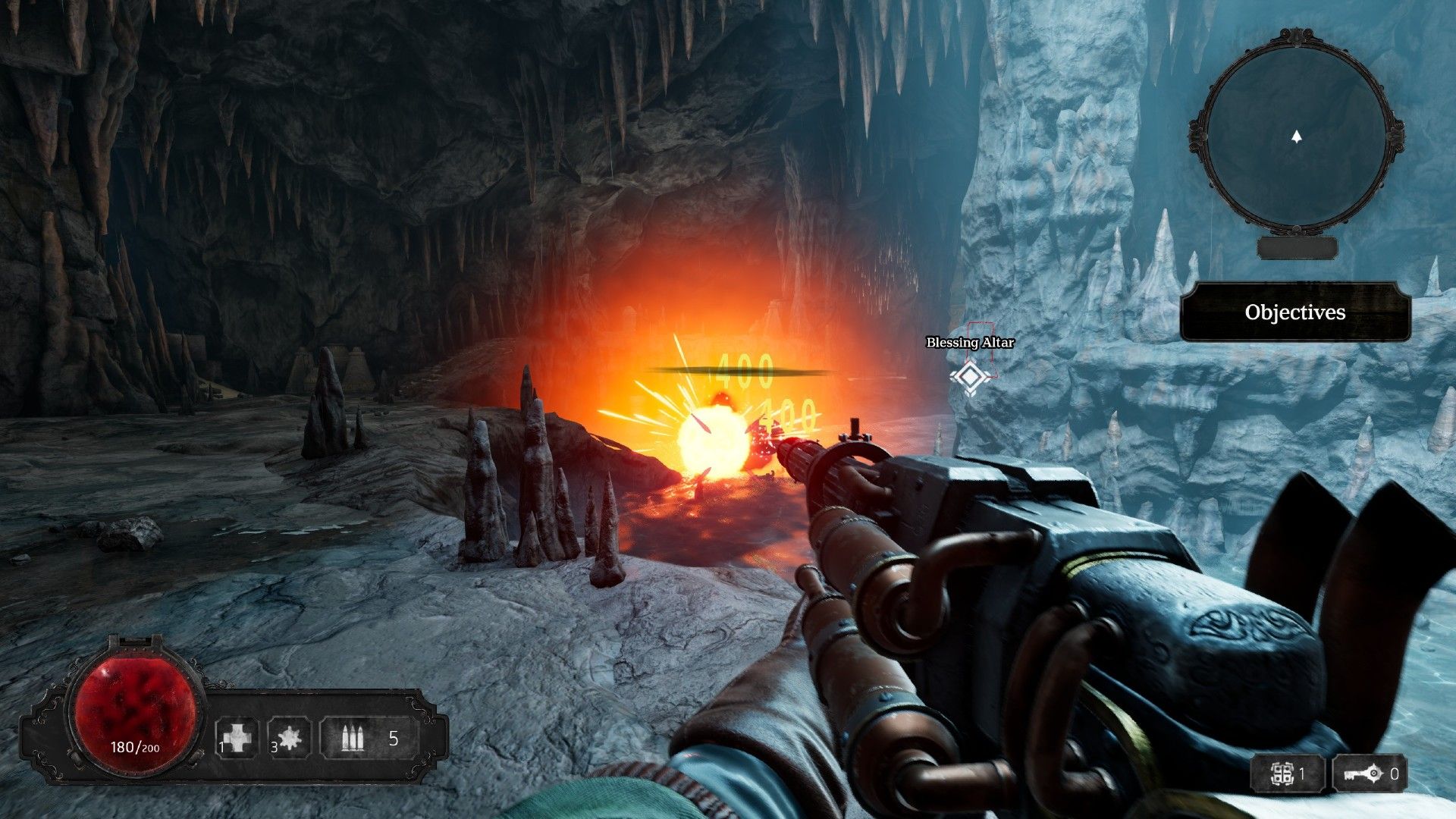 In the spirit of BioShock, the gameplay progression and skill system in Abyssus is strikingly similar. Following the defeat of a group of enemies, players often discover radiant green Altar of Blessings that offer two potential rewards. These benefits are typically associated with various elemental damage types (such as wind, fire, or spirit) and present a choice between enhanced damage for that type and an affinity for either primary, secondary, or special weapon firing, or the character’s unique abilities. Each of these elements offers a distinct experience, reminiscent of plasmids in BioShock, making it engaging to test out these skills to discover the most effective loadout for combating enemies within Abyssus.