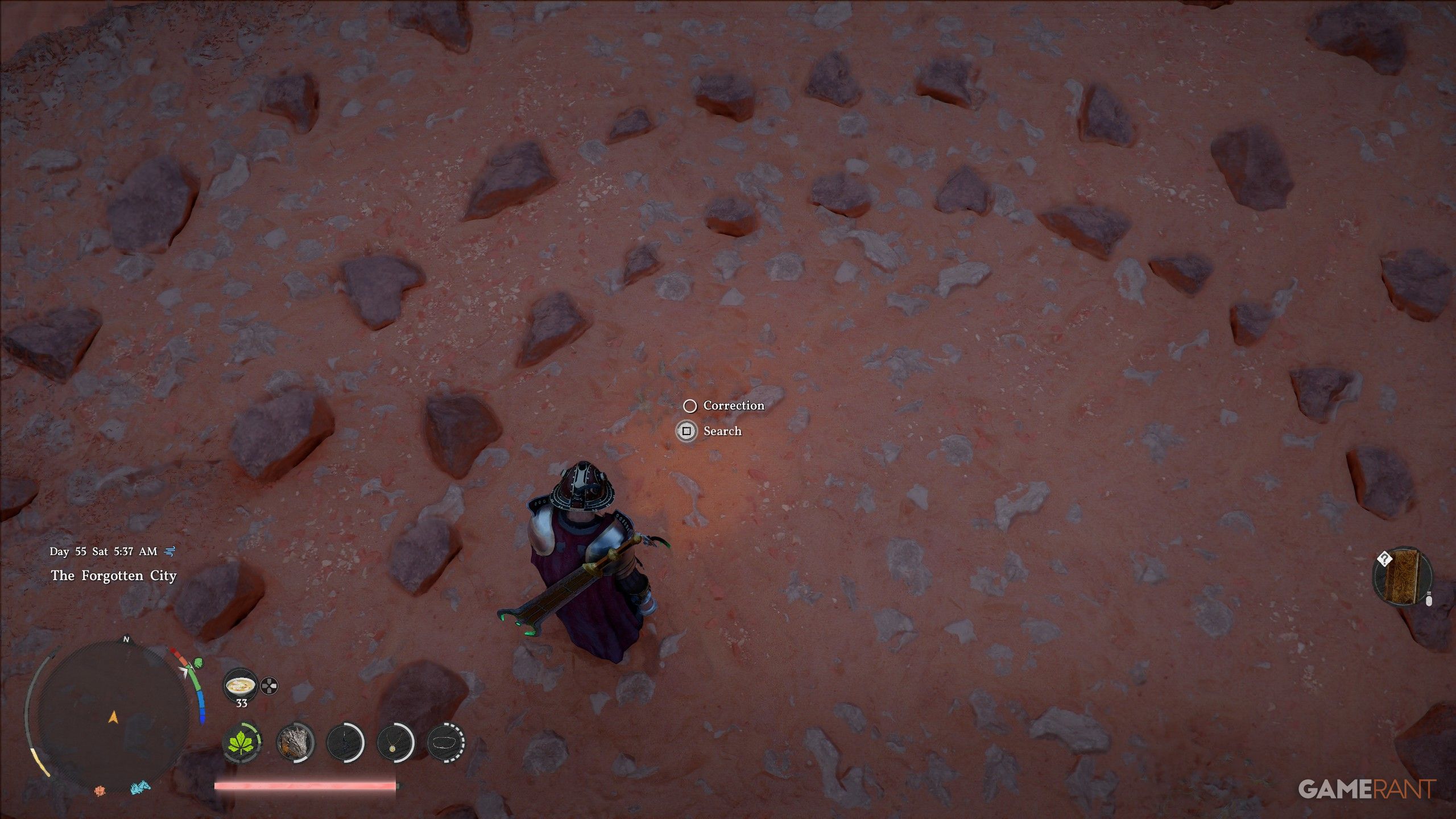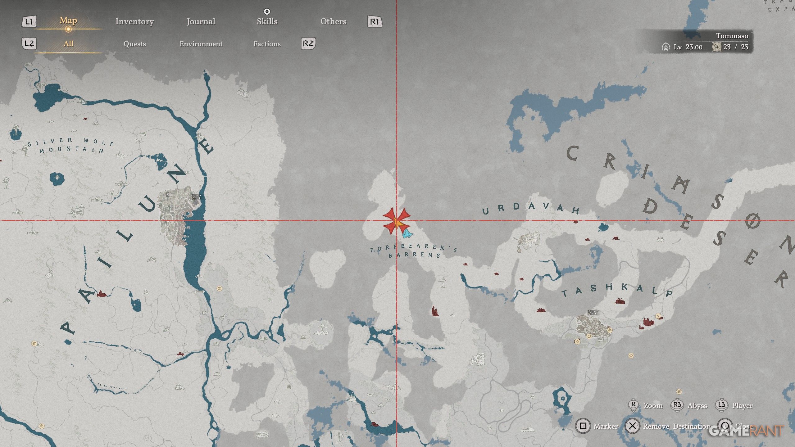 - Head north of the first “E” in “Forebearer’s Barrens”, located in the west region of the Crimson Desert.