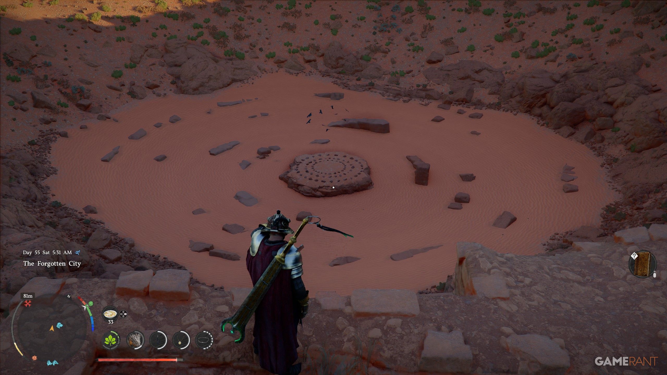- You’ll find the Forgotten City here, which is mainly just desert sands with a central rock.