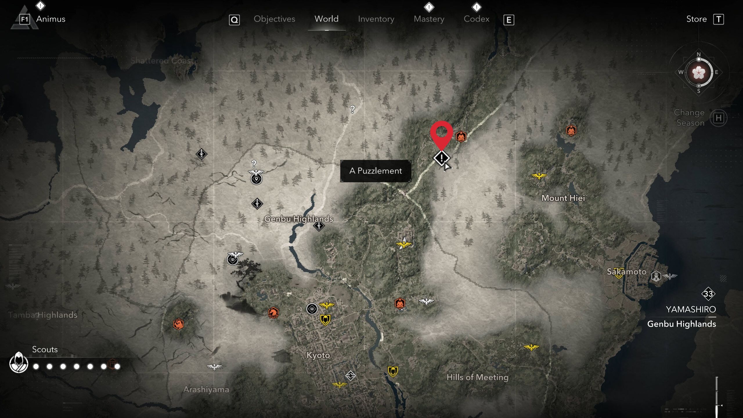 Once you’ve unlocked Yasuke as a playable character in Assassin’s Creed Shadows, you can begin the “A Puzzlement” quest. The quest starts in the Genbu Highlands area of the Yamashiro region, which is northeast of Kyoto. A quick way to get there is to fast travel to Hanazono Castle, as the quest location is nearby.