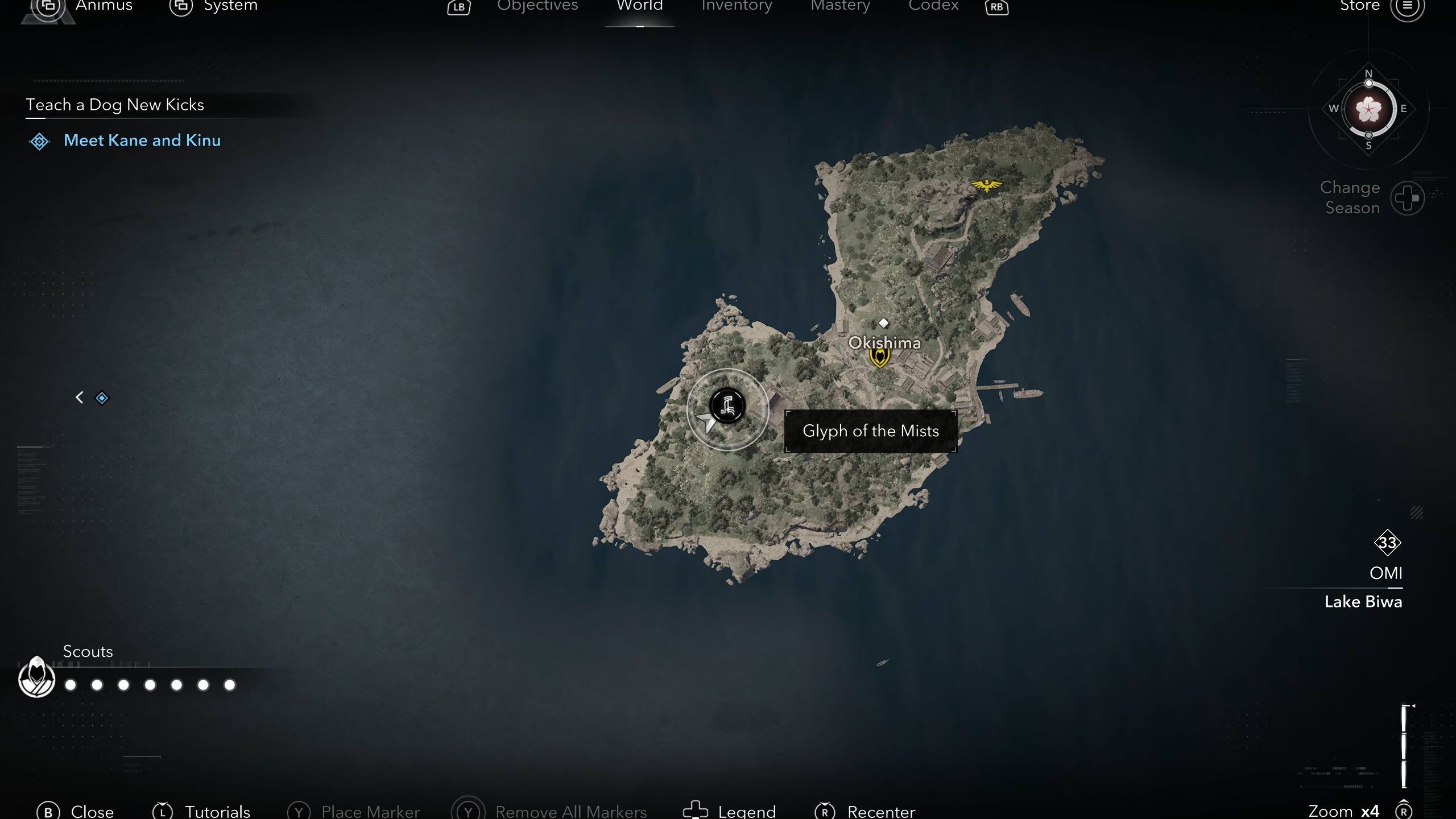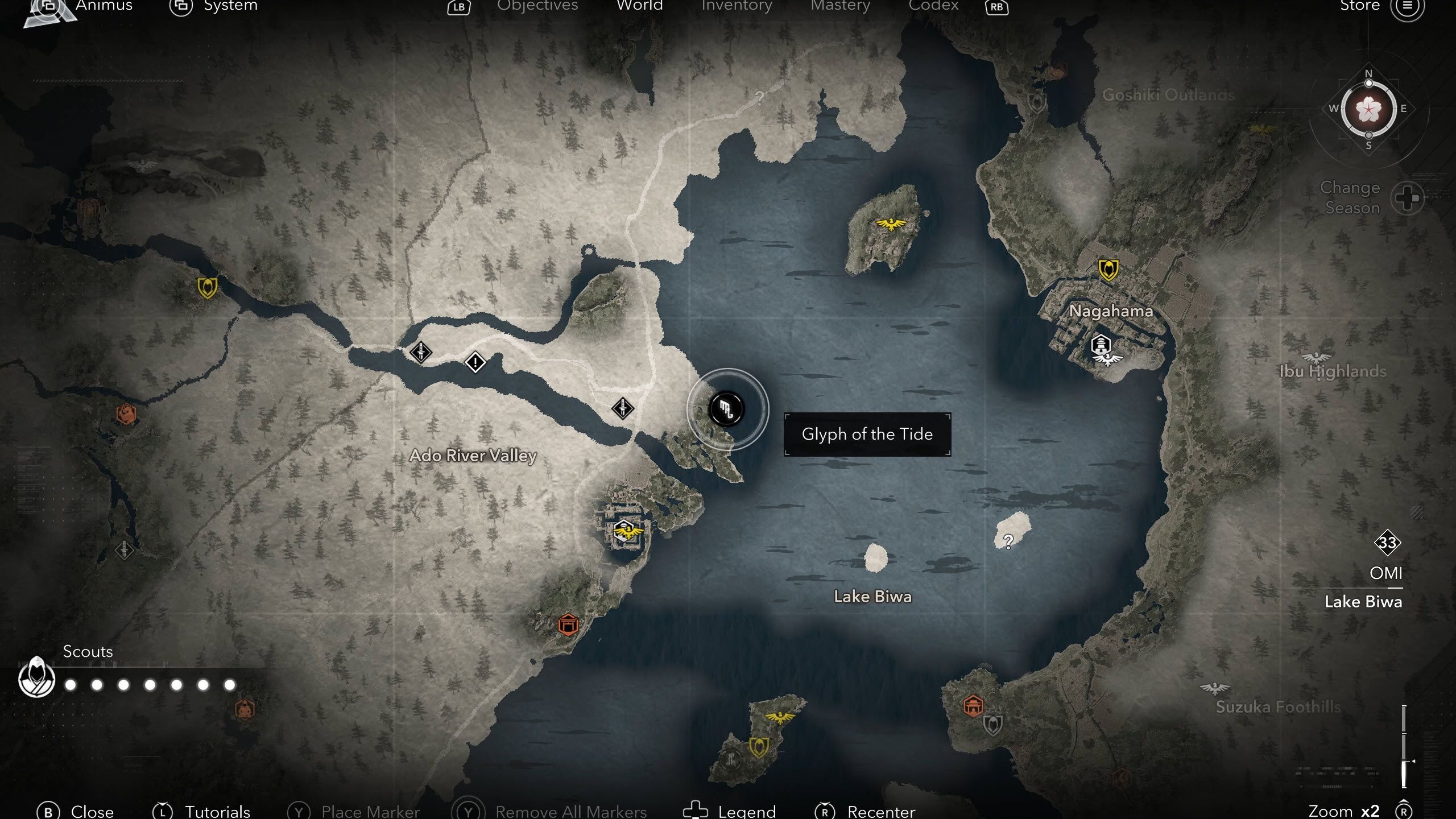 | Glyph of the Mists | Located on Lake Biwa’s Okishima Island in the Omi region, players can find the glyph by descending the cliff behind the shrine building. |