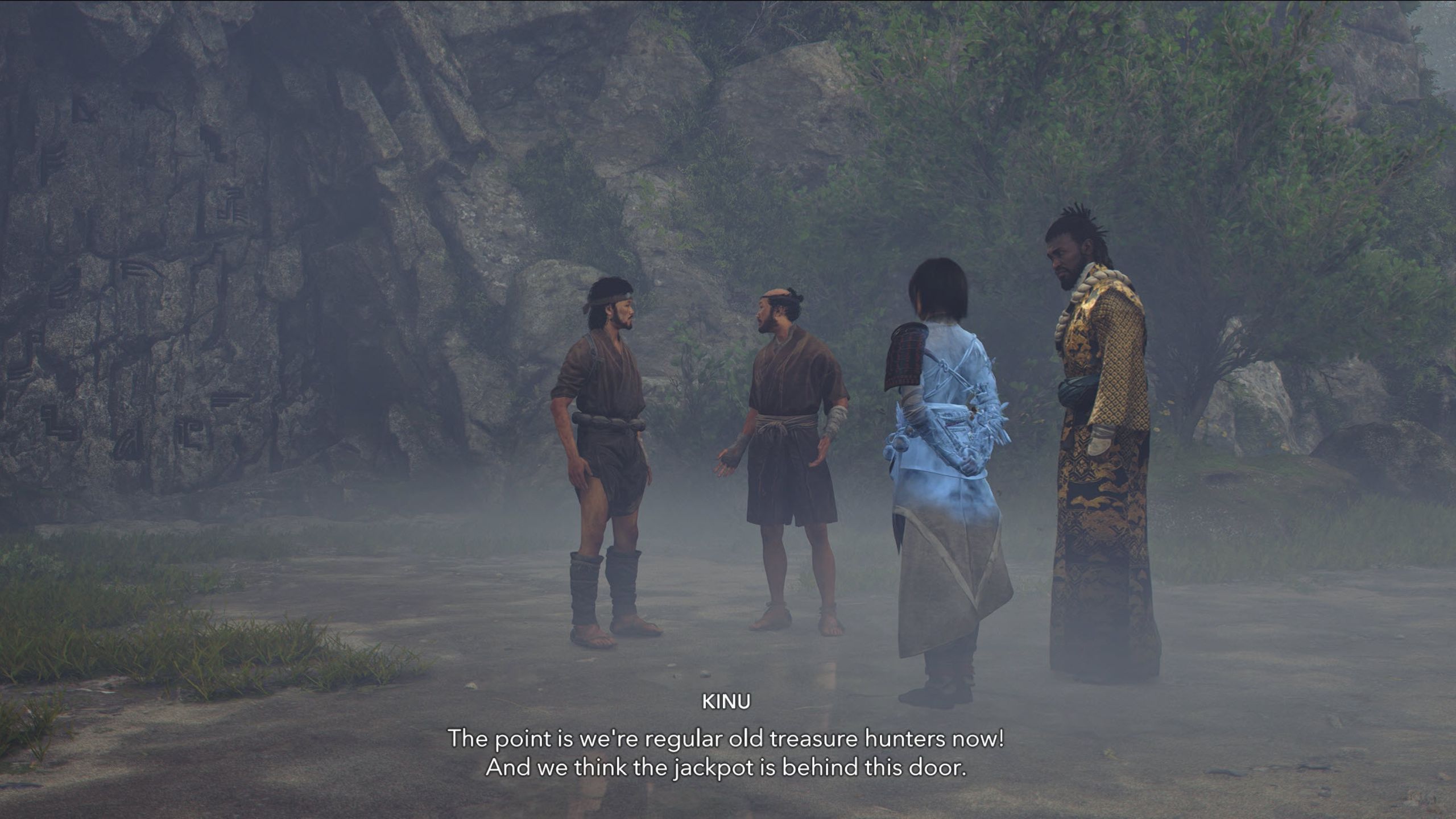 When you reach the location, Kinu and Kane will inform Naoe and Yasuke about a peculiar door covered in symbols. They’ll say treasure lies beyond it and give Naoe and Yasuke the Riddle Scroll Beacon. It’s important to equip this item, as it will help you find hidden symbols throughout the area.