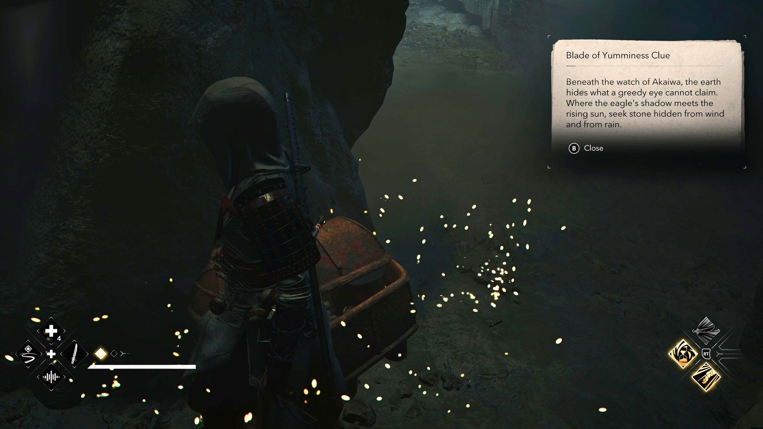 In Assassin’s Creed Shadows, open the chest to obtain the Blade of Yumminess and discover a hint for what to do next.