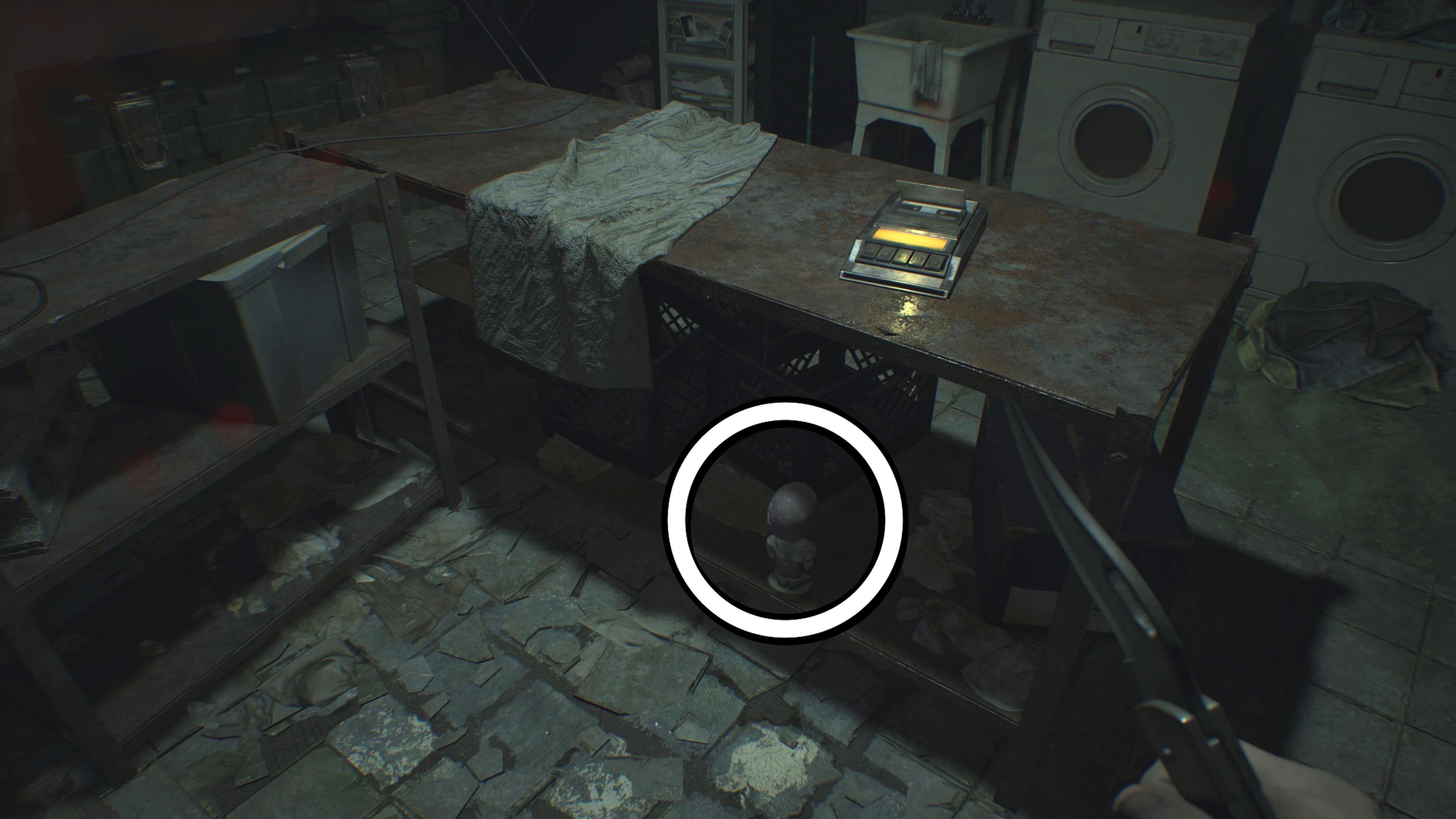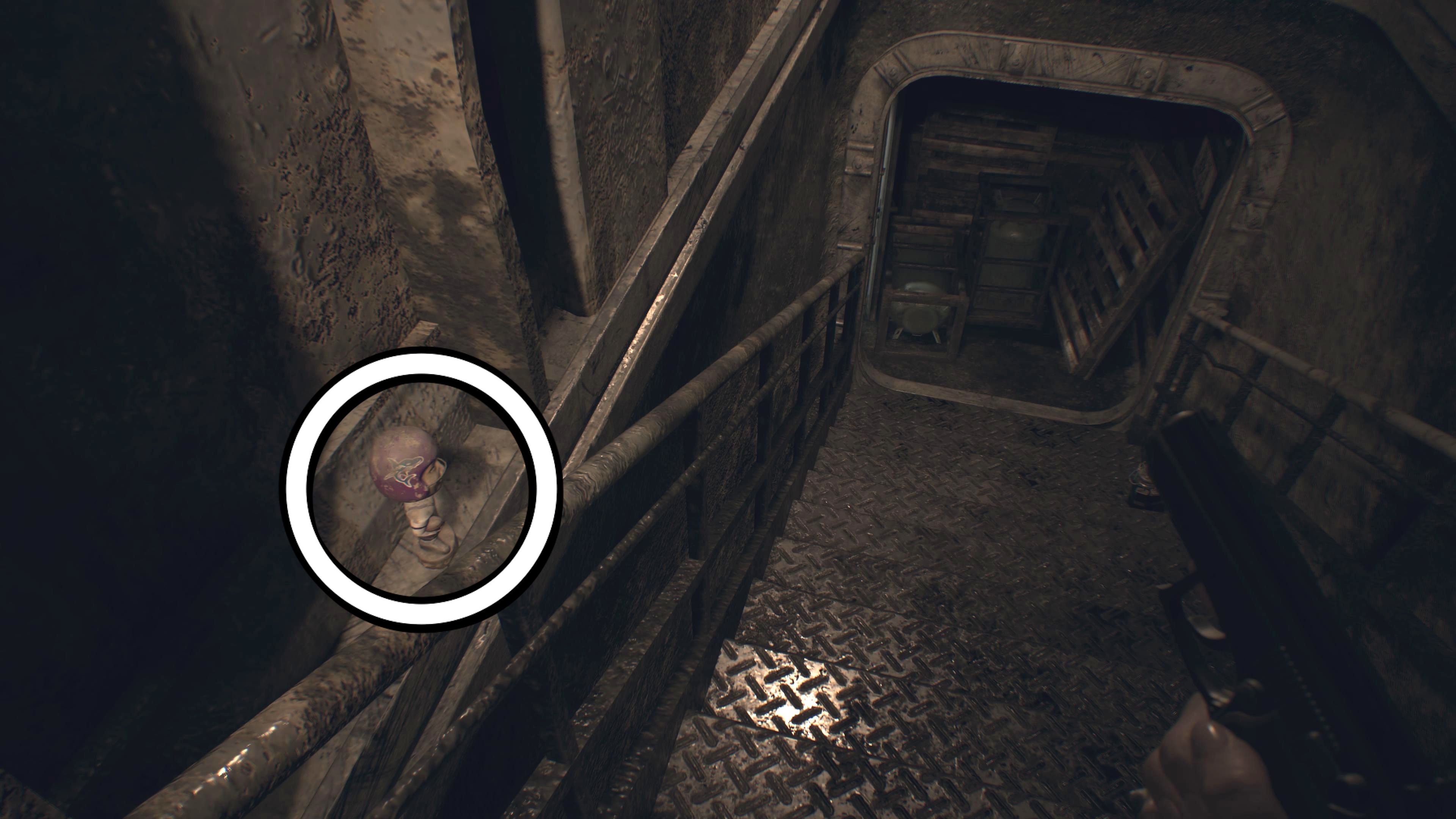 Okay, so I found another bobblehead! This one was a little tricky – it was hidden behind a bucket near the Snake Door that leads to the Morgue in the B1 Processing Area of the main house. I spotted it while I was searching for those three Dog Heads in Resident Evil 7. Definitely keep an eye out for it!