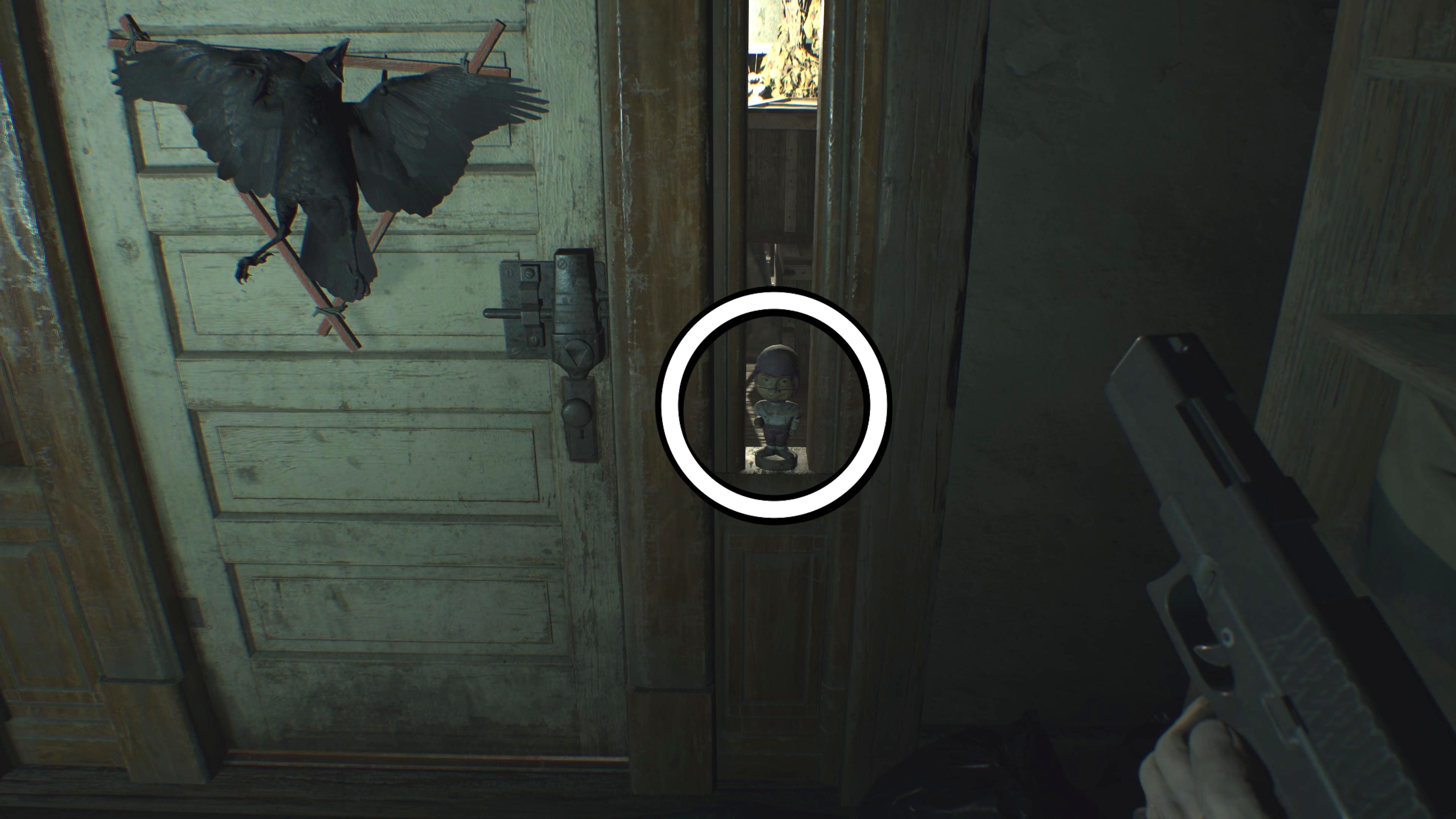 After you complete the shadow puzzle in the Main Hall, Ethan will crawl through an opening in the wall and reach a new room. You’ll find the next Bobblehead next to the Crow Door in the Drawing Room on the first floor of the Main House.