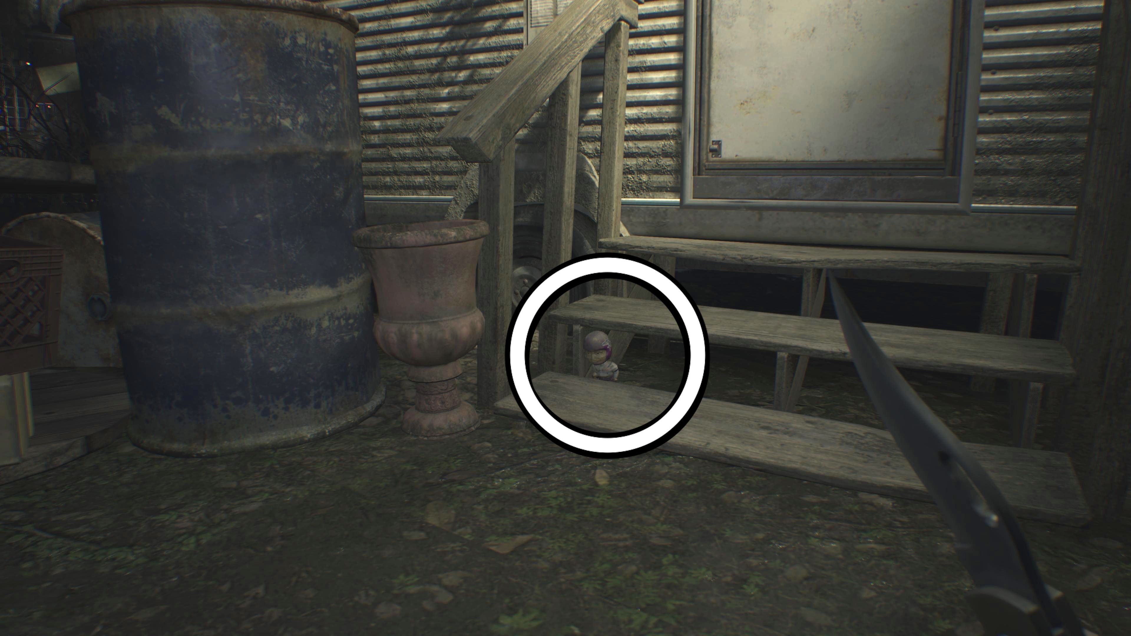 The first Mr. Everywhere collectible, not found inside the main Baker house, is hidden under the stairs that lead to the trailer in the Yard.