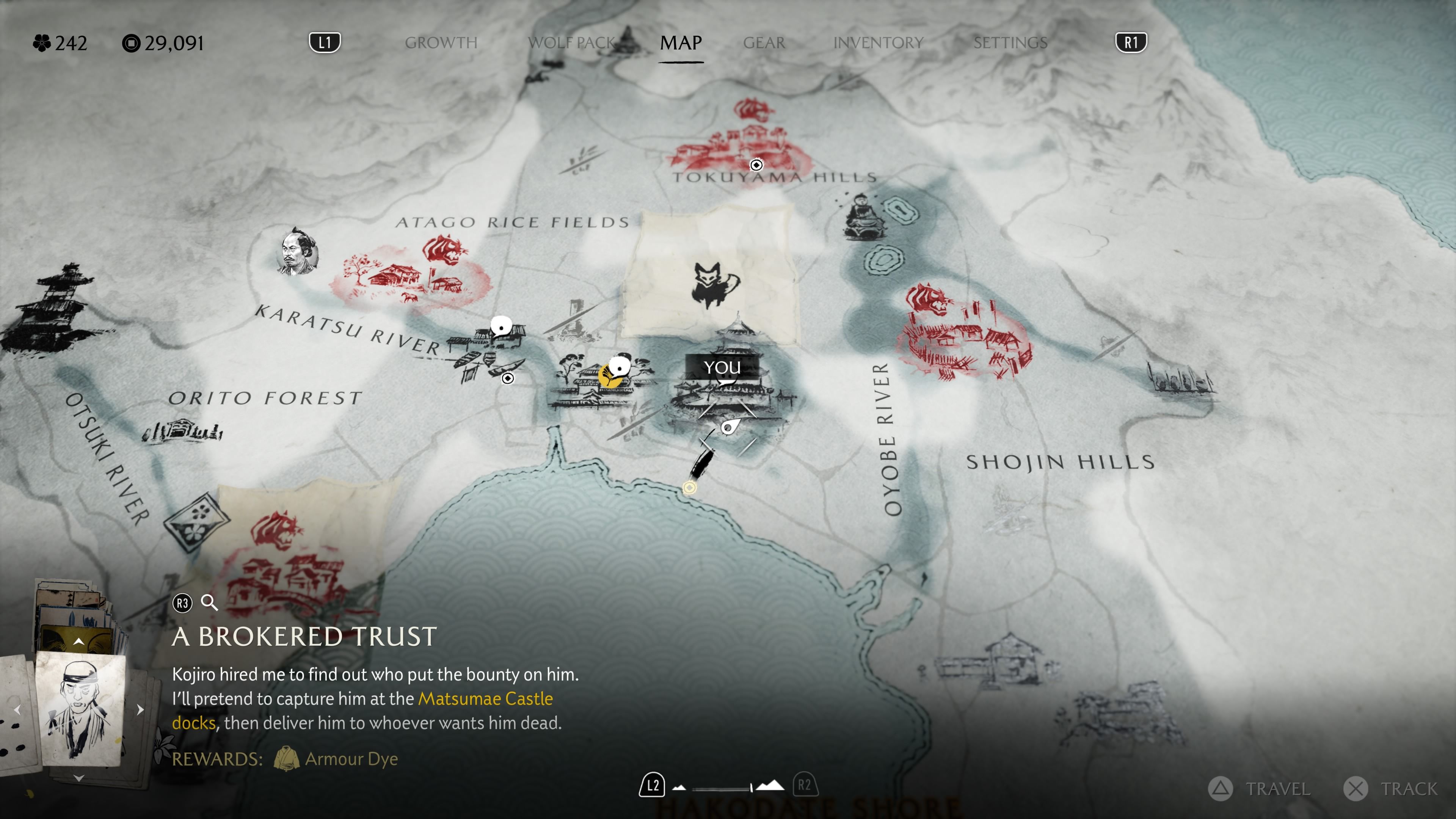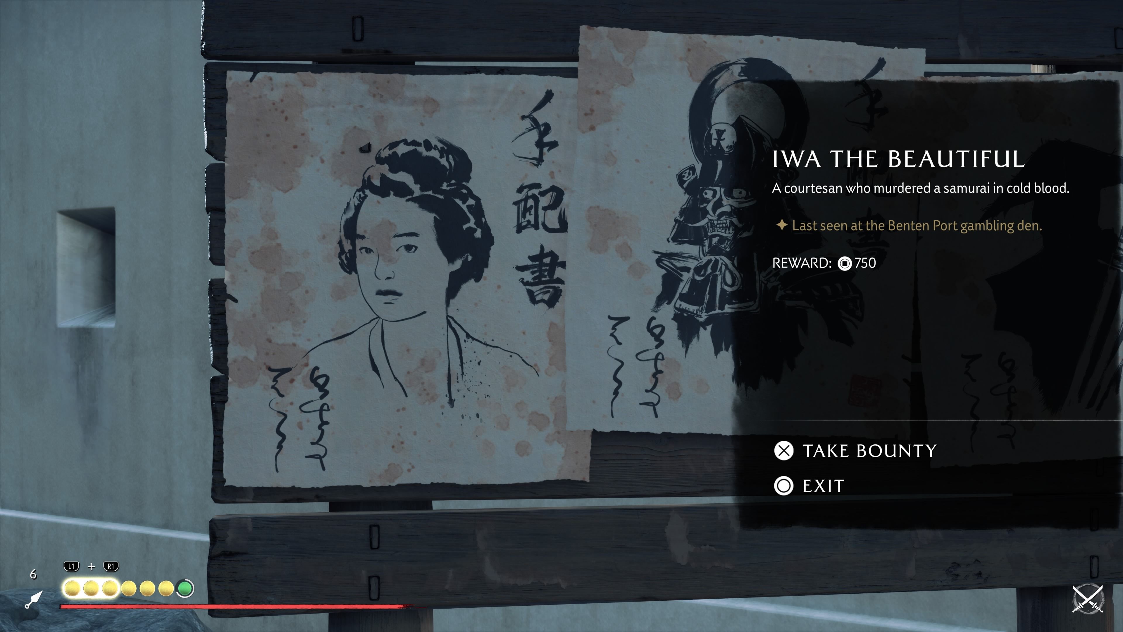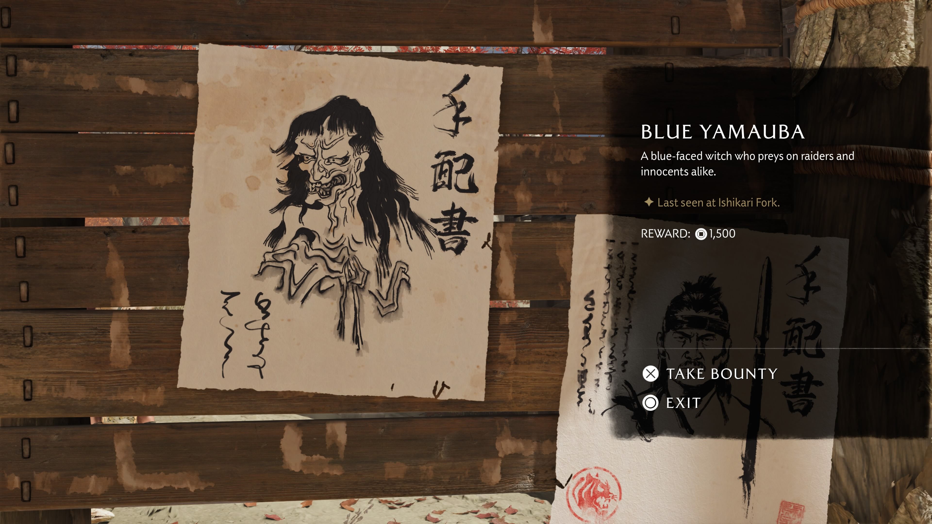 Check the bounty board at Matsumae Castle for a wanted poster – you’ll notice the drawing has a pair of glasses added! To begin the quest, go south from the Oyobe River to the coast and find a wandering samurai (ronin). They’ll send you further south, towards Hakodate Shore, to Mad Goro’s House. Follow their instructions to finish the bounty and complete the quest.