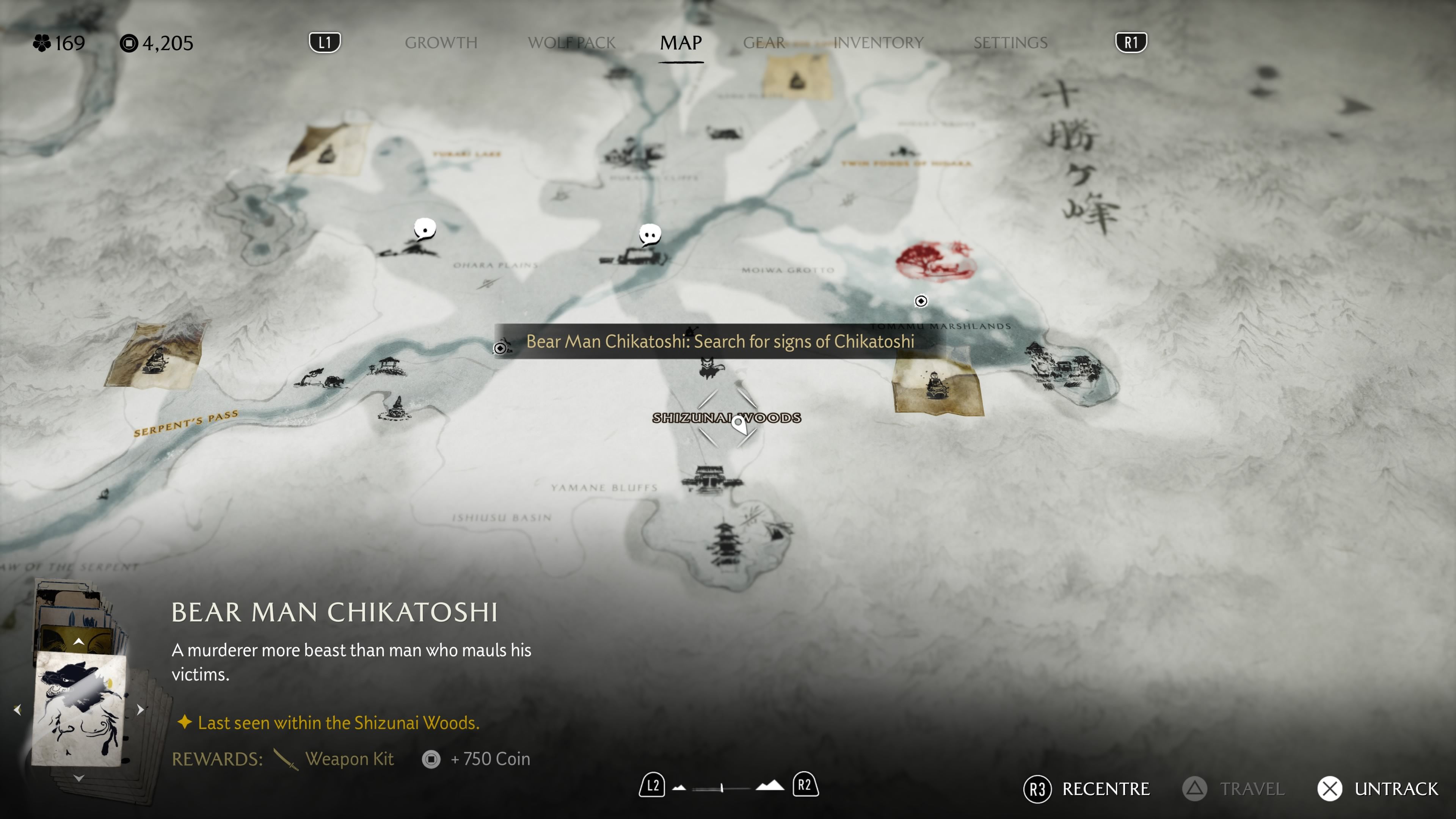 You can find Bear Man Chikatoshi’s bounty at the Huranui’s Rest Inn. Alternatively, explore the Shizunai Woods, south of the inn. Within the woods, look for a body near a tree – it’s located roughly between the ‘I’ and ‘W’ on the map label for Shizunai Woods. Examining the body will trigger a fight with a bear, which then summons Chikatoshi.