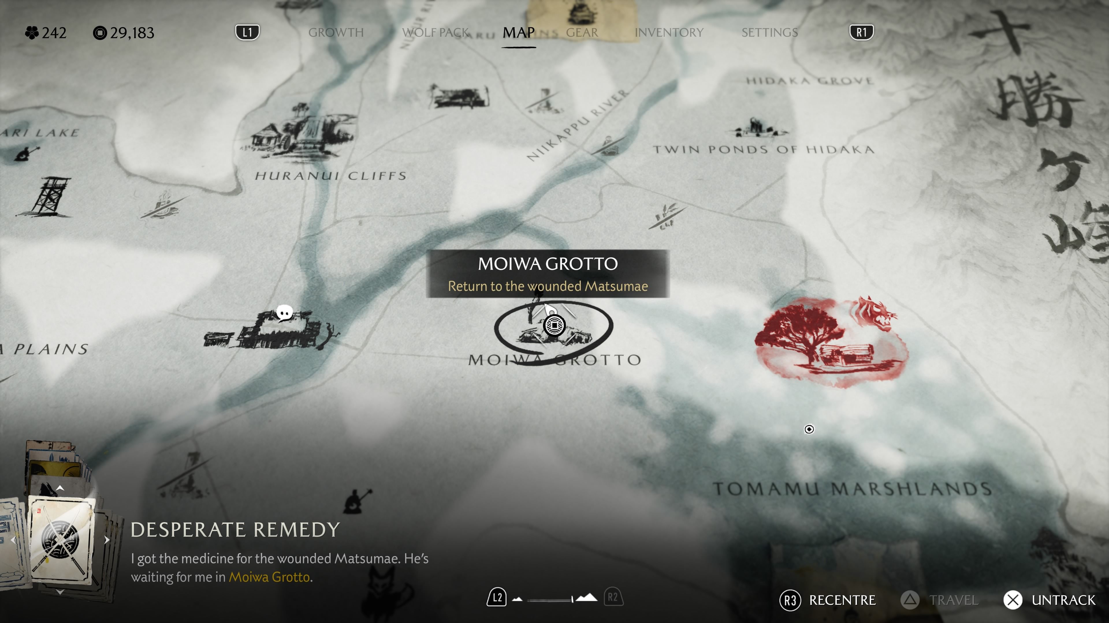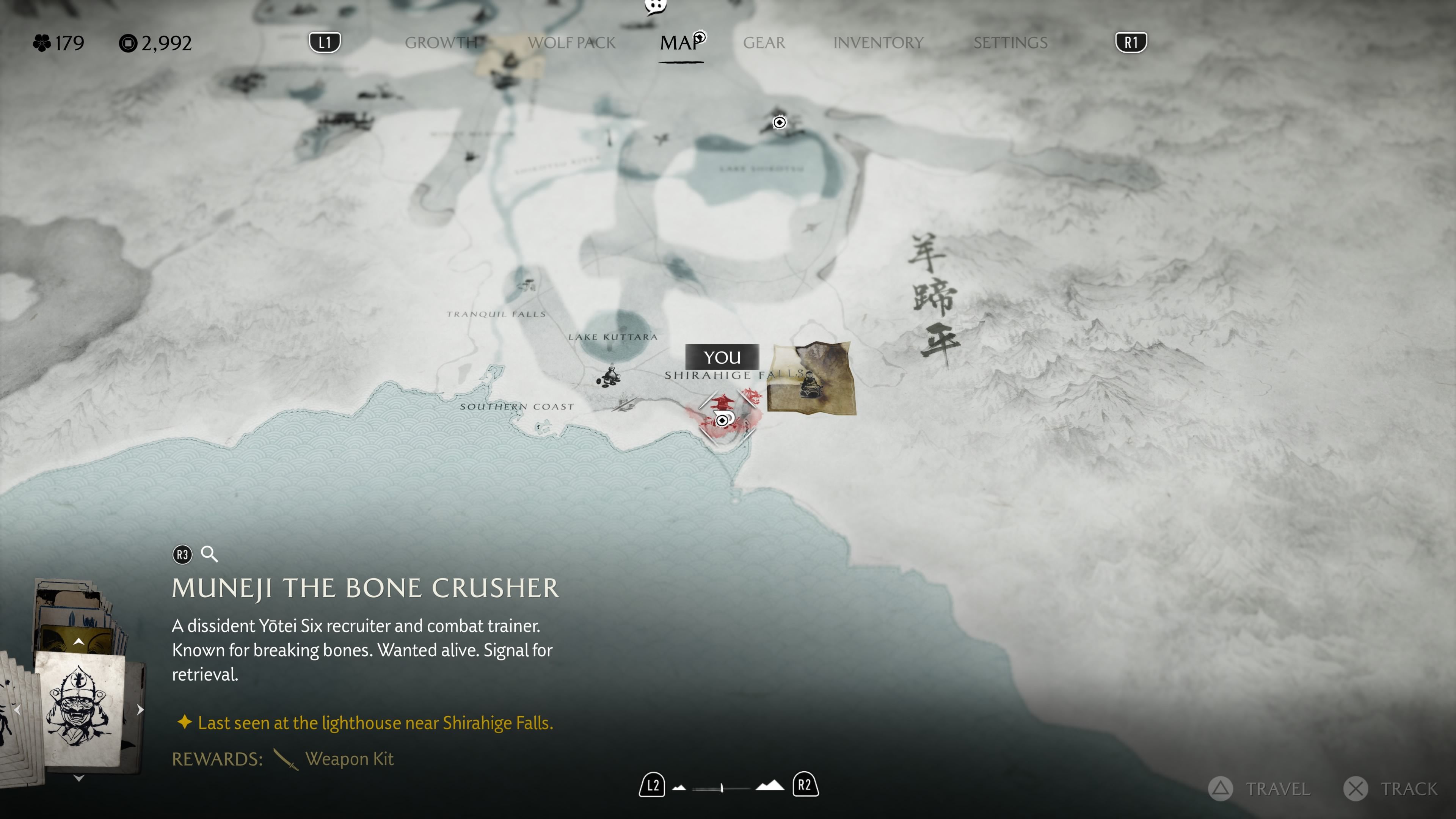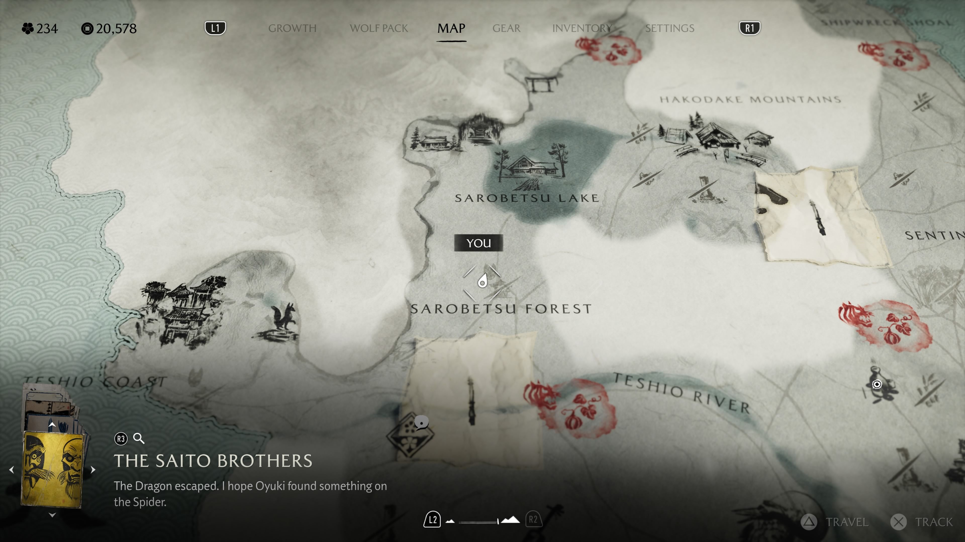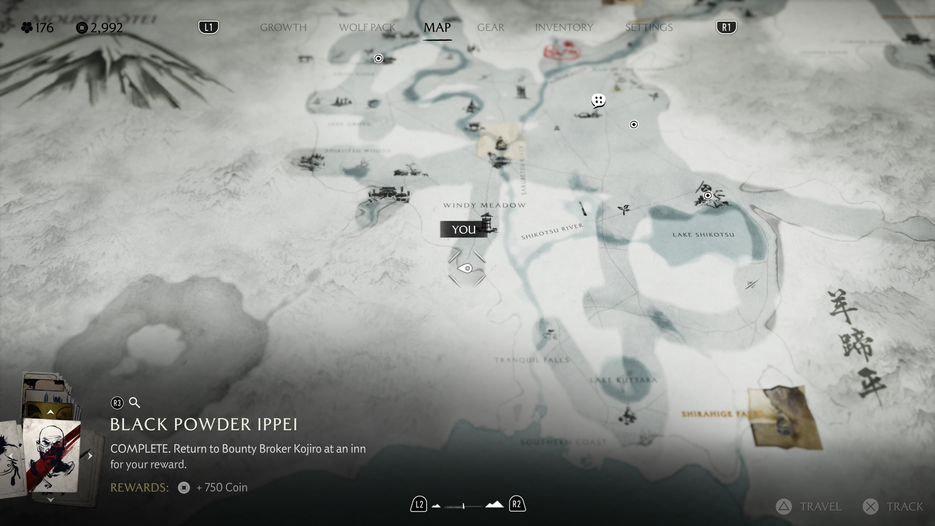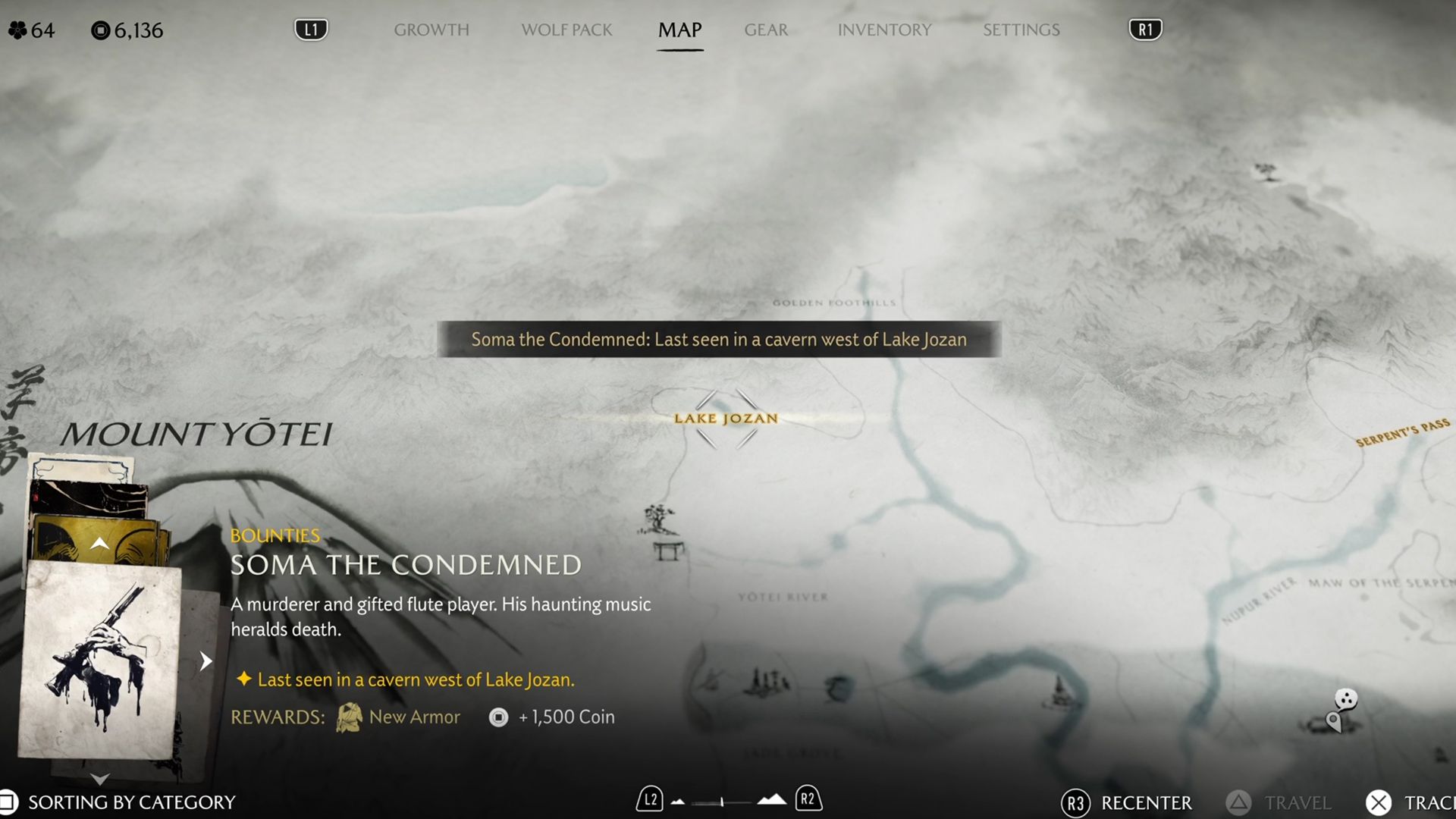 Once you’ve finished the earlier quests in the Yotei Grasslands, go back to the Yotei’s Shadow Inn and talk to Kojiro, who’s near the bounty board. He’ll give you a new quest: to find Soma the Condemned. You’ll find Soma north of the Yotei River, on the western side of Lake Jozan. Look for a cave at the edge of the map with a locked gate. To open the gate, swipe left on the touchpad and play the “Song of Soma” on your shamisen (you’ll get this song automatically). Then, go through the cave to start the fight.