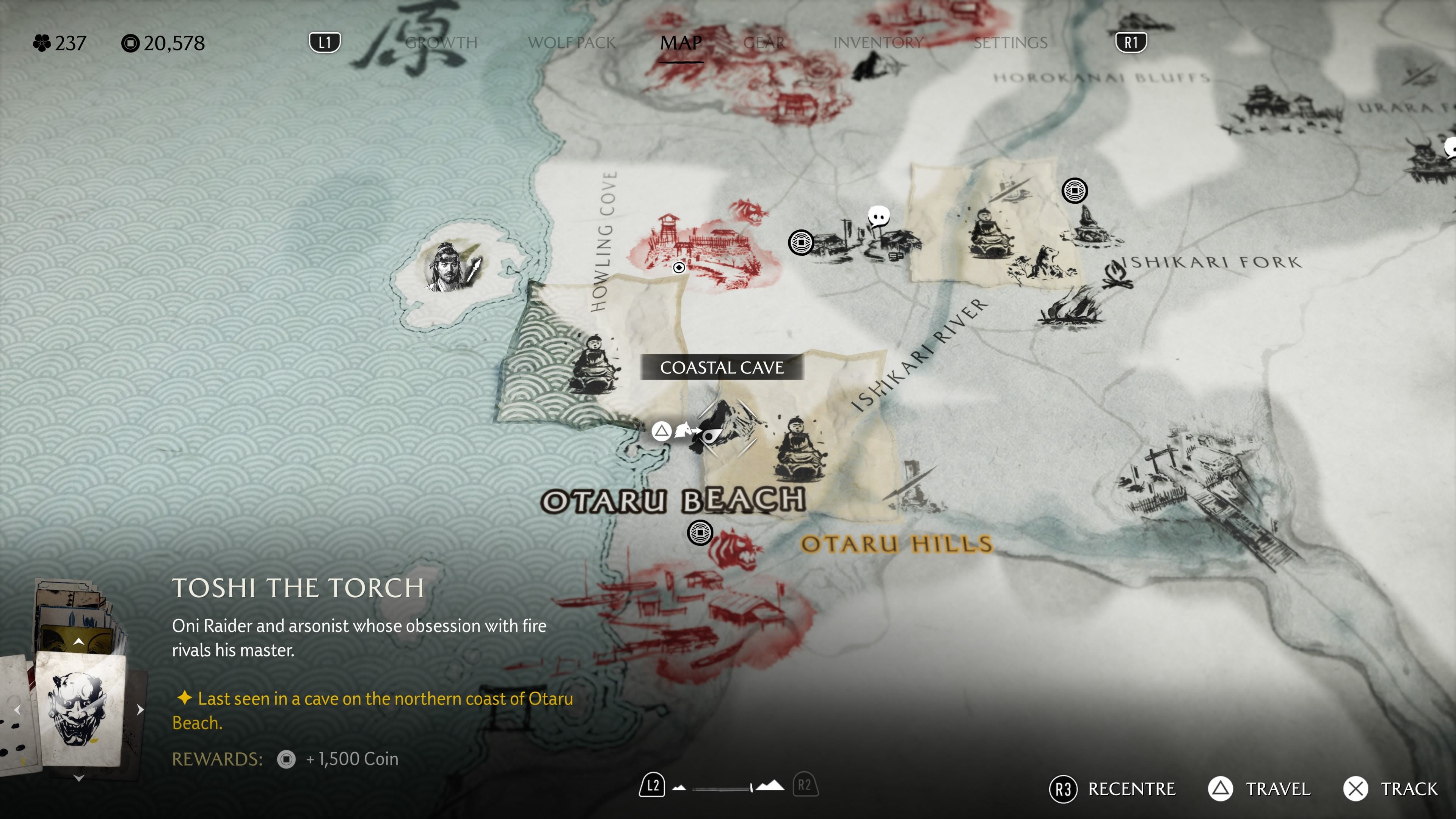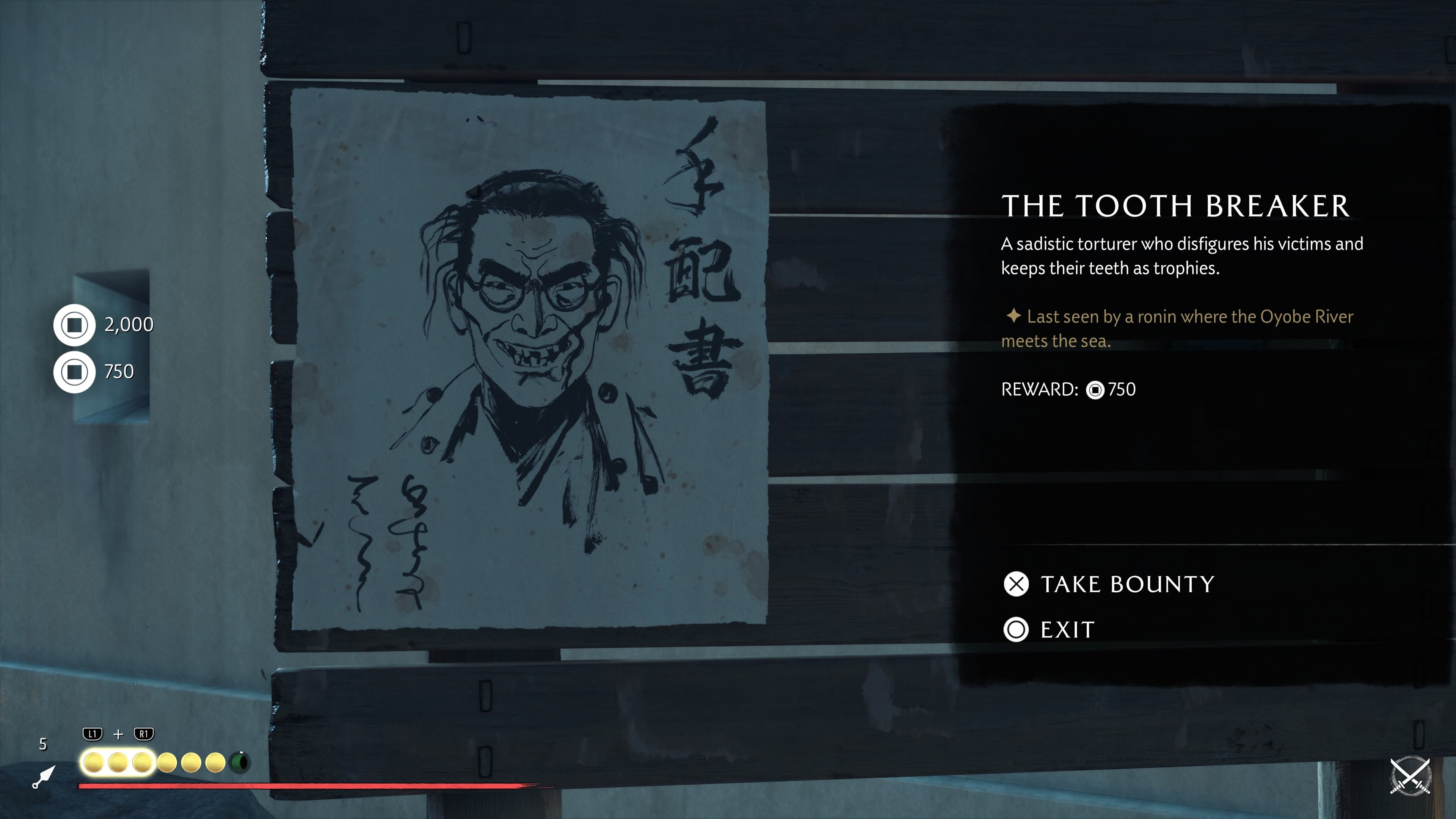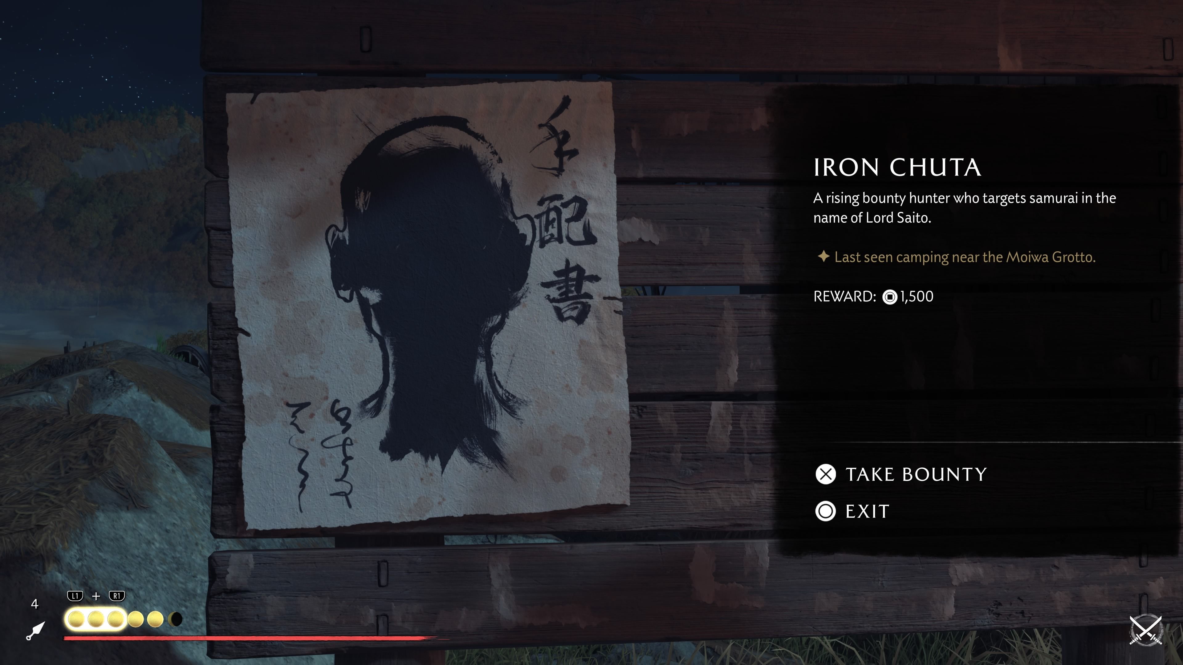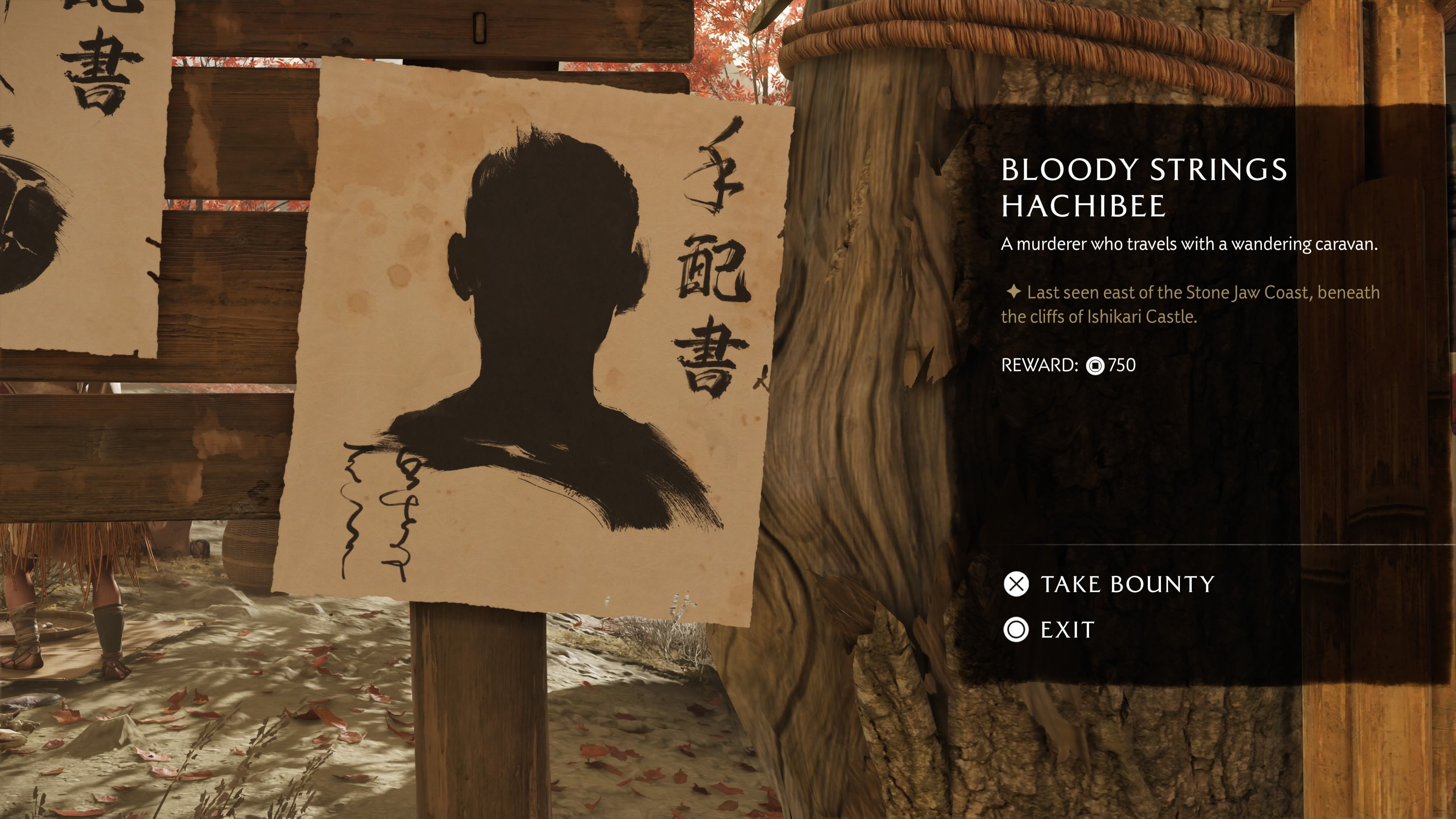 A new bounty has appeared at the Ishikari Market: eliminate Bloody Strings Hachibee. This dangerous criminal is hiding on the Stone Jaw Coast, north of the Ishikari Plain. Look for his camp directly above the letter “A” in “Coast” on your map. To make him appear, you’ll need to play the shamisen.