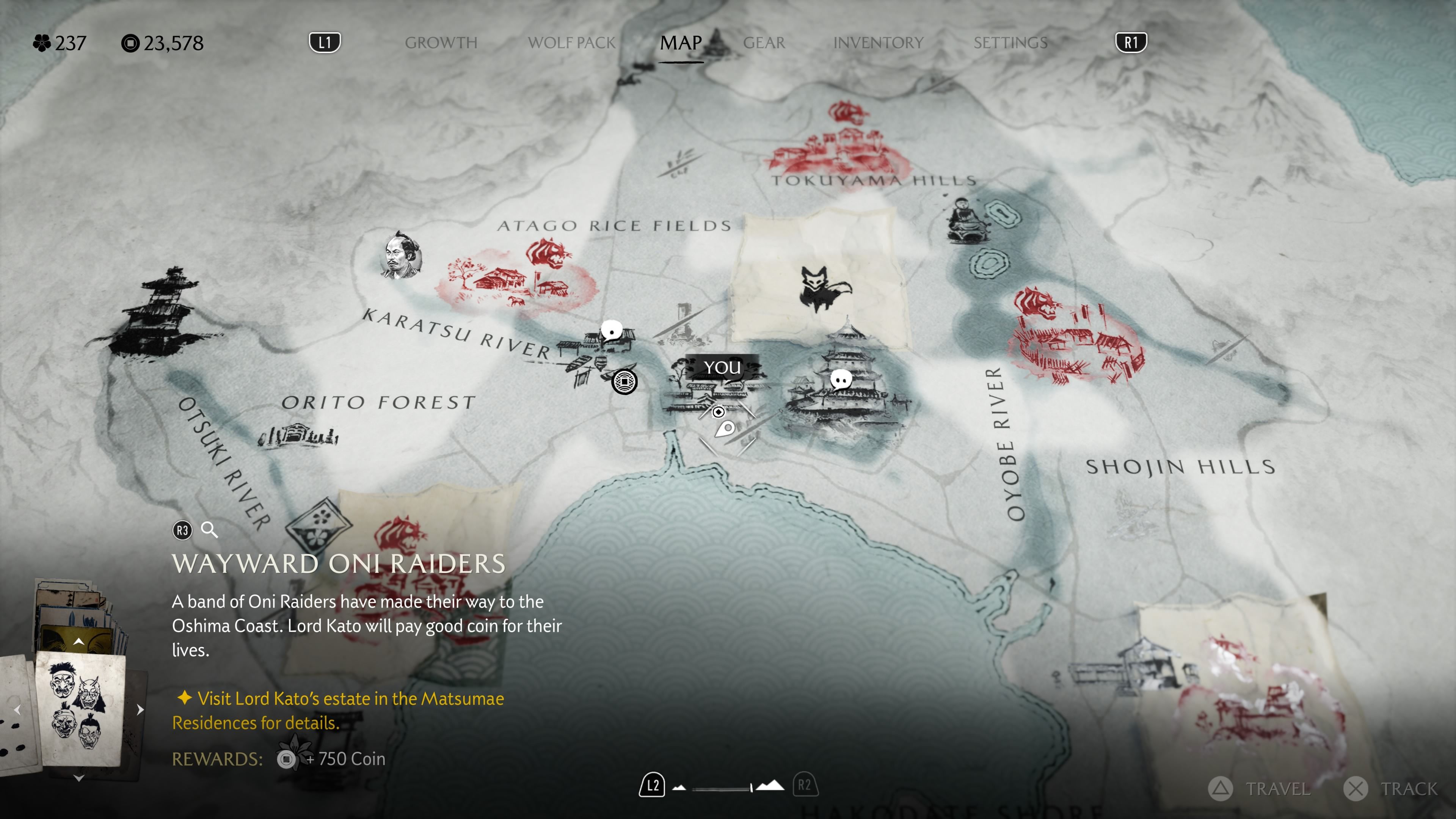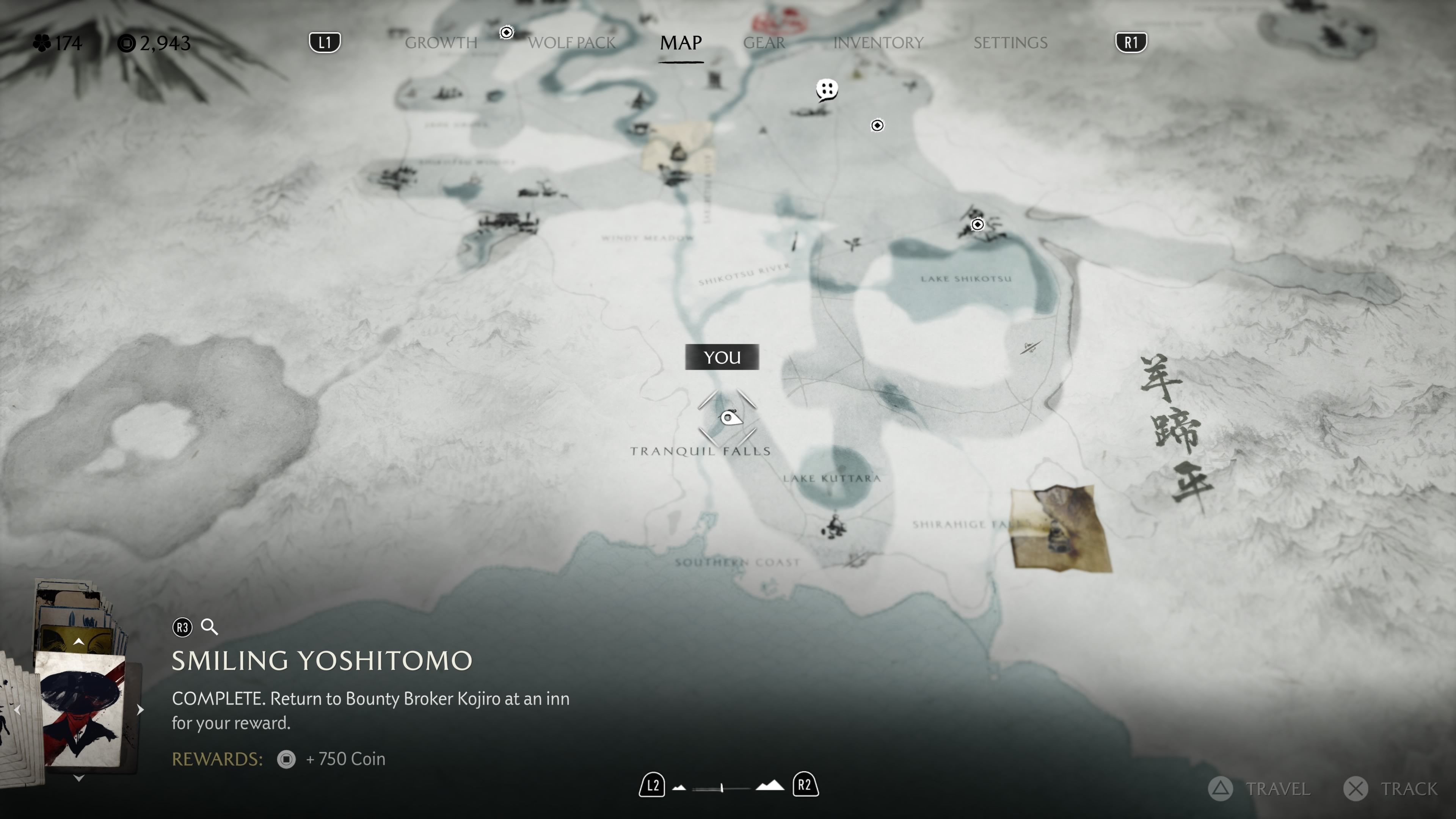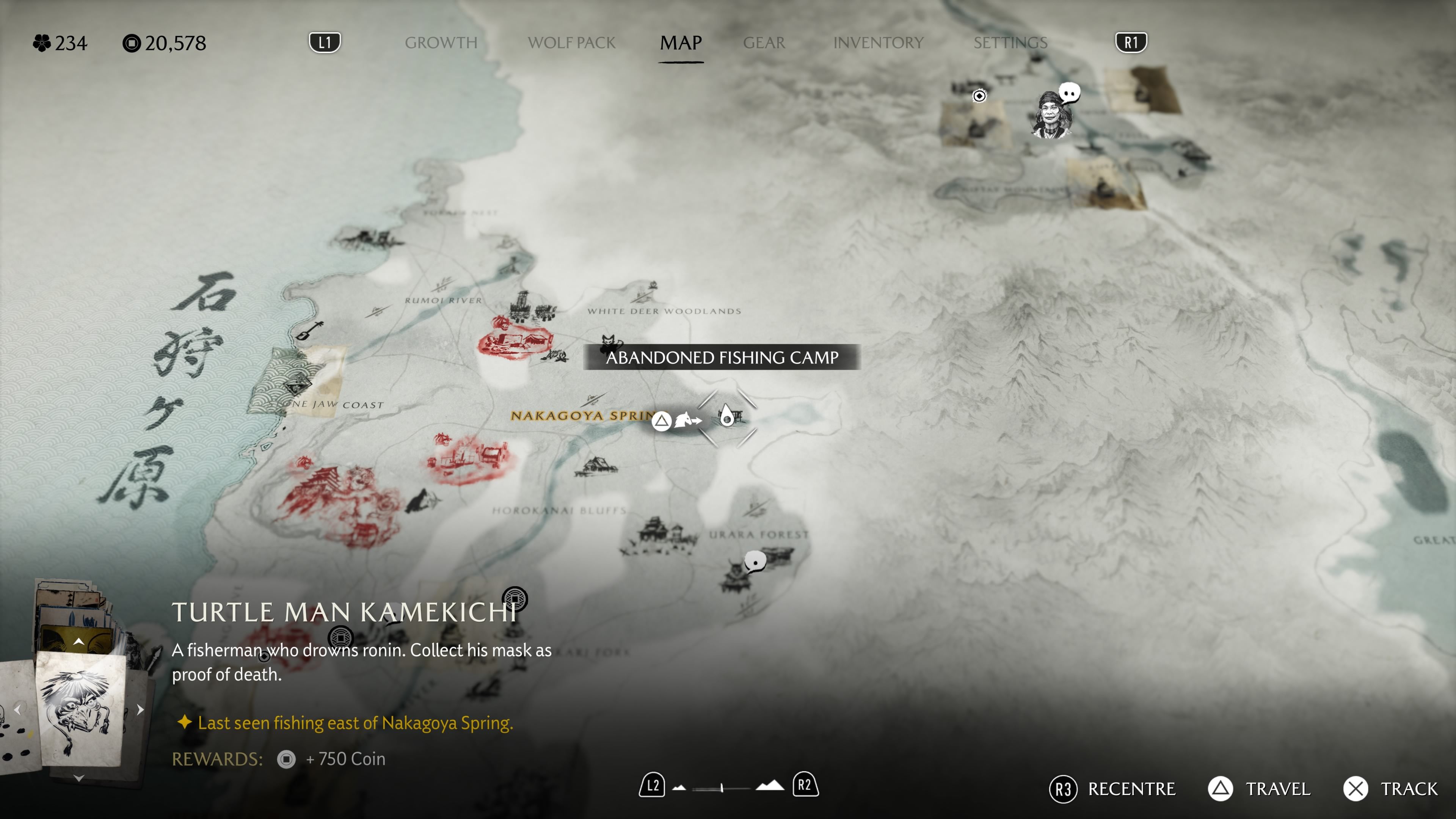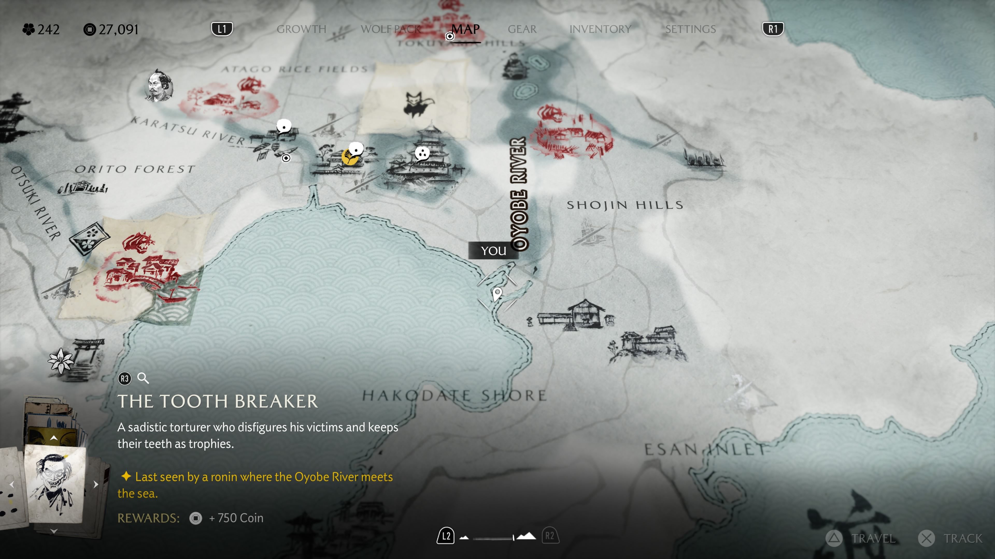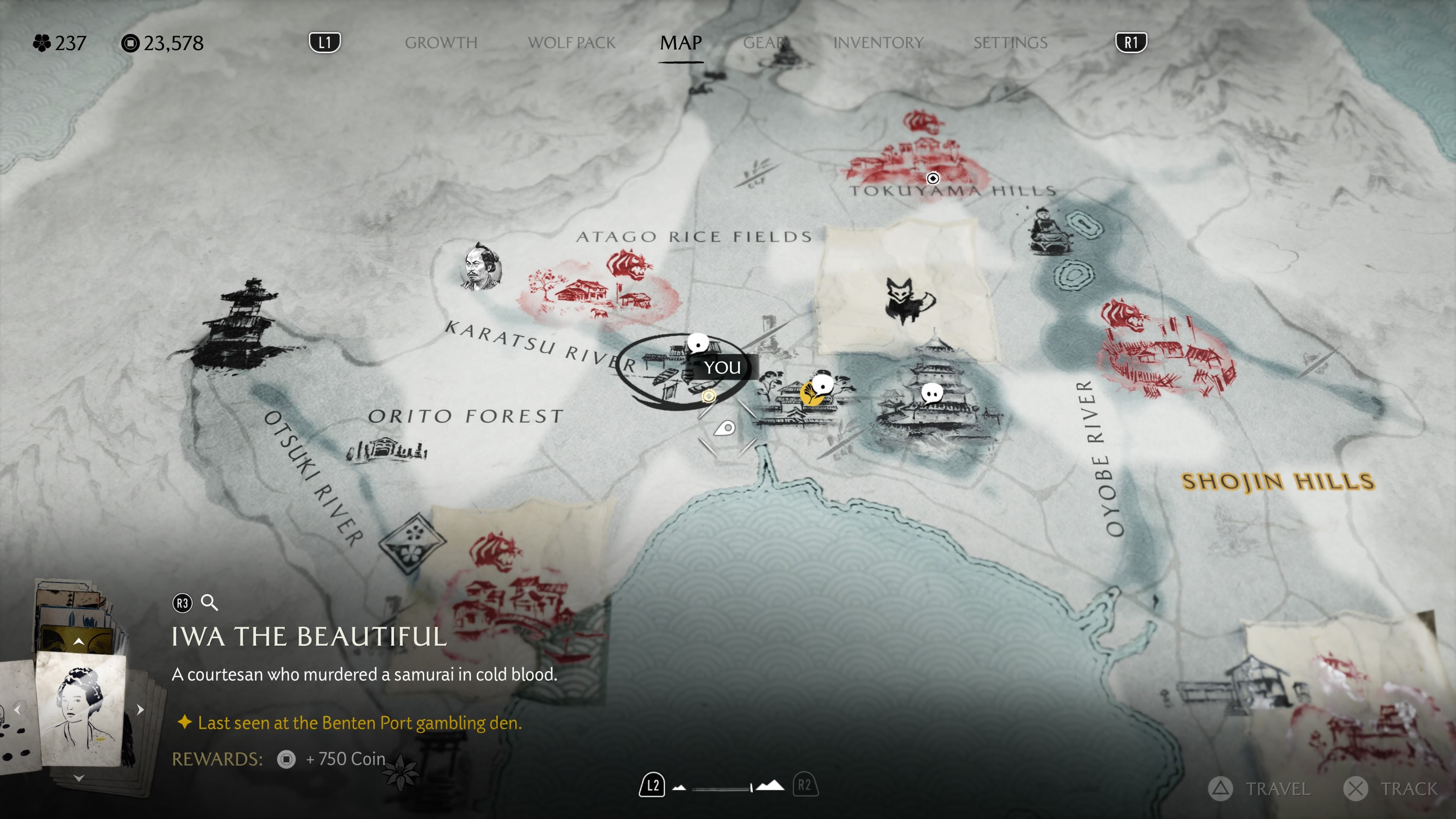 A new bounty has appeared at the Ishikari Market: eliminate Bloody Strings Hachibee. This dangerous criminal is hiding on the Stone Jaw Coast, north of the Ishikari Plain. Look for his camp directly above the letter “A” in “Coast” on your map. To make him appear, you’ll need to play the shamisen.