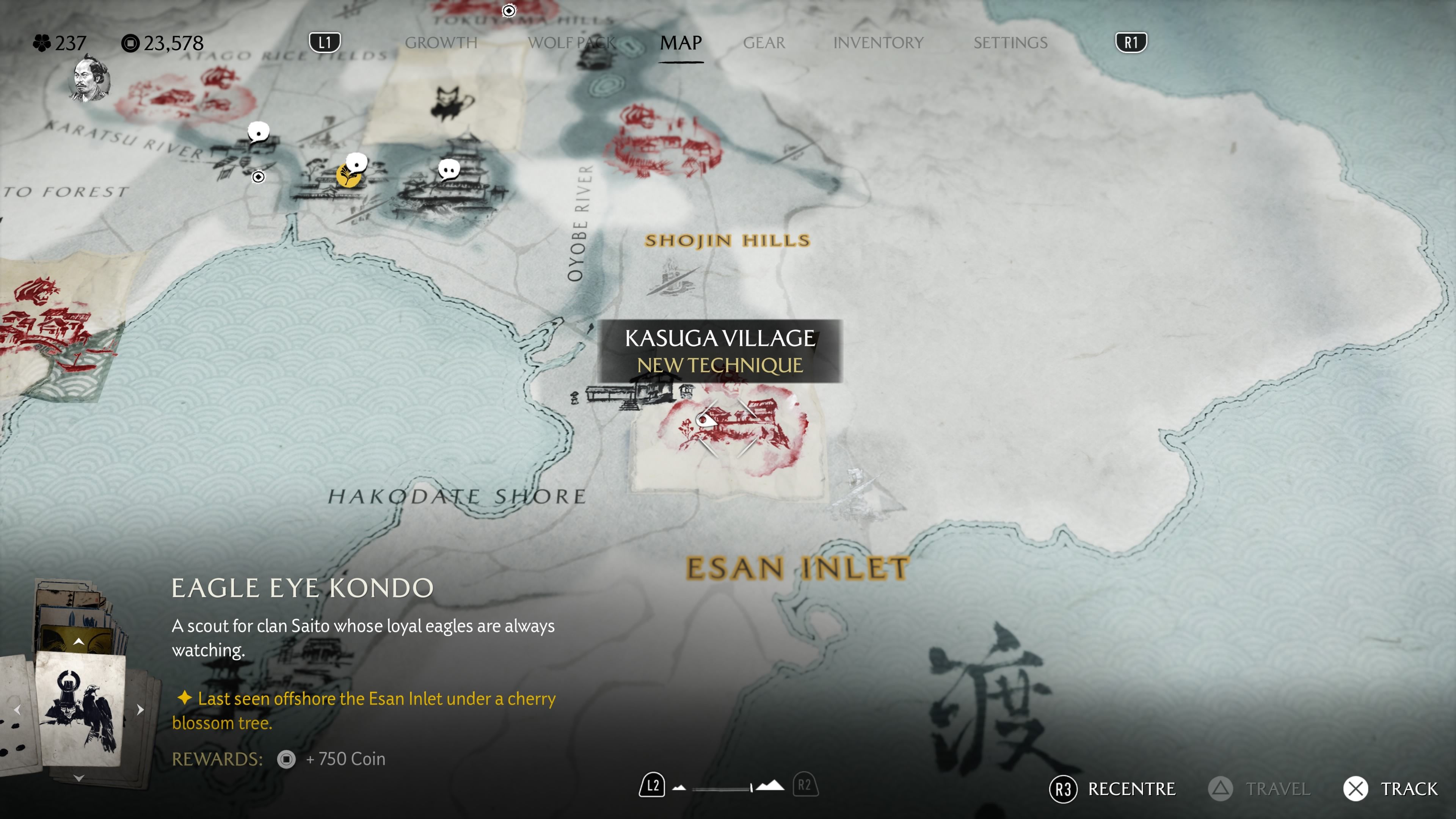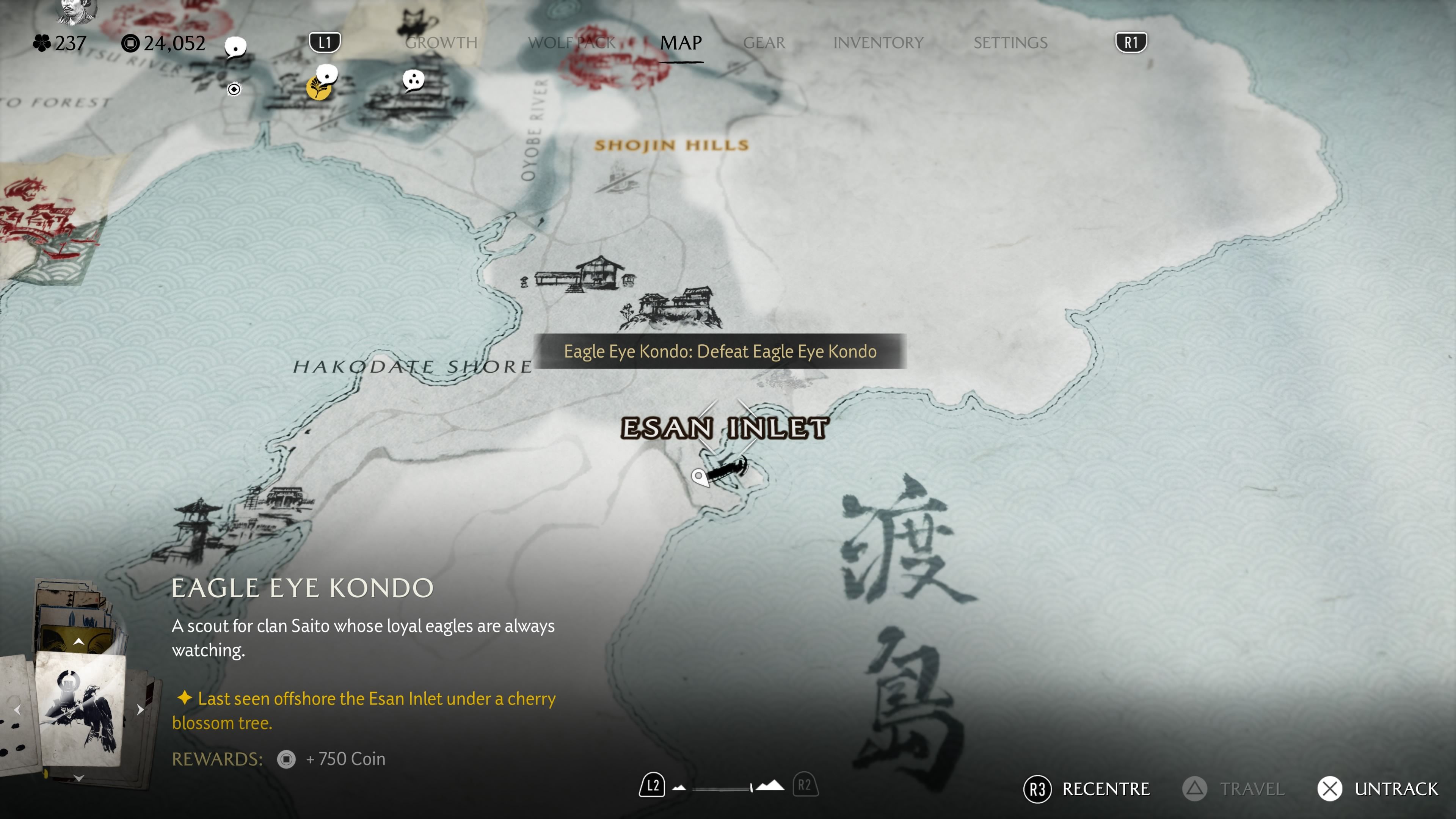 Okay, so I just checked the bounty board at Matsumae Castle and Eagle Eye Kondo’s up for grabs. You can find him over on the southeast side of Oshima Coast. Basically, head down the path towards Esan Inlet, then use that grapple point to get down near the beach. From there, just follow the shoreline around, and you’ll spot him hanging out near a cherry blossom tree. Easy peasy!