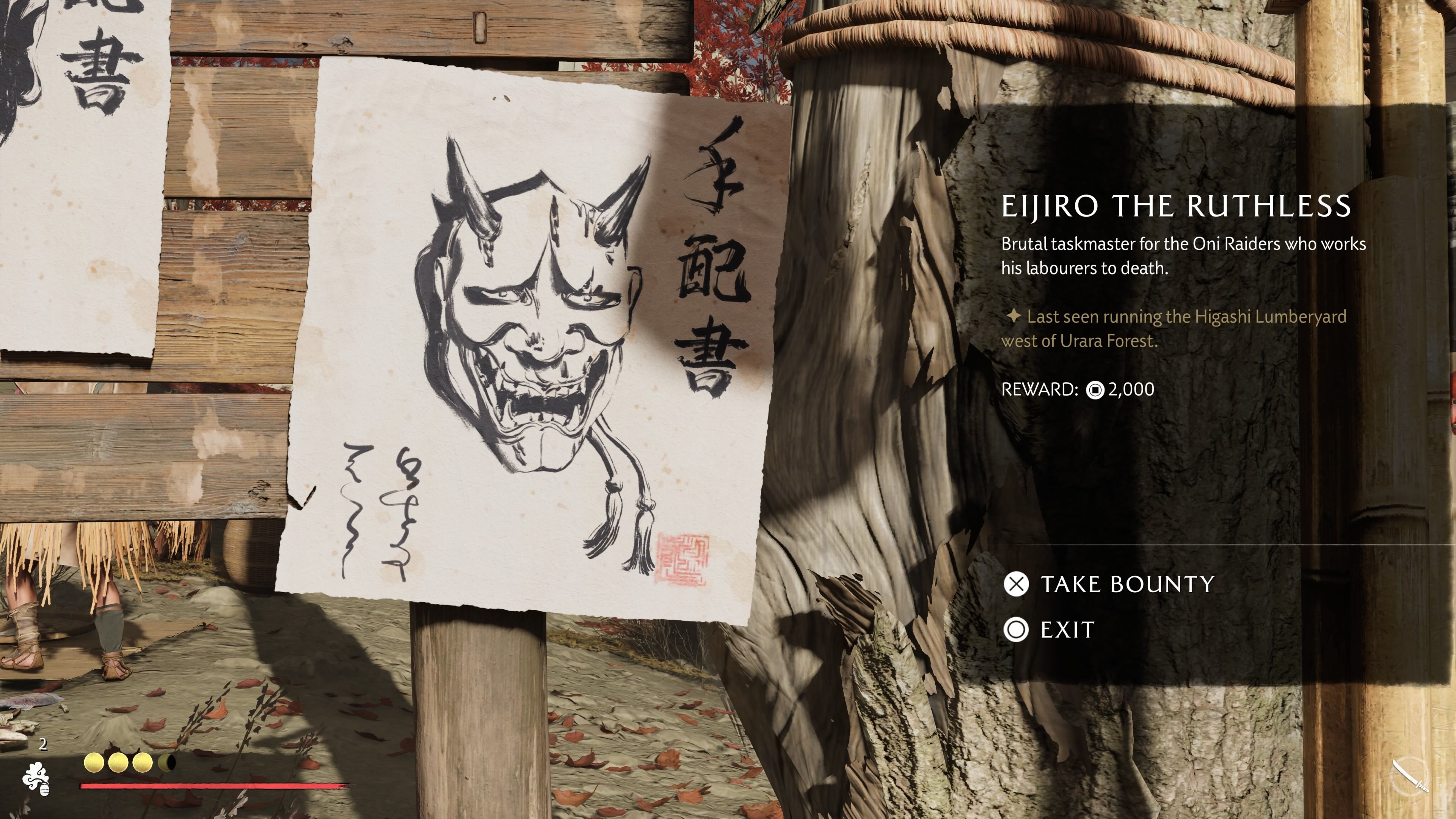 You can find Eijiro the Ruthless, who has a bounty posted in Ishikari Market, at the Higashi Lumberyard. It’s west of the Urara Forest, just to the left of the letter ‘U’ in ‘Urara’ on your map. He’s the boss you fight after defeating everyone at the Yotei Six Camp.