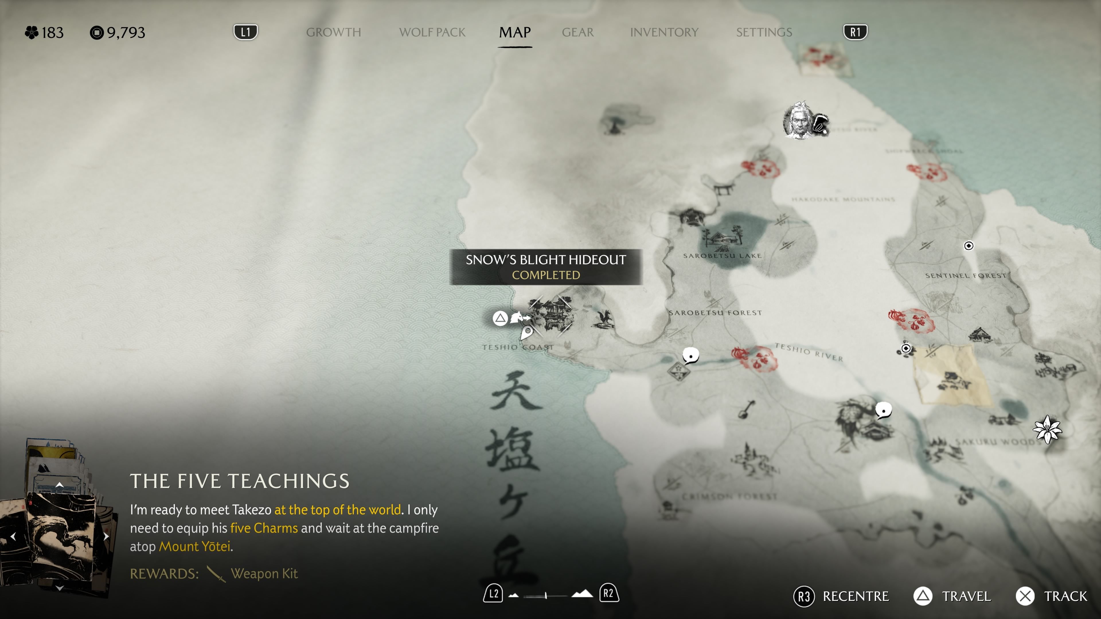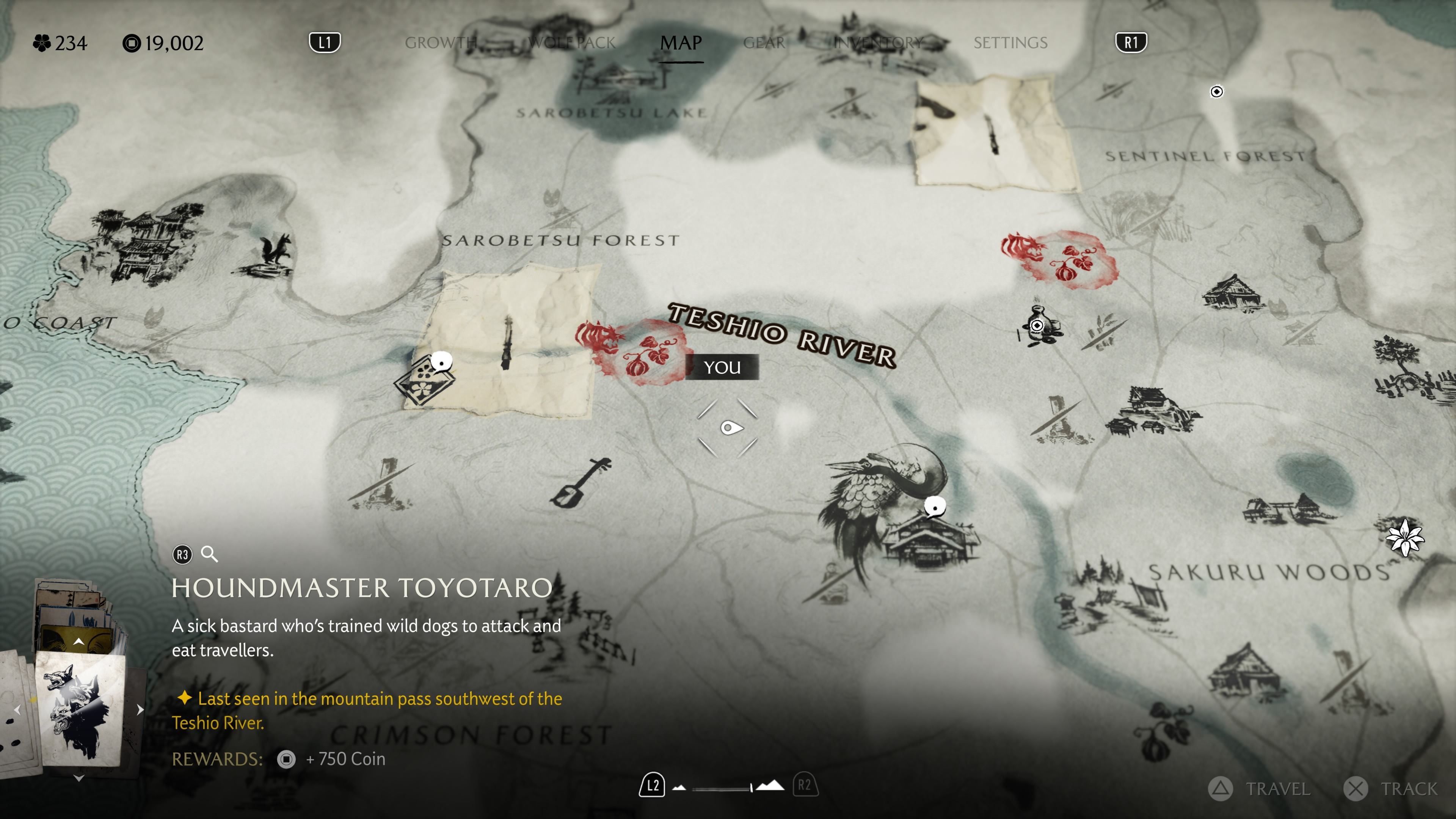 At the Red Crane Inn, you’ll find a wanted poster offering a reward for the elimination of Houndmaster Toyotaro. He can be found traveling northwest from the inn, along the path towards the Teshio River – look for him near the letter ‘H’ in ‘Teshio’ on your map. He’s set up camp with a few cages in that area.