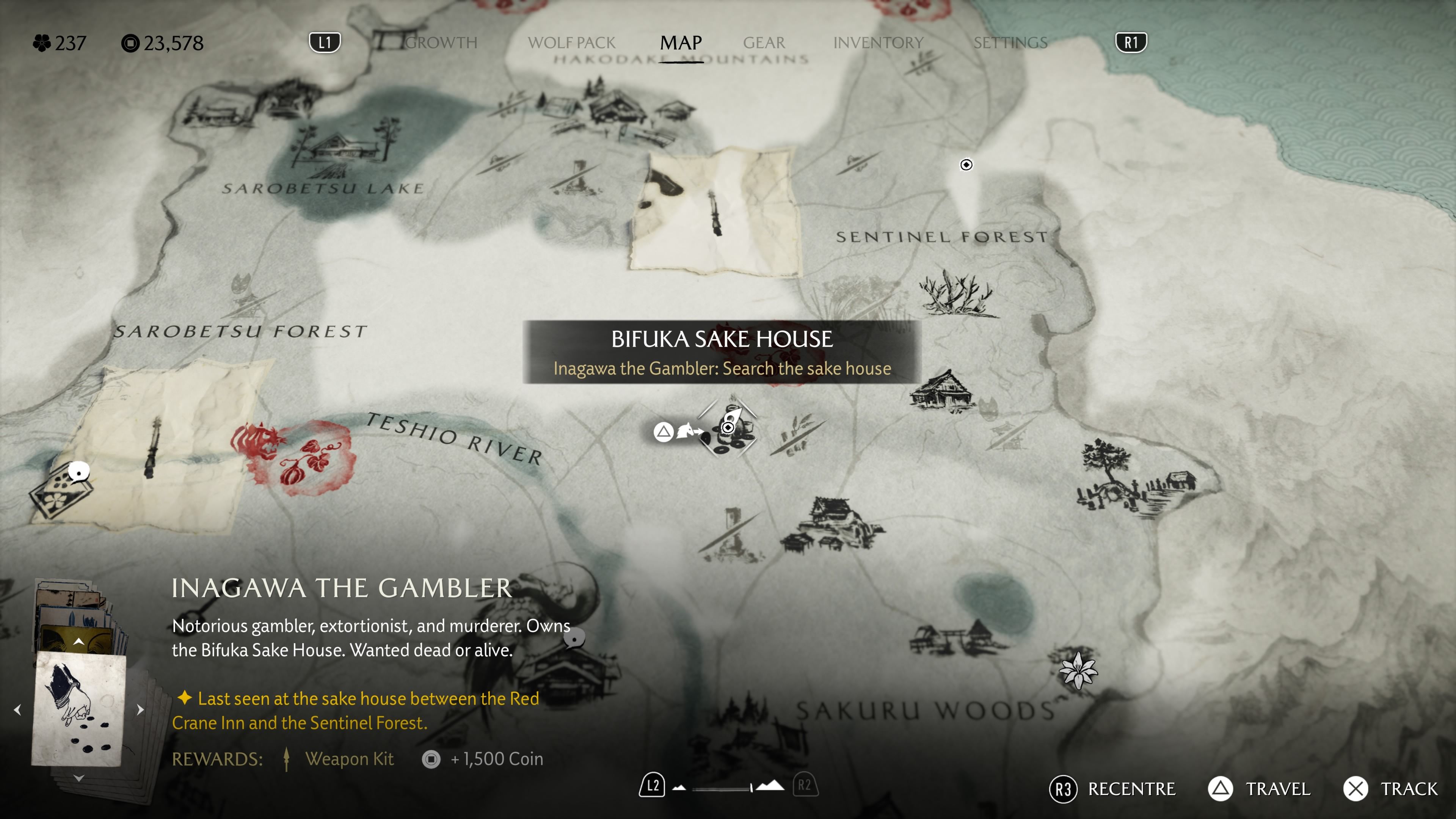 Once you’ve finished dealing with the previous bounties around Teshio Ridge, return to the Red Crane Inn and talk to Kojiro at the bounty board. He’ll give you a new bounty: Inagawa the Gambler. You can find Inagawa at the Bifuka Sake House, which is north of the Sakuru Woods and east of the Teshio River. He’s in the back right corner and likes to play Zeni Hajiki. If you beat him (he cheats, so it shouldn’t be too hard!), leave the Sake House and a Settler will come talk to you to move the quest forward.