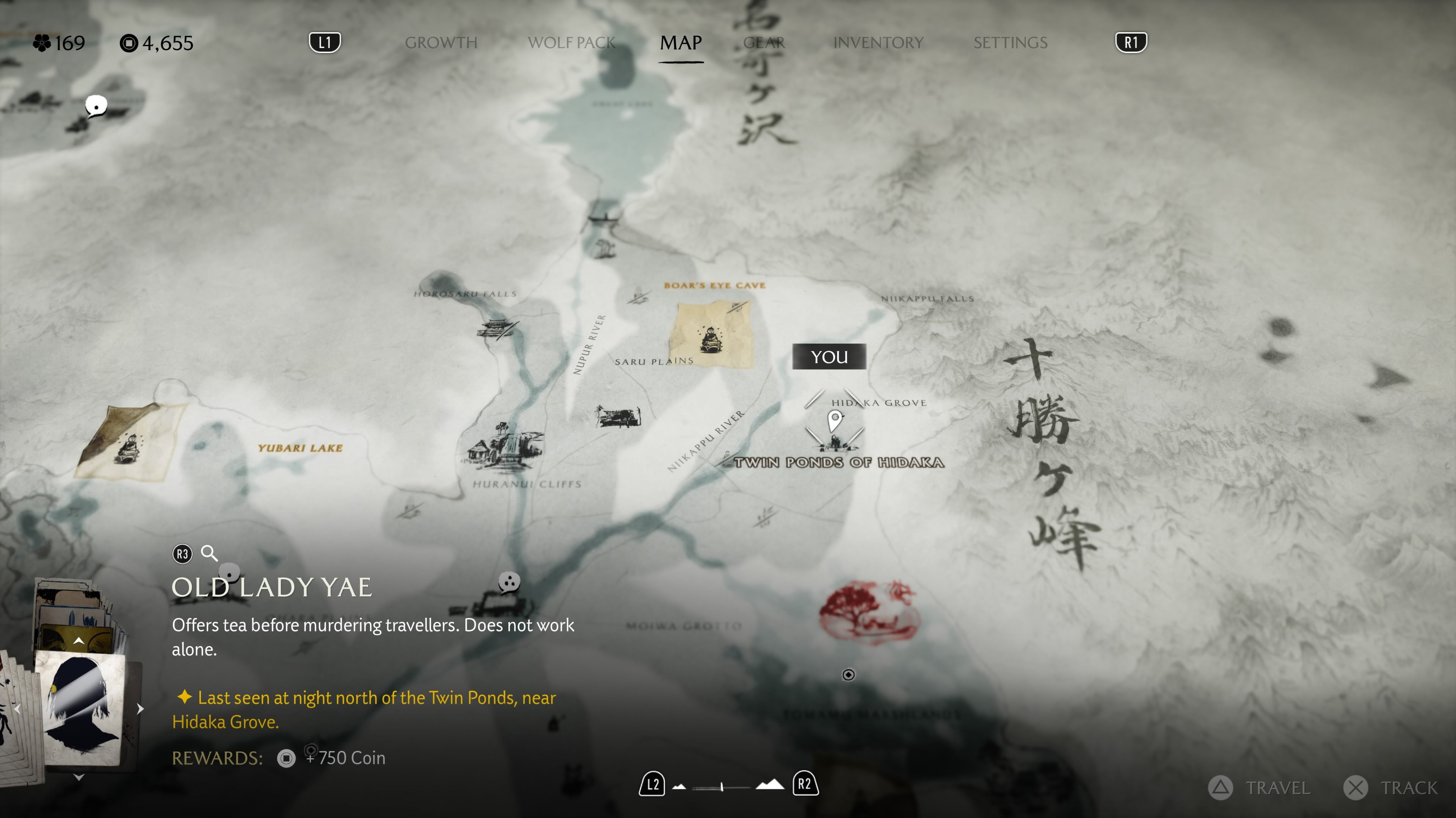 You can find Old Lady Yae’s bounty notice at the bounty board inside Huranui’s Rest Inn. She only appears at night, so head north of the Twin Ponds of Hidaka after dark – they’re located upriver from the Niikappu River. Look for the bounty north of Arata’s Pond.