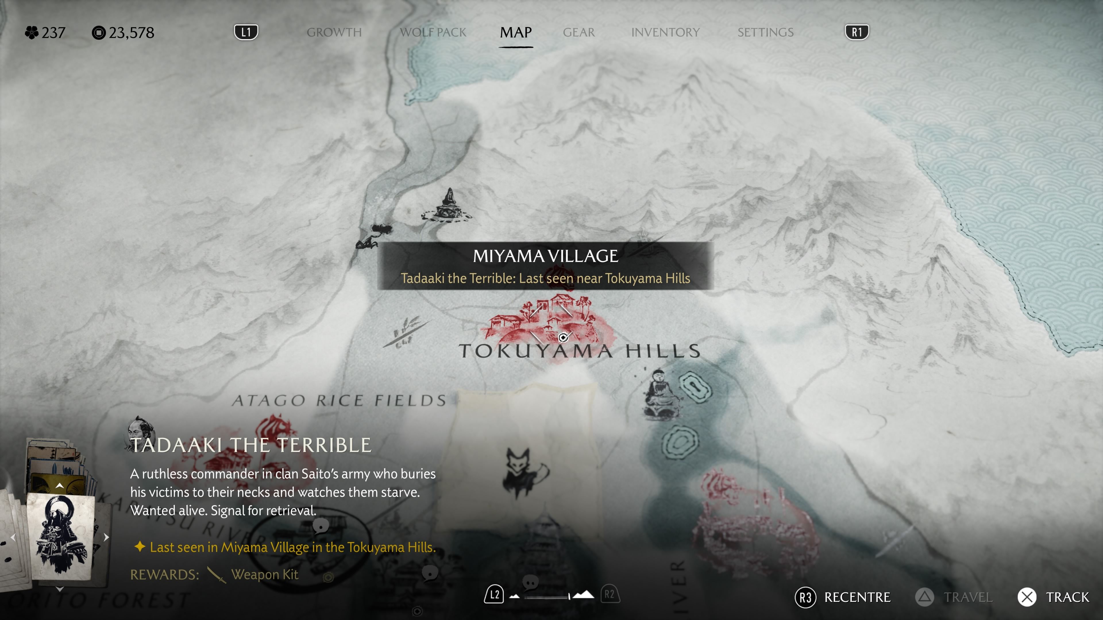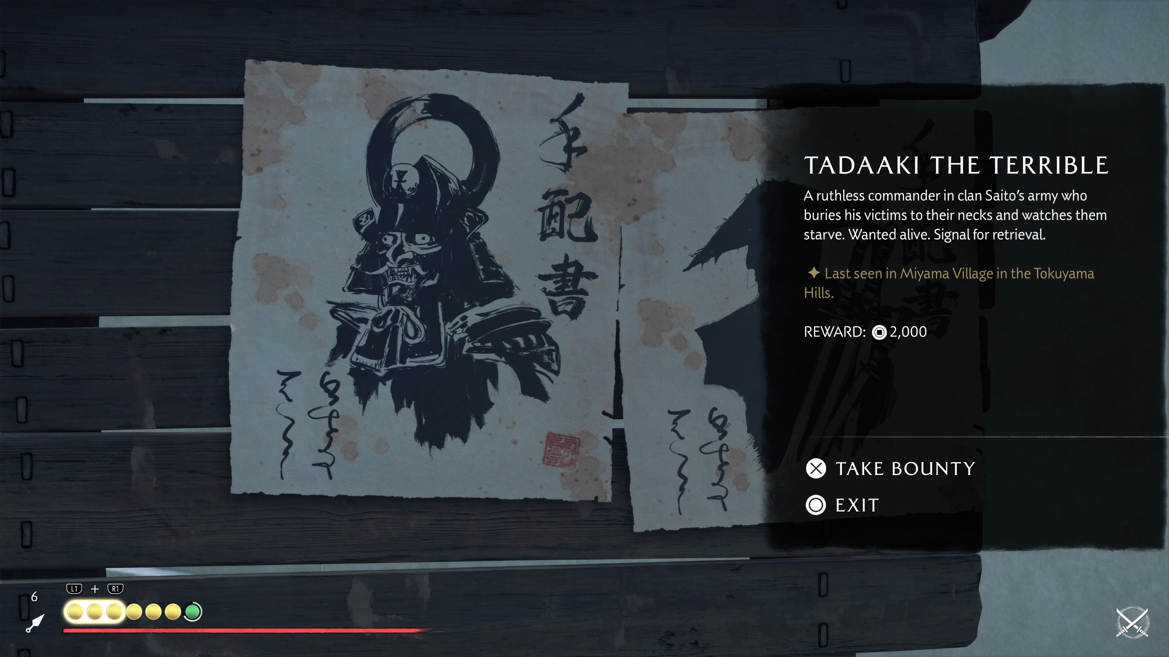 You can find Tadaaki the Terrible in Miyama Village, which is in the Tokuama Hills. This location is one of the Yotei Six Camps. Defeat all the enemies there to unlock a battle with the bounty target, Tadaaki.