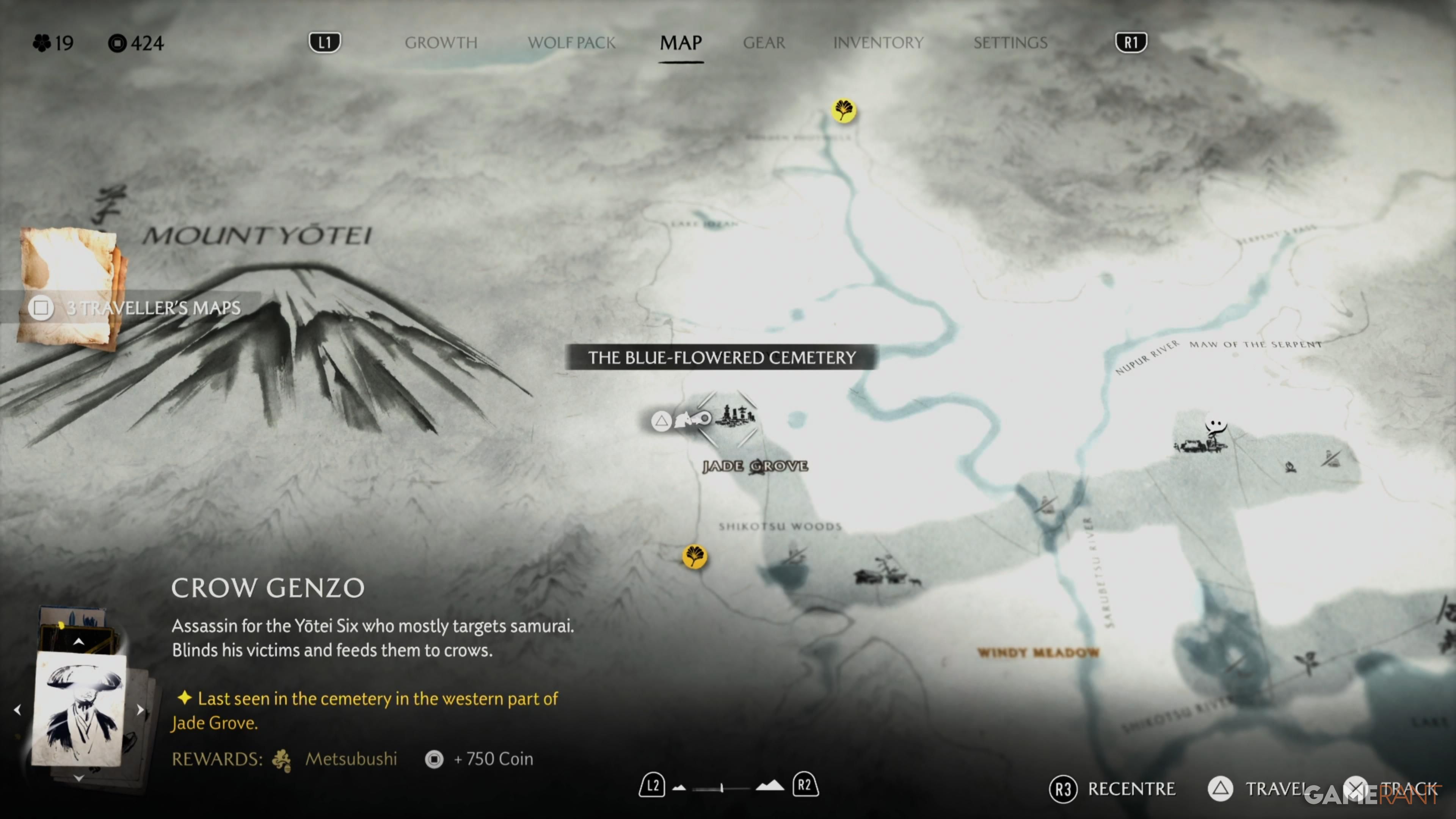 You can find the bounty poster for Crow Genzo at the Yotei’s Shadow Inn in the Yotei Grasslands. Once you accept the bounty, travel to The Blue-Flowered Cemetery. It’s located north of Jade Grove, which itself is in the northwest part of the Yotei Grasslands, just above Shikotsu Woods. You’ll find Crow Genzo near the center of the cemetery, at the Altar of Reflection.