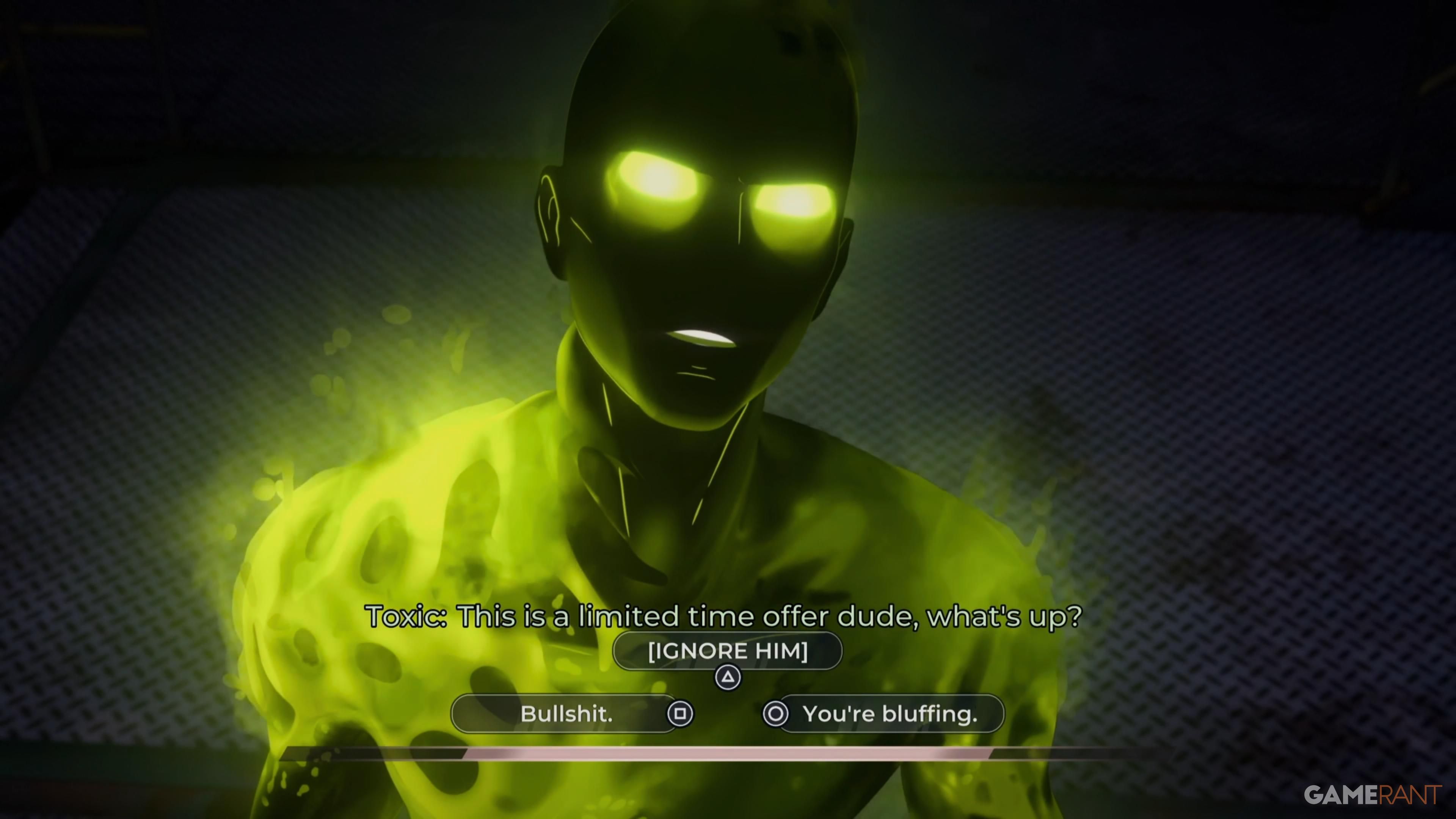 Next, you’ll encounter another sequence of quick-time events. During this, you’ll get a chance to respond when Toxic attempts to explain why rerouting the pulse power won’t succeed.