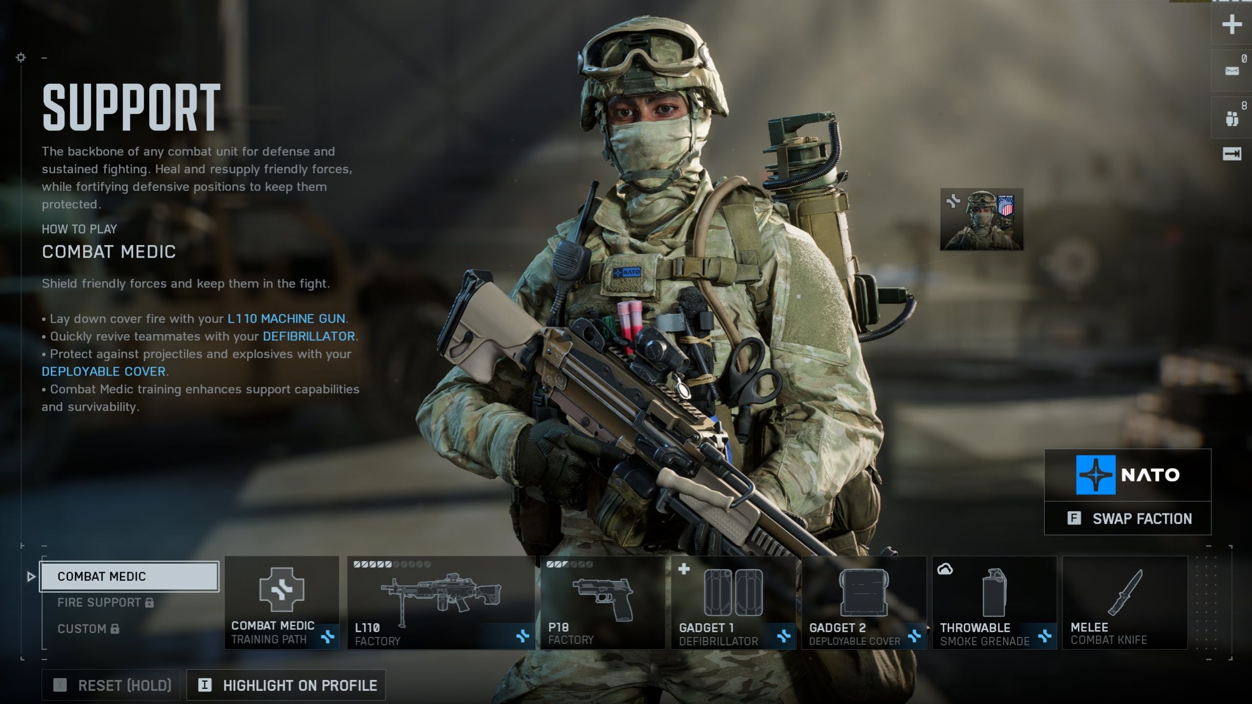 | “Combat Medic” Training Perks | Defense-Focused | Defense gadgets have an increased 25% resupply rate, GPDIS intercepts two more projectiles, MP-APS tracking duration increases by 5 seconds, and deployable cover takes 10% less damage. |