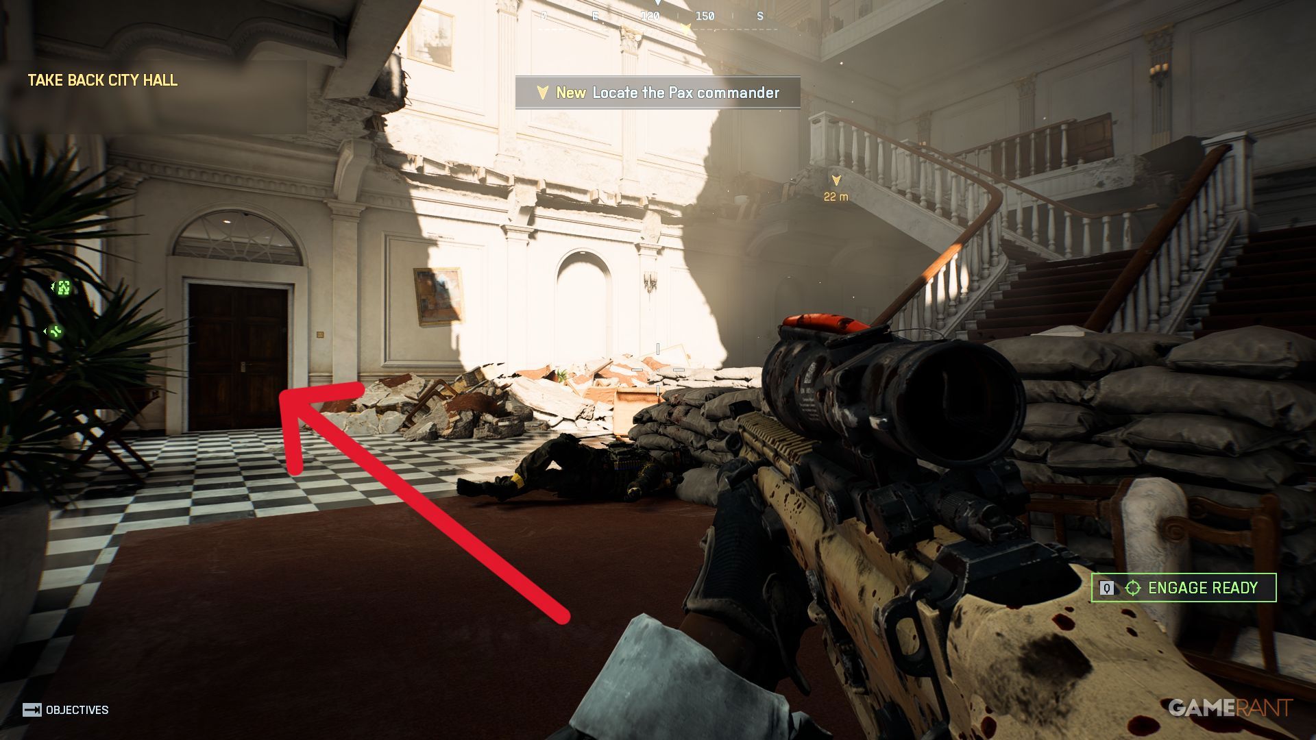 Once the squad secures the beach, they’ll get out of the armored vehicle and move inland. This will start with a major firefight against the Pax Armata, who are positioned around several buildings.