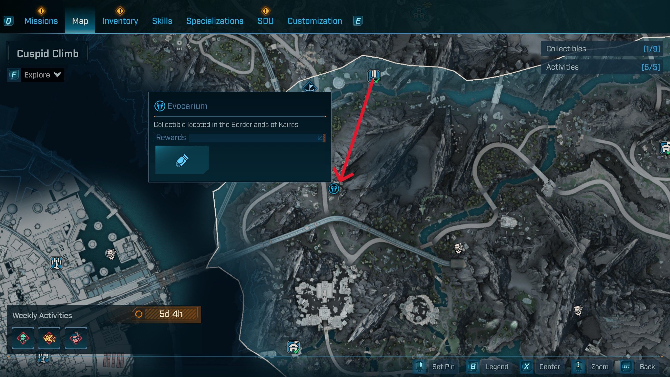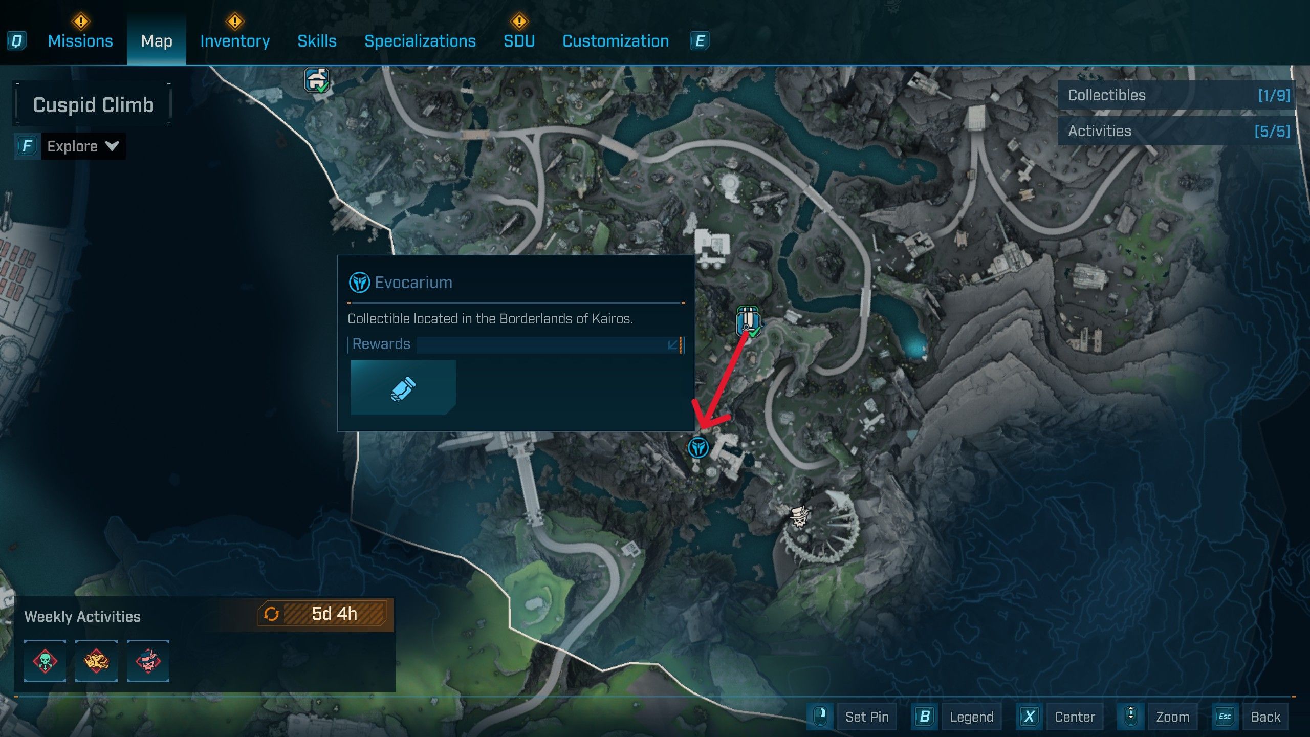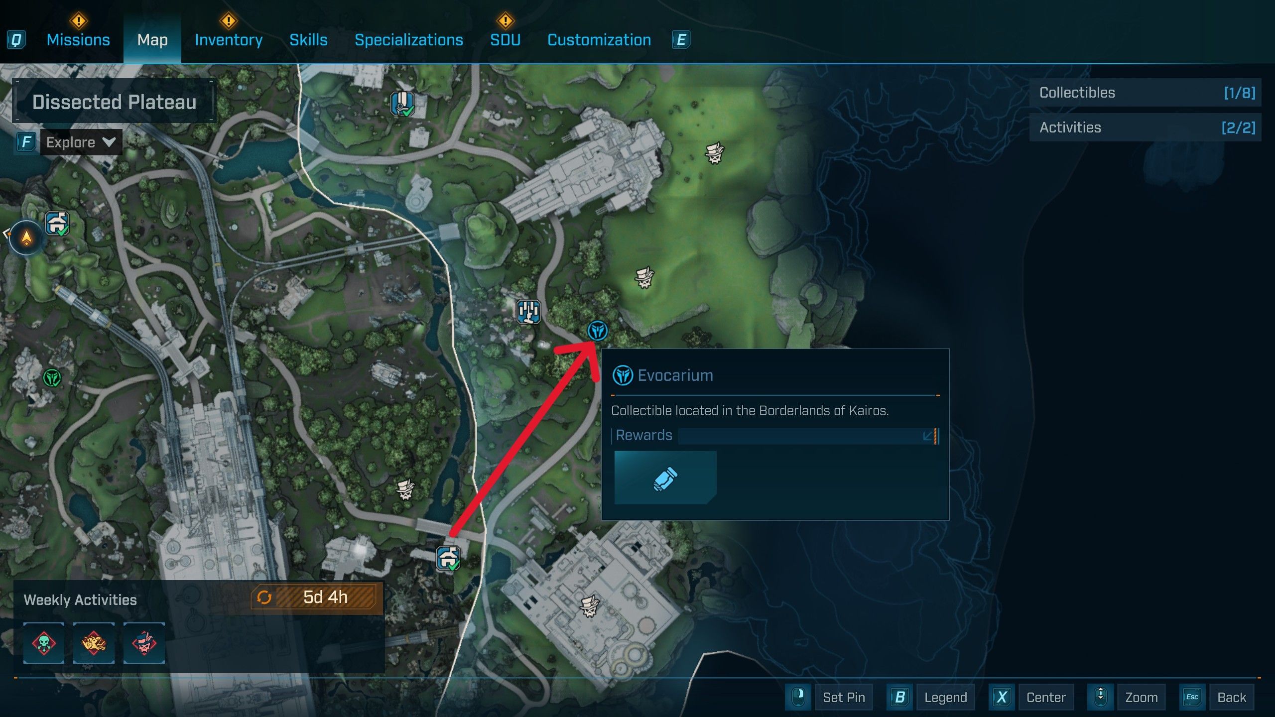 You’ll find the Evocarium in Lopside, Carcadia Burn, near a Kratch hive. To start collecting orbs, turn right from the Evocarium and use a double jump to reach a rocky structure – the first orb is there. Then, jump from that high point and glide east to find another orb on an old jet engine. Finally, glide northwest from the jet engine towards a building, and jump onto its roof to get the last orb.