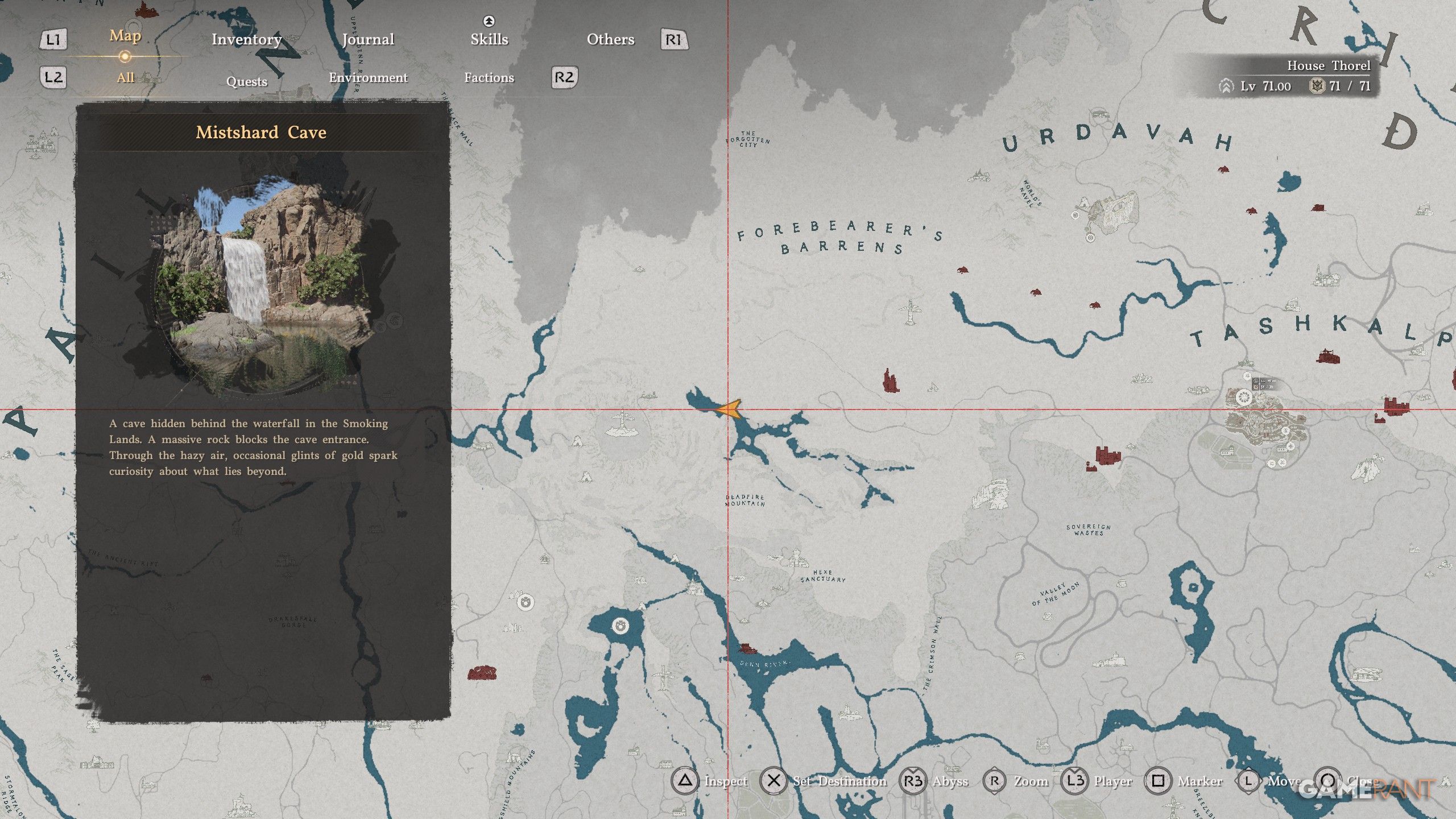 - Use Stab (R1+Triangle) when facing the waterfall to enter inside, where your path is then blocked by a rock.