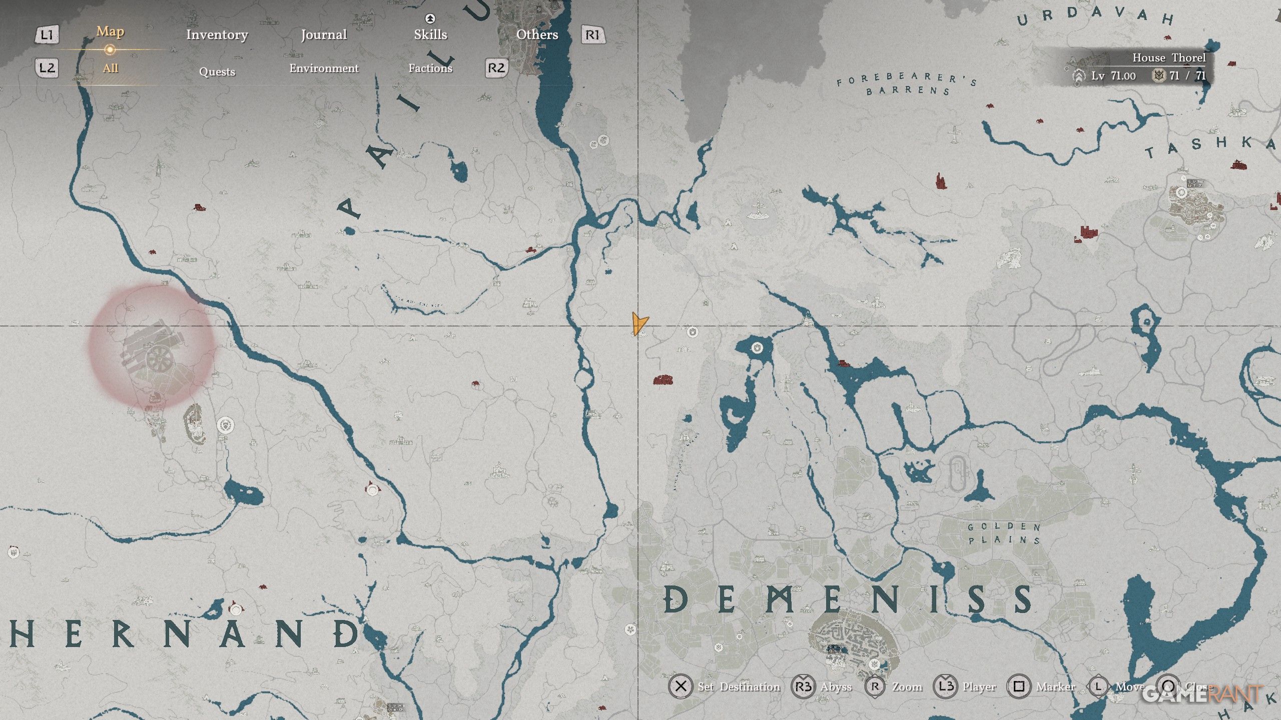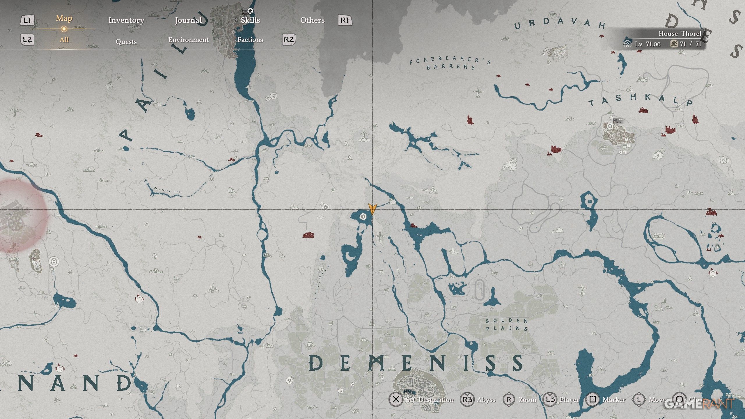 - Head north of the “D” in “Demeniss” on the map (also on the map image above).