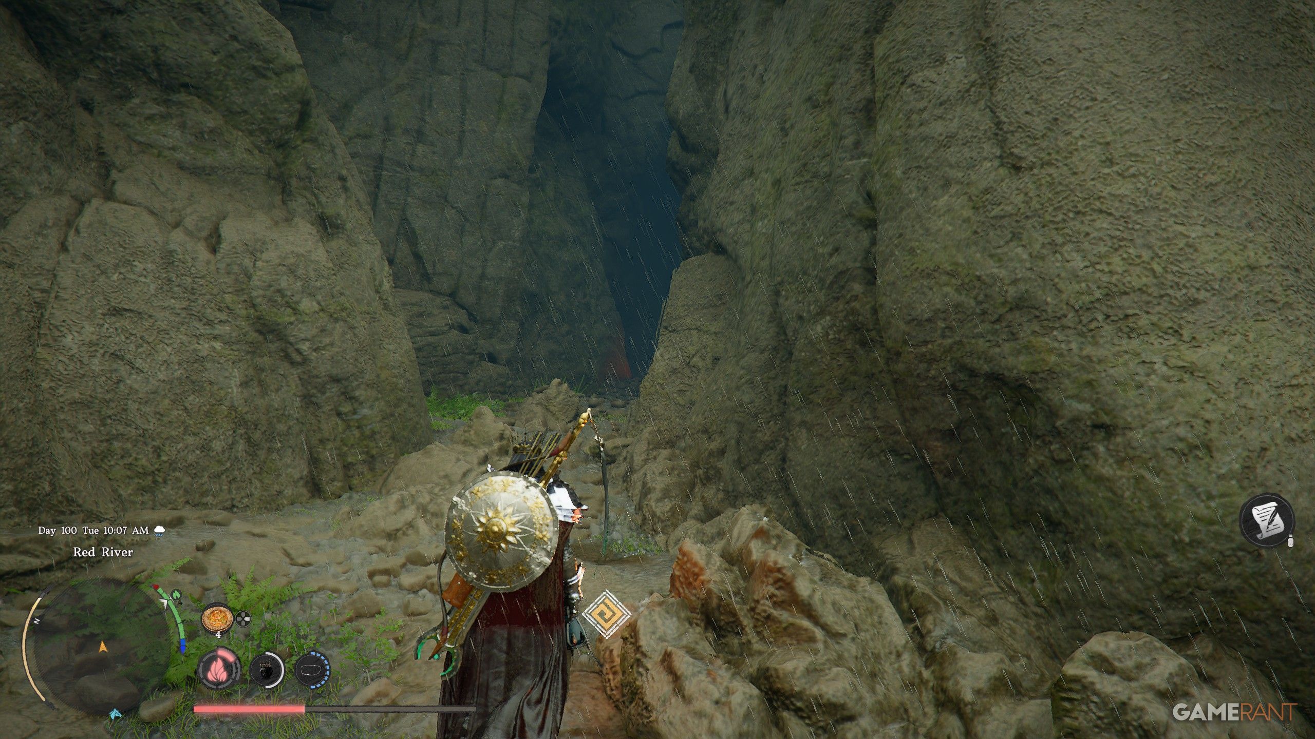 - At the bottom of the Red River, you can head east through a cave, where on the left you’ll find a blocked path.