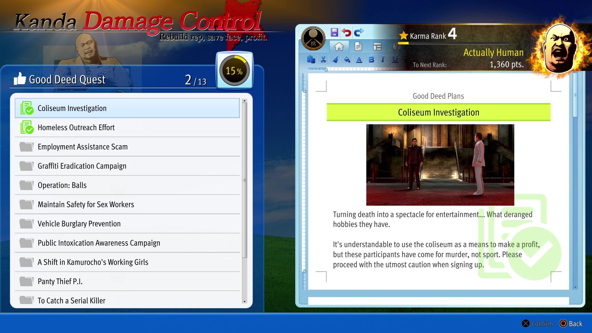 | #2 Homeless Outreach Effort | Finish the Coliseum Investigation and return to Zenba. Proceed to the Hotel District. | 500 Karma Points and 300,000 Yen. |