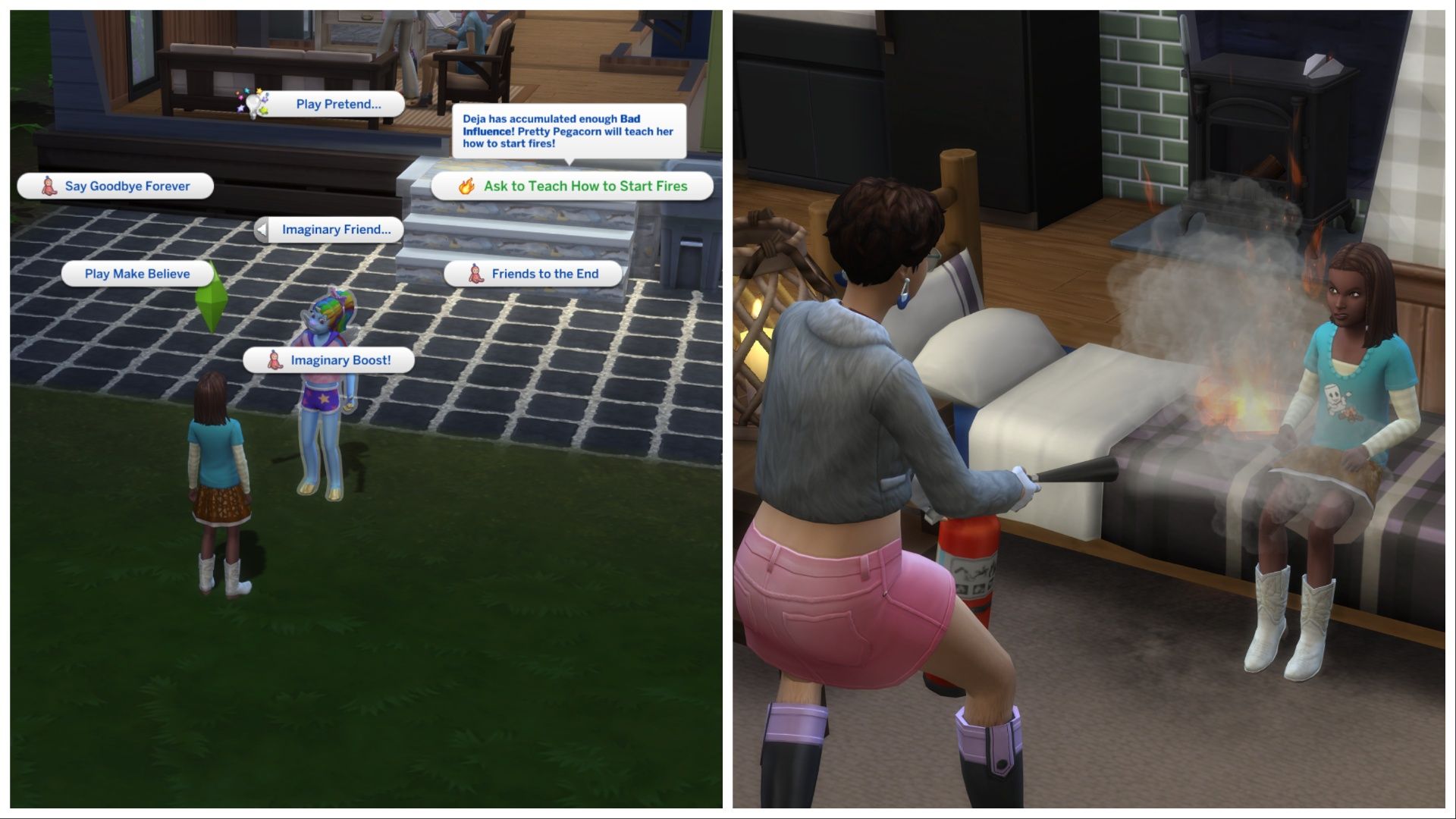 If Sims follow Pretty Pegacorn’s guidance, they can learn how to start fires. This allows them to ignite most furniture and objects in the game. Learning this skill also gives them the temporary “Budding Evil” trait. If they continue down this path, they can develop the permanent Evil trait when they become Young Adults.