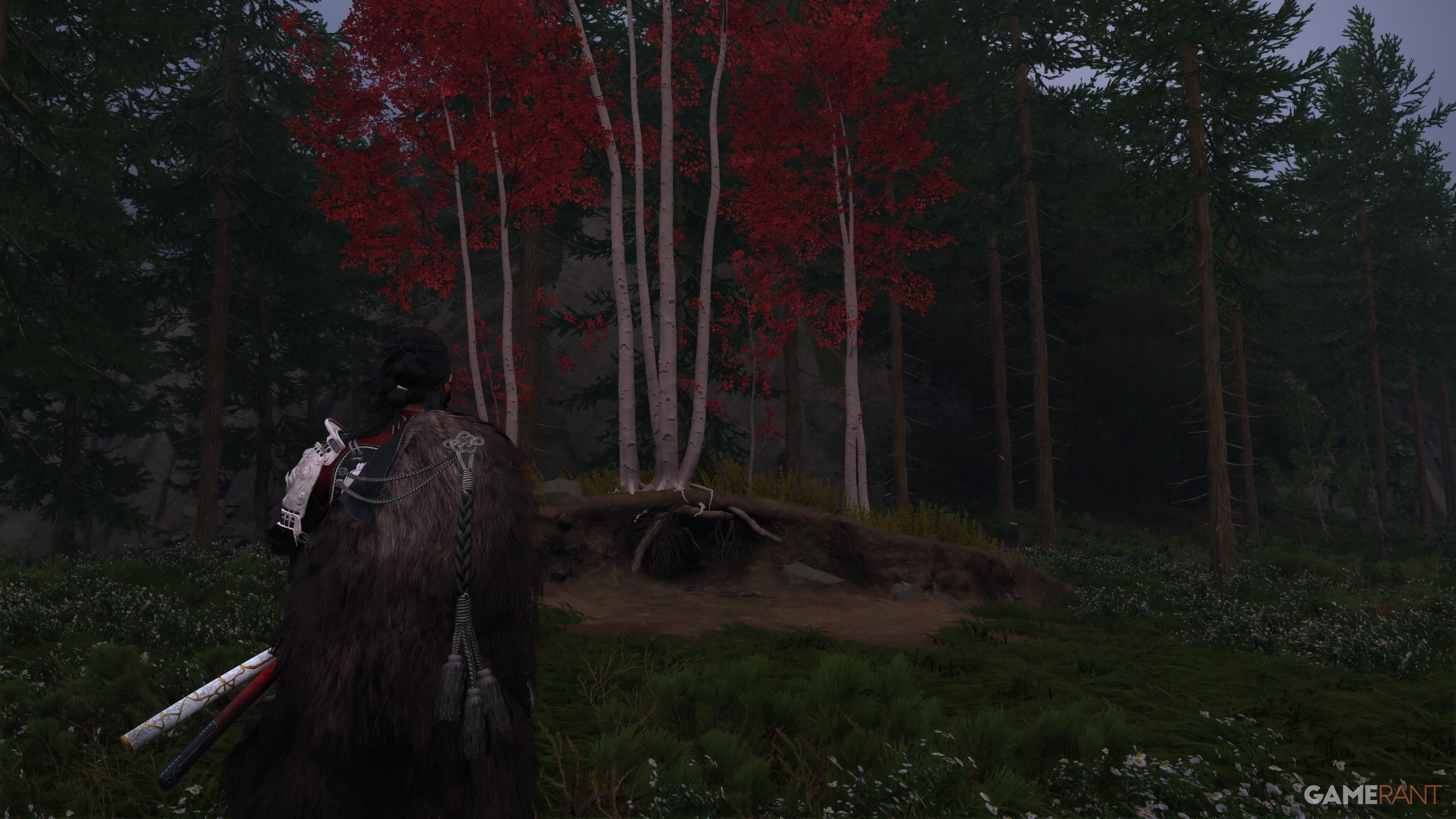 Charm of Assassin’s Resolve | This red tree is located north of Tranquil Falls, towards the left edge of the map. Follow the fox here to the Inari Shrine. |