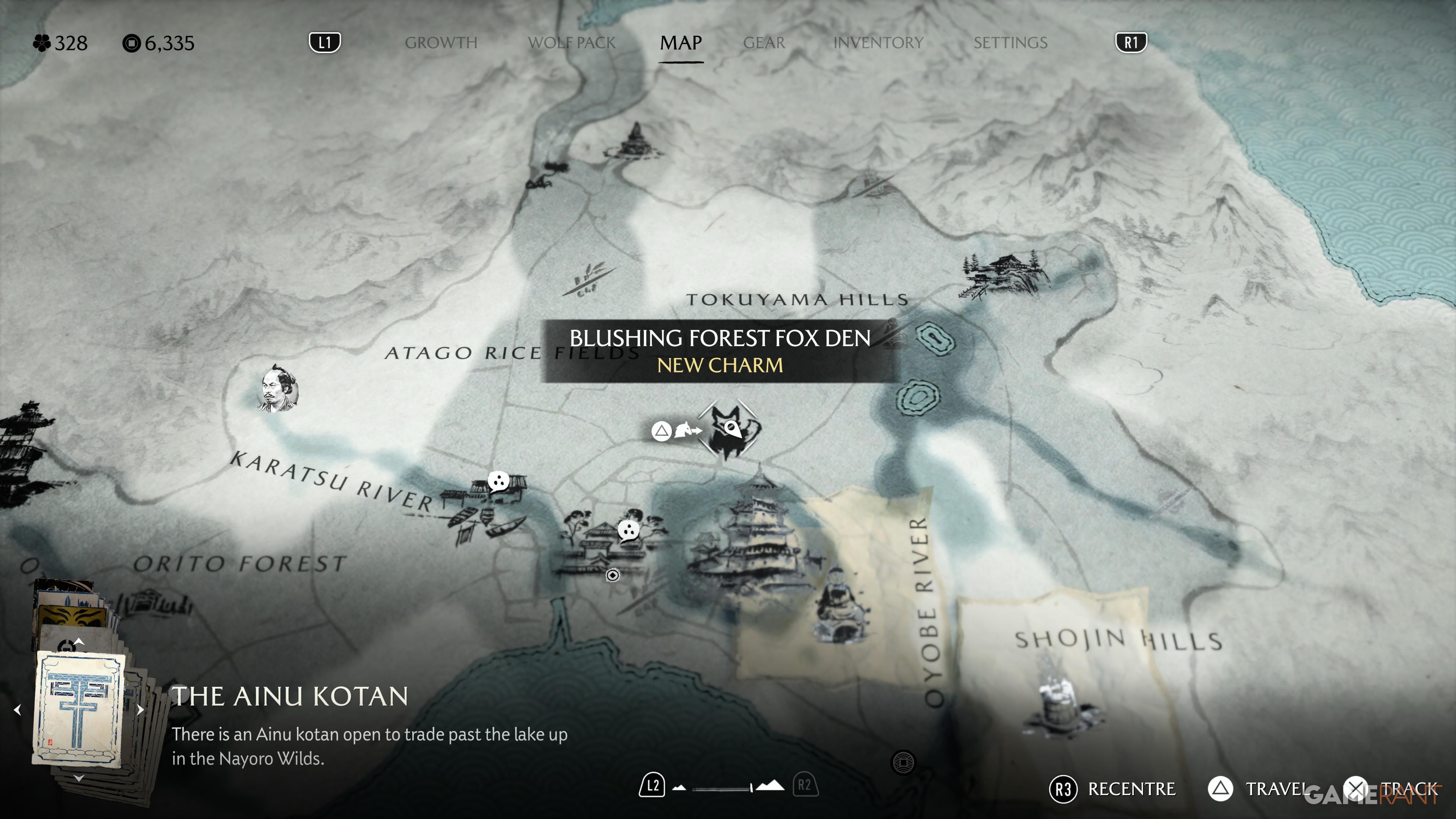 Charm of Generous Opponents | This is to the northeast of Kankan Creek. When you follow the fox, be careful, as it will take you over deer traps that you can fall into. At the end, talk to the Ainu to get the charm. There is no shrine here. |