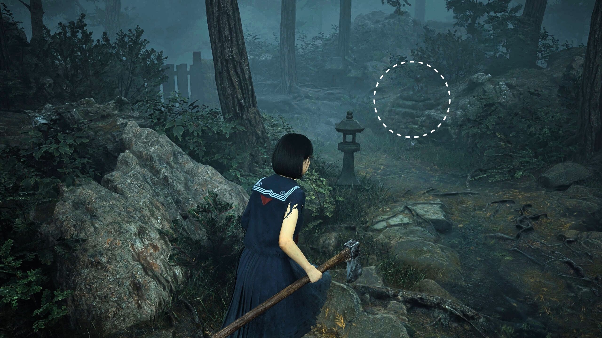 As you continue walking past the houses, you’ll come to a courtyard belonging to a home that has a knife stuck in a tree. Finding this scene will allow you to obtain the Dad’s Old Kitchen Knife, which is needed as an offering for the fifth Jizo Statue.