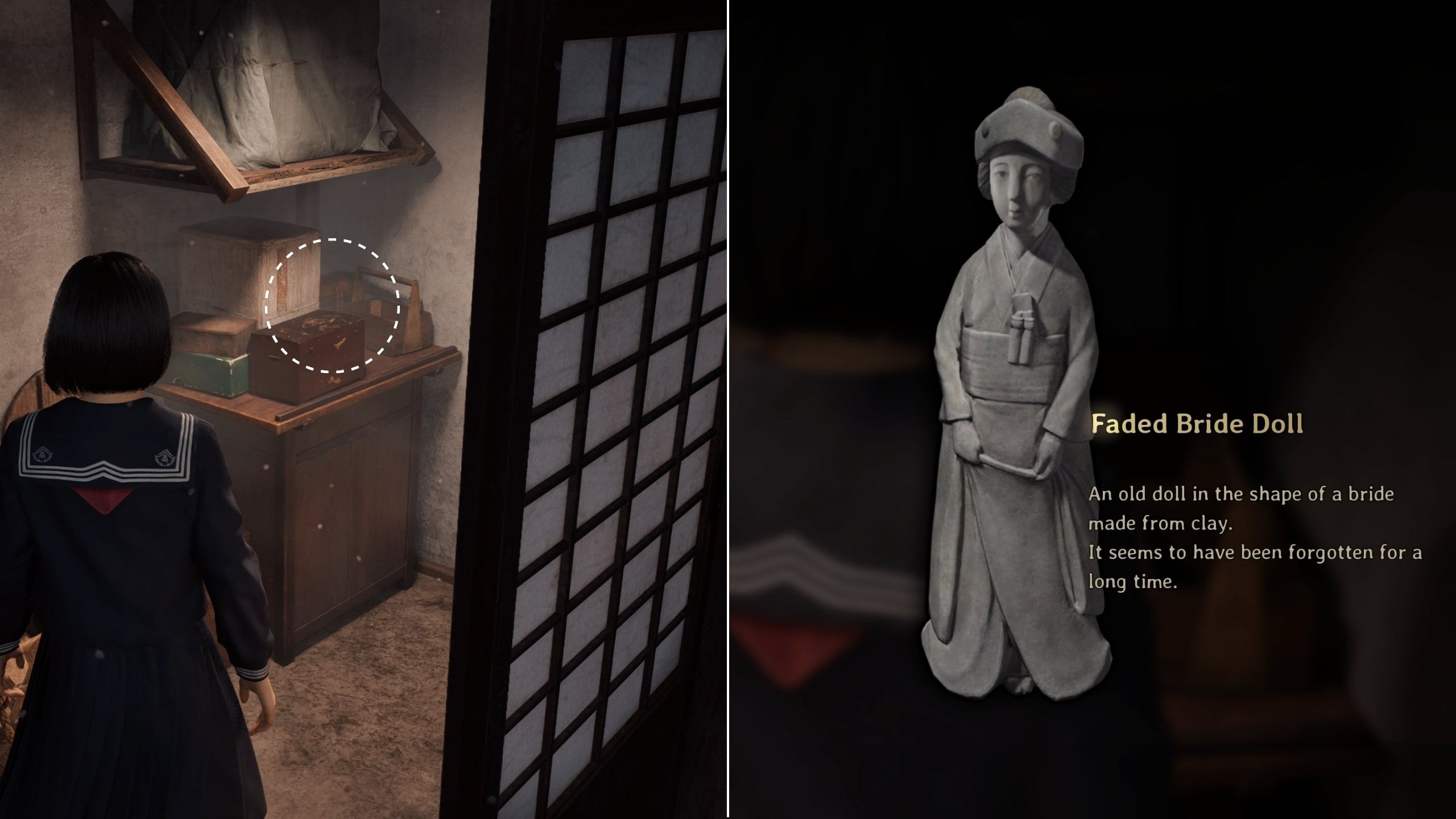 You’ll find several small treasure chests hidden around the house. While some hold collectible notes, the one you’re looking for is downstairs in the kitchen. Open the secret chest tucked away behind the kitchen cabinet to obtain the Faded Bride Doll. You’ll need this as an offering for the first Jizo statue, which is close by.