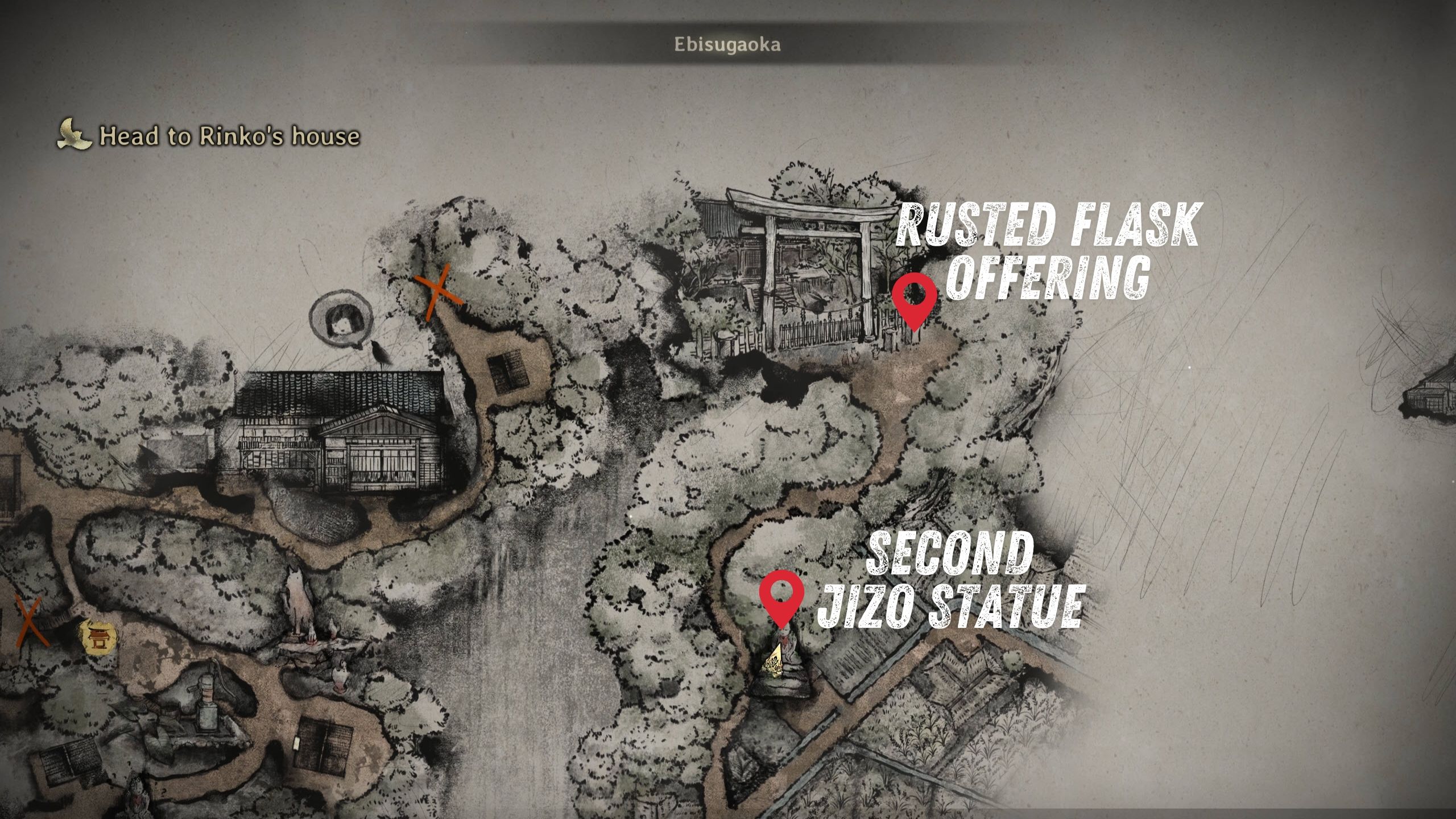 After you get to the Ebisugaoka rice fields, continue north on the path. You’ll know you’re getting close when you start going uphill and reach the Sakuko family’s Sennensugi Shrine. Be sure to approach near the rope and pay attention to the shrine doors-you can see a unique scene here that you won’t see during your initial playthrough. Once you’ve explored, grab the Rusted Flask offering located among the small Inari-sama (fox) statues on the ground.