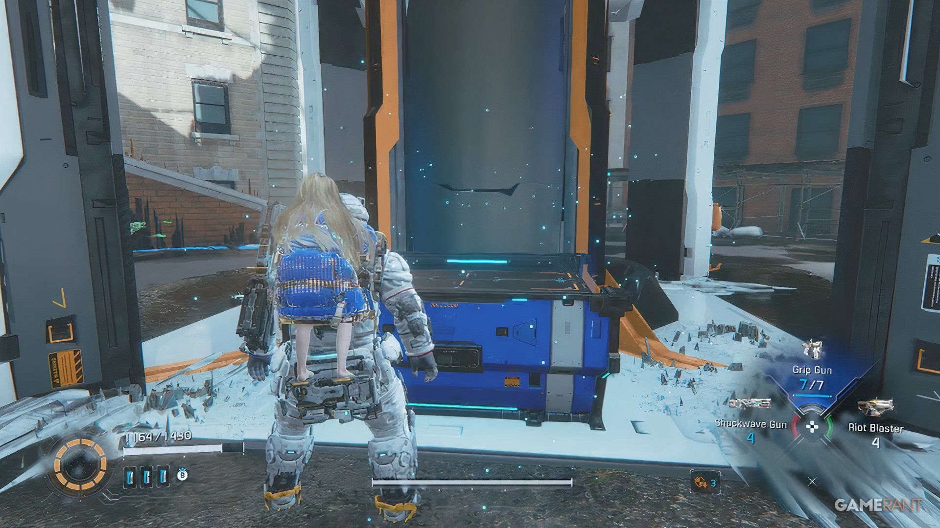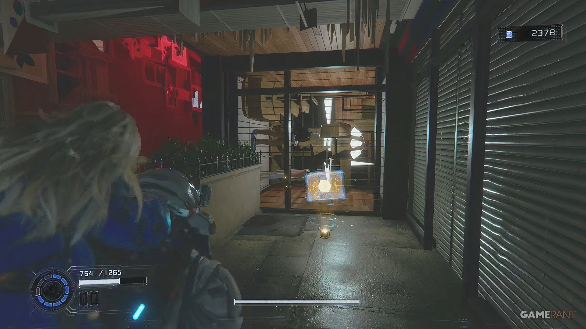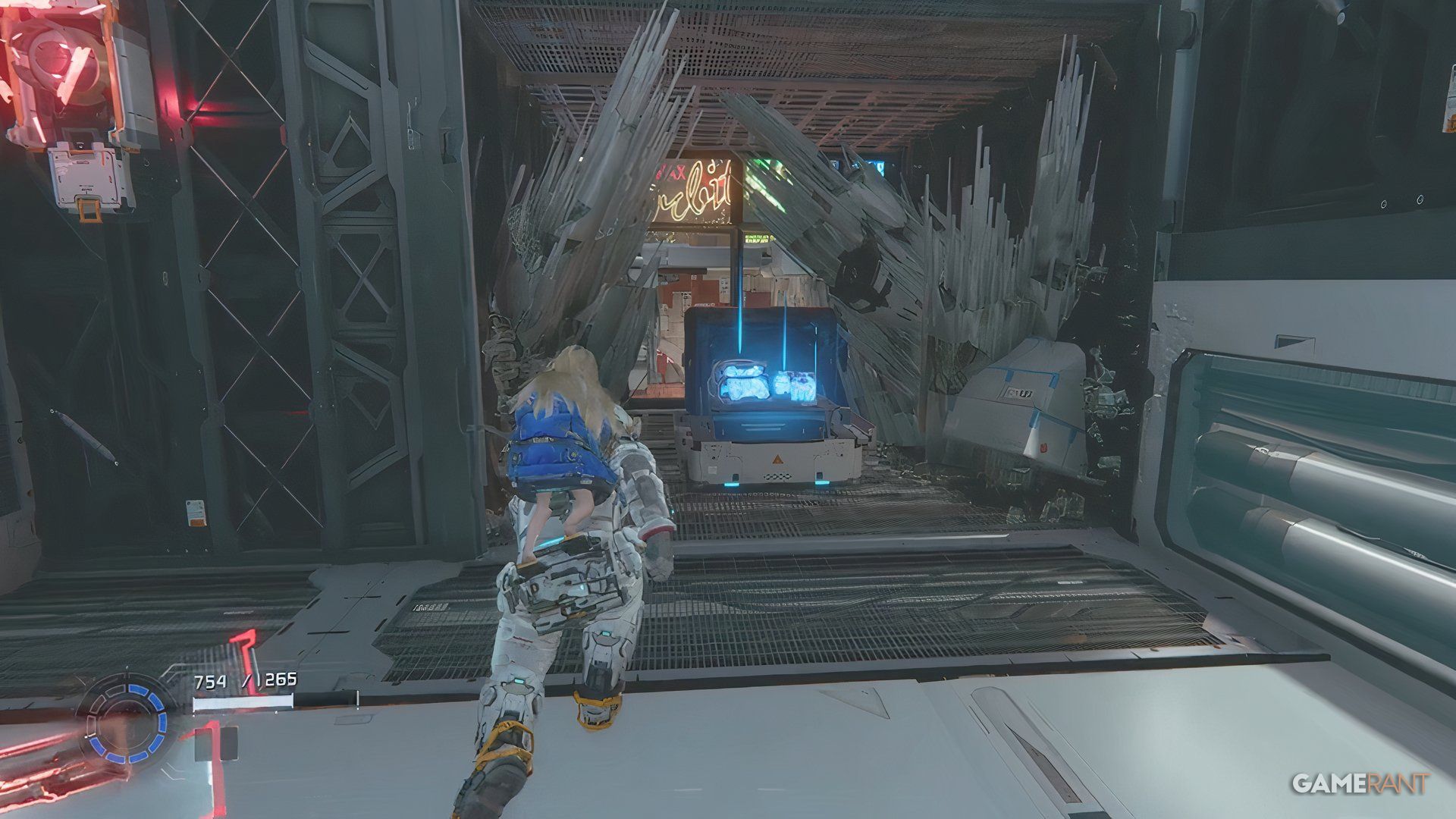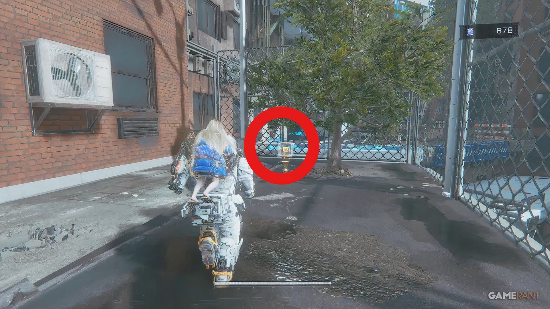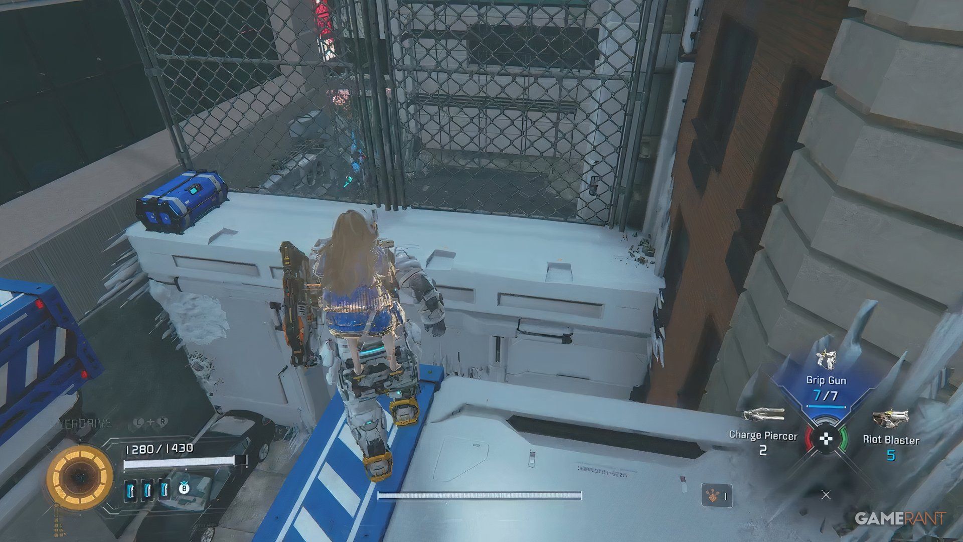 Once you cross the bridge into the Side Alley, drop down and go through the gate you unlock with the Charge Piercer. After dealing with the enemies there, hack the panel to raise a platform. Ride the platform, jump across a few more platforms, and you’ll find a blue container near a high chain-link fence.