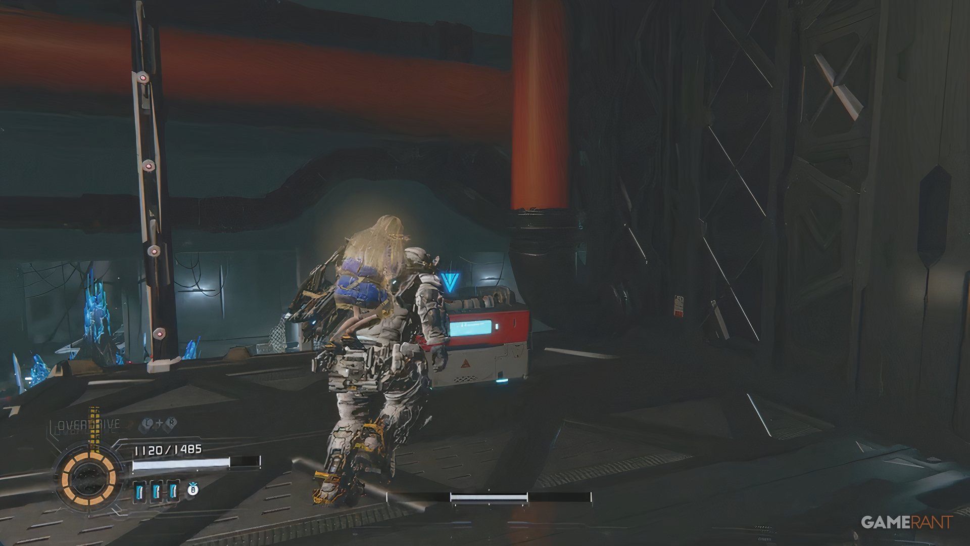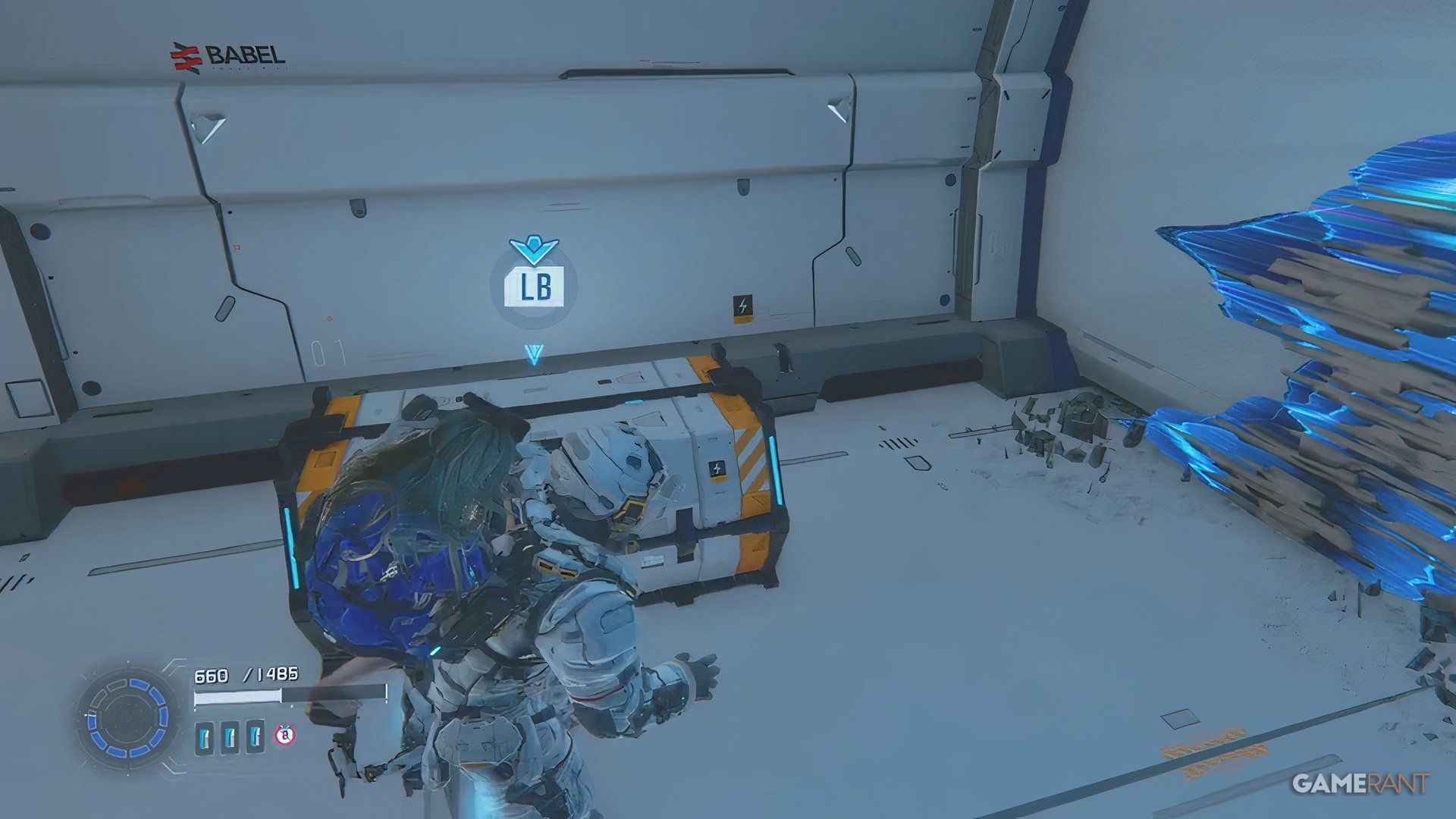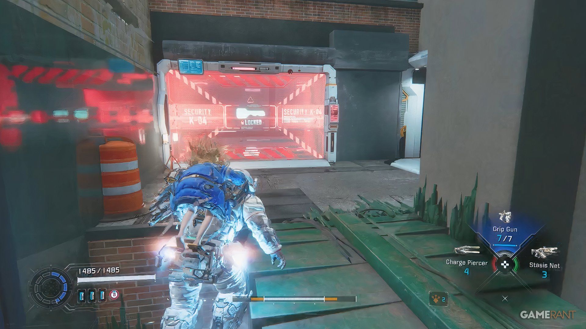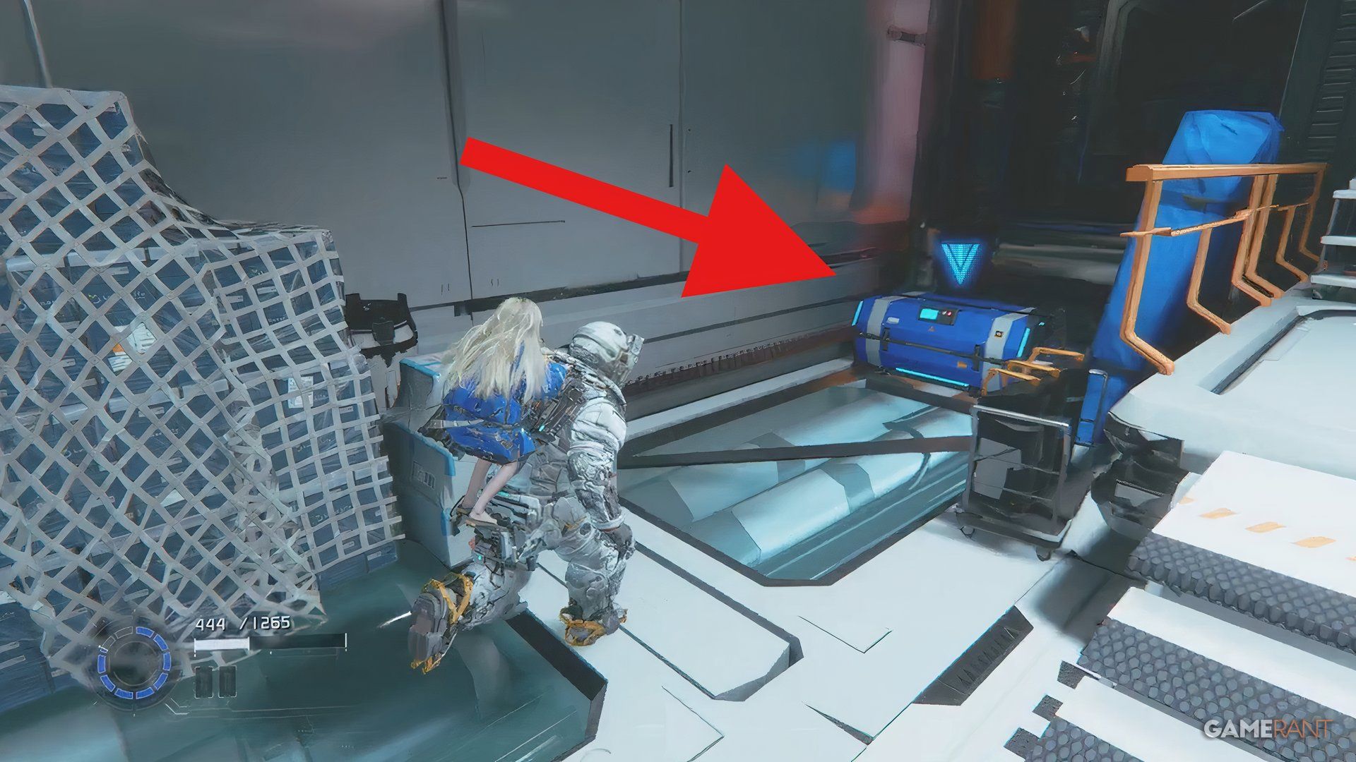 Once you cross the bridge into the Side Alley, drop down and go through the gate you unlock with the Charge Piercer. After dealing with the enemies there, hack the panel to raise a platform. Ride the platform, jump across a few more platforms, and you’ll find a blue container near a high chain-link fence.