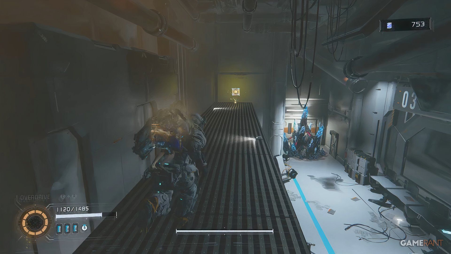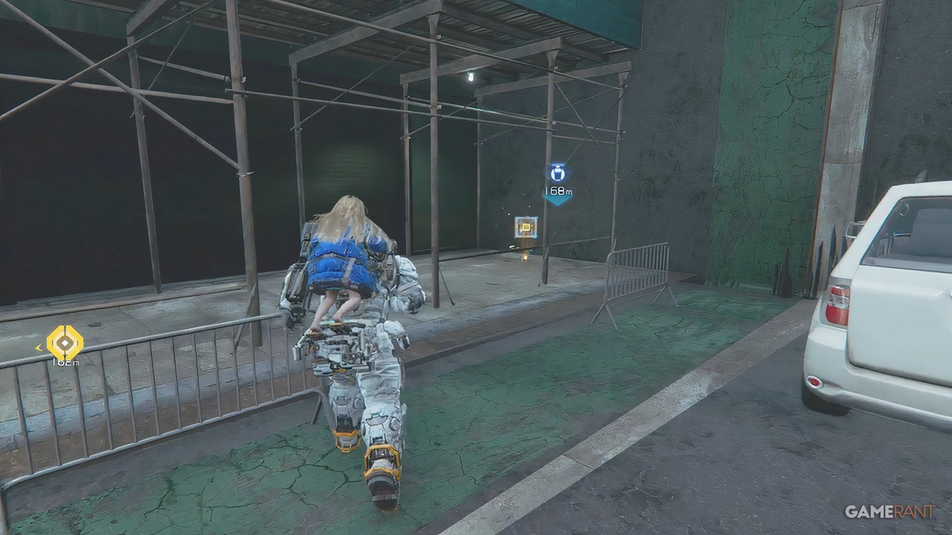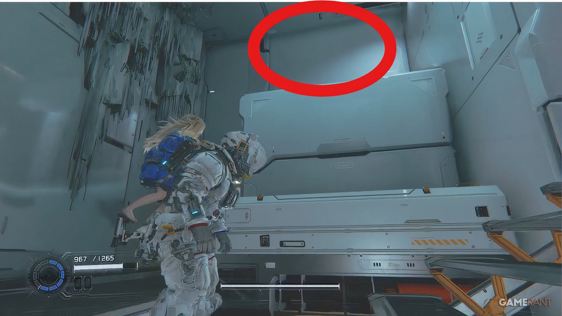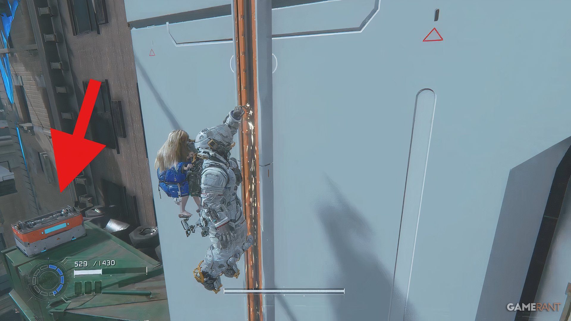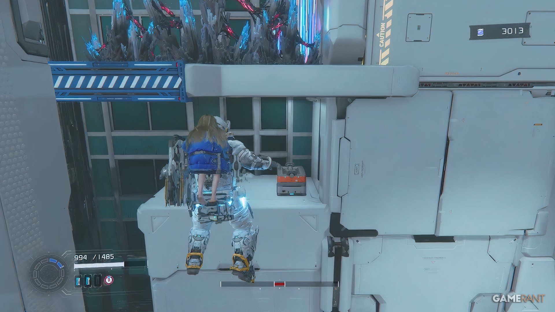 Once you cross the bridge into the Side Alley, drop down and go through the gate you unlock with the Charge Piercer. After dealing with the enemies there, hack the panel to raise a platform. Ride the platform, jump across a few more platforms, and you’ll find a blue container near a high chain-link fence.