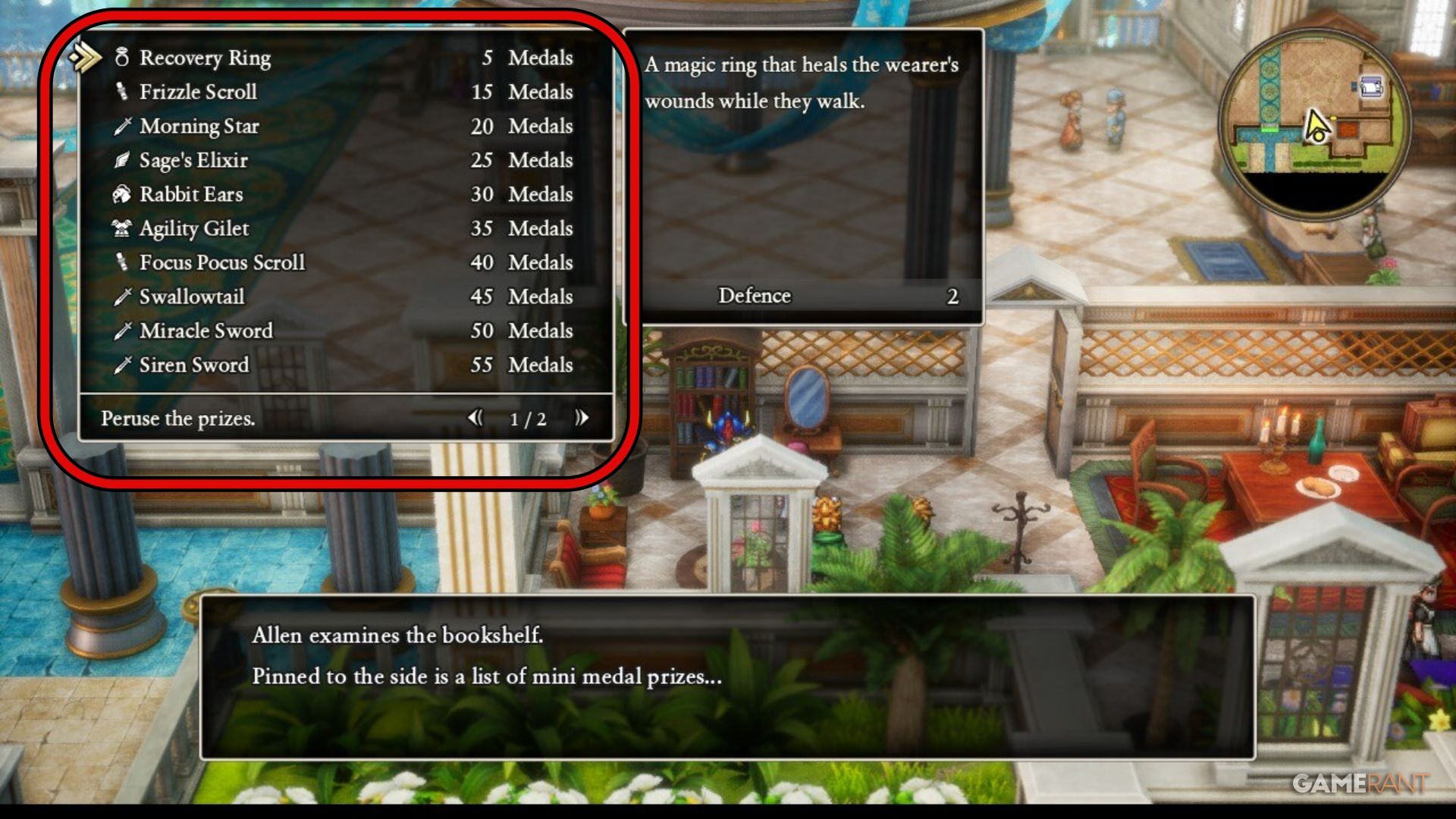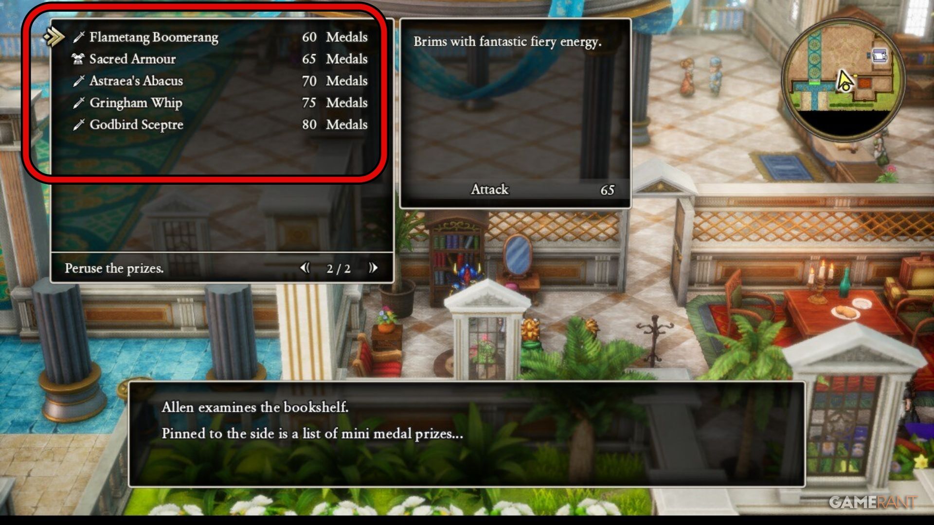 The Medal Maharaja, located in the southern part of the castle, keeps a list of all Mini-Medal rewards in his bedroom bookshelf. He’ll give you a reward every time you turn in five Mini Medals, starting with your fifth and fifteenth, and continuing until you’ve collected a total of 80 Mini Medals.