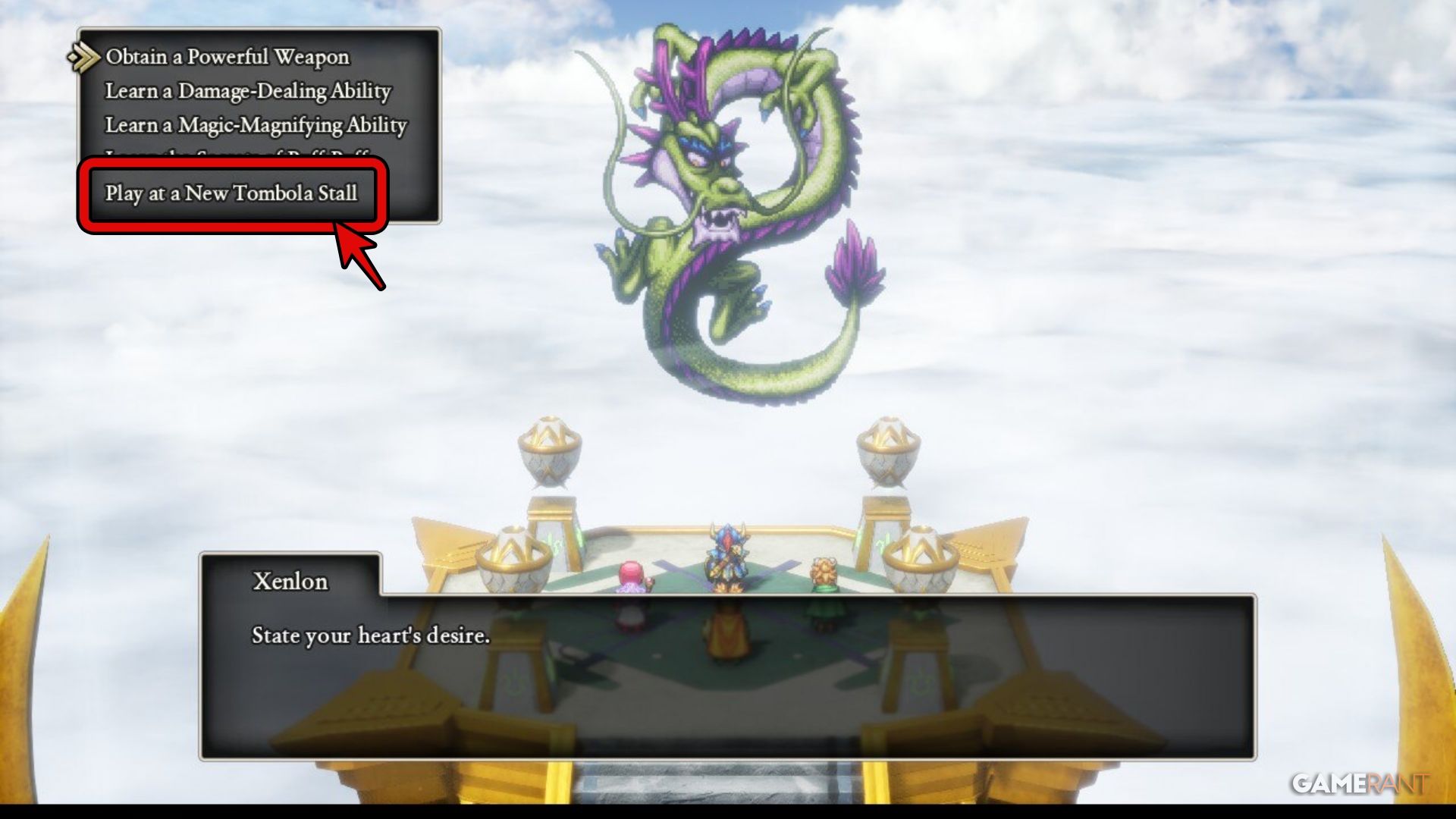 You can open the Tombola Stall in Cloudgate Citadel by climbing the Citadel Tower and defeating Xenon in 25 turns or less. After you beat him, he’ll grant you one wish – choose the Tombola Stall! Each spin on the stall will cost 3 Tombola Tickets.