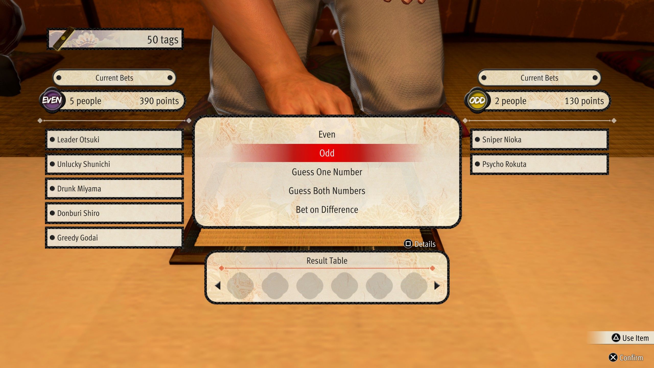 Starting with Chapter 4, you can find a character who starts Substory #19, “Retake the Dragon Palace,” by going through the intersection on Park Blvd. Once you finish this substory, the Dragon Palace will be accessible in the Hotel District, located above the Ikinari Steak building. Inside the Dragon Palace, you’ll find a Gambling Hall with games like koi-koi, oicho-kabu, cee-lo, and cho-han.