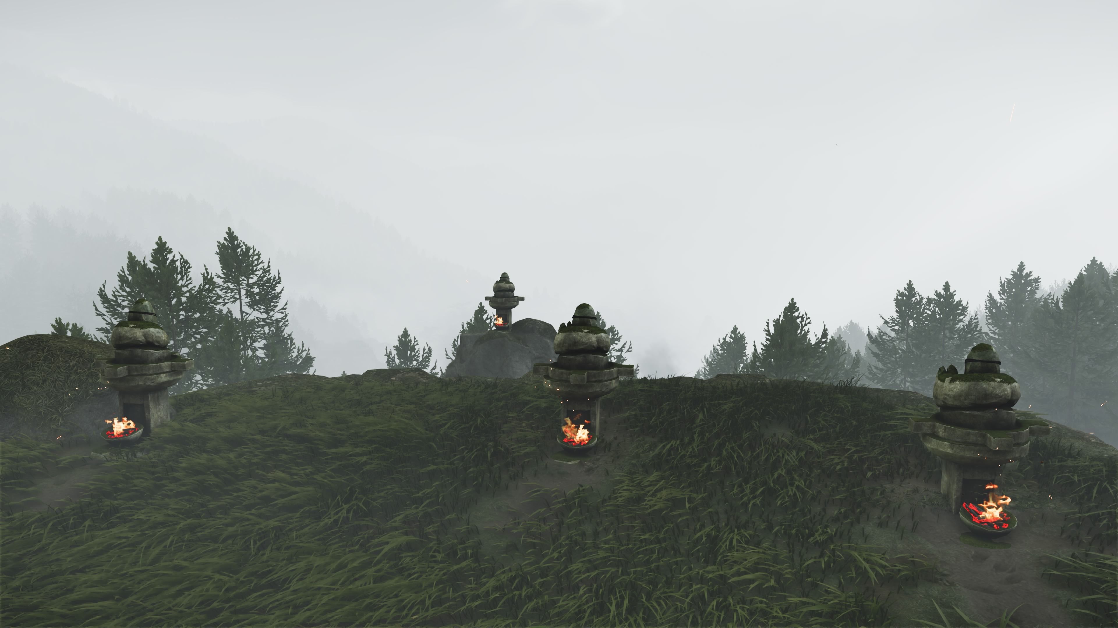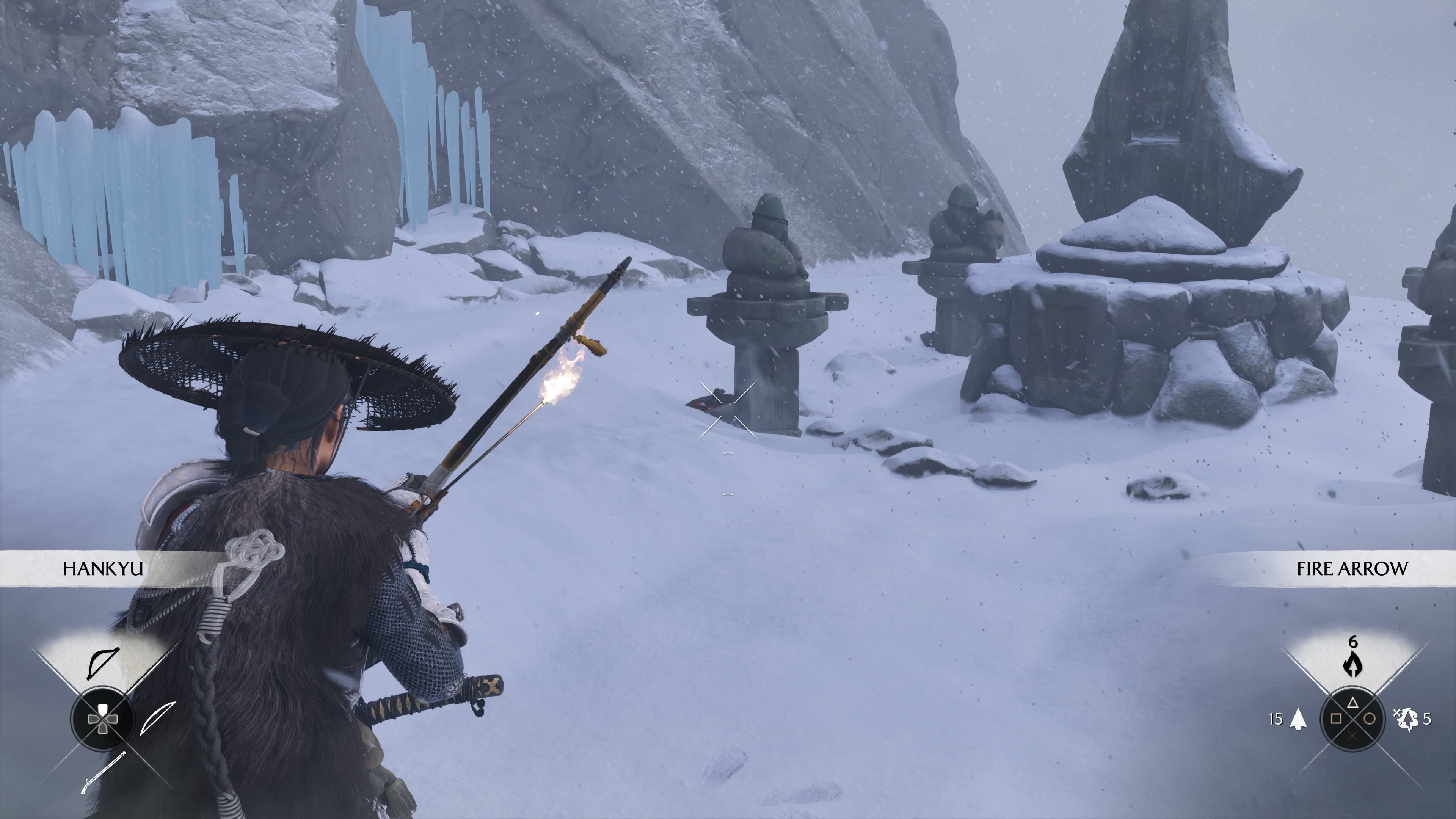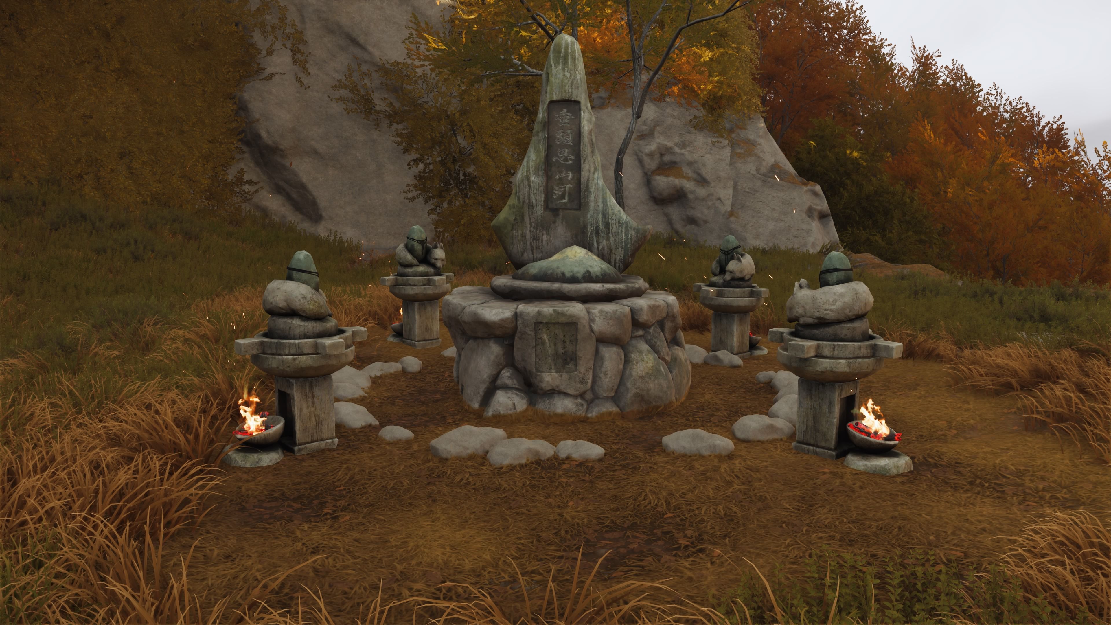 To move the fox statues, you first need to shoot the bundles of sticks under each one using the Hankyu Bow with Fire Arrows. If you run out of Fire Arrows, you can find more at the entrance to the Reliquary of Compassion. Once each statue is lit, you’ll need to rotate all 4 statues so the foxes are facing the altar. This puzzle is easier than the others, and here’s how we figured it out: