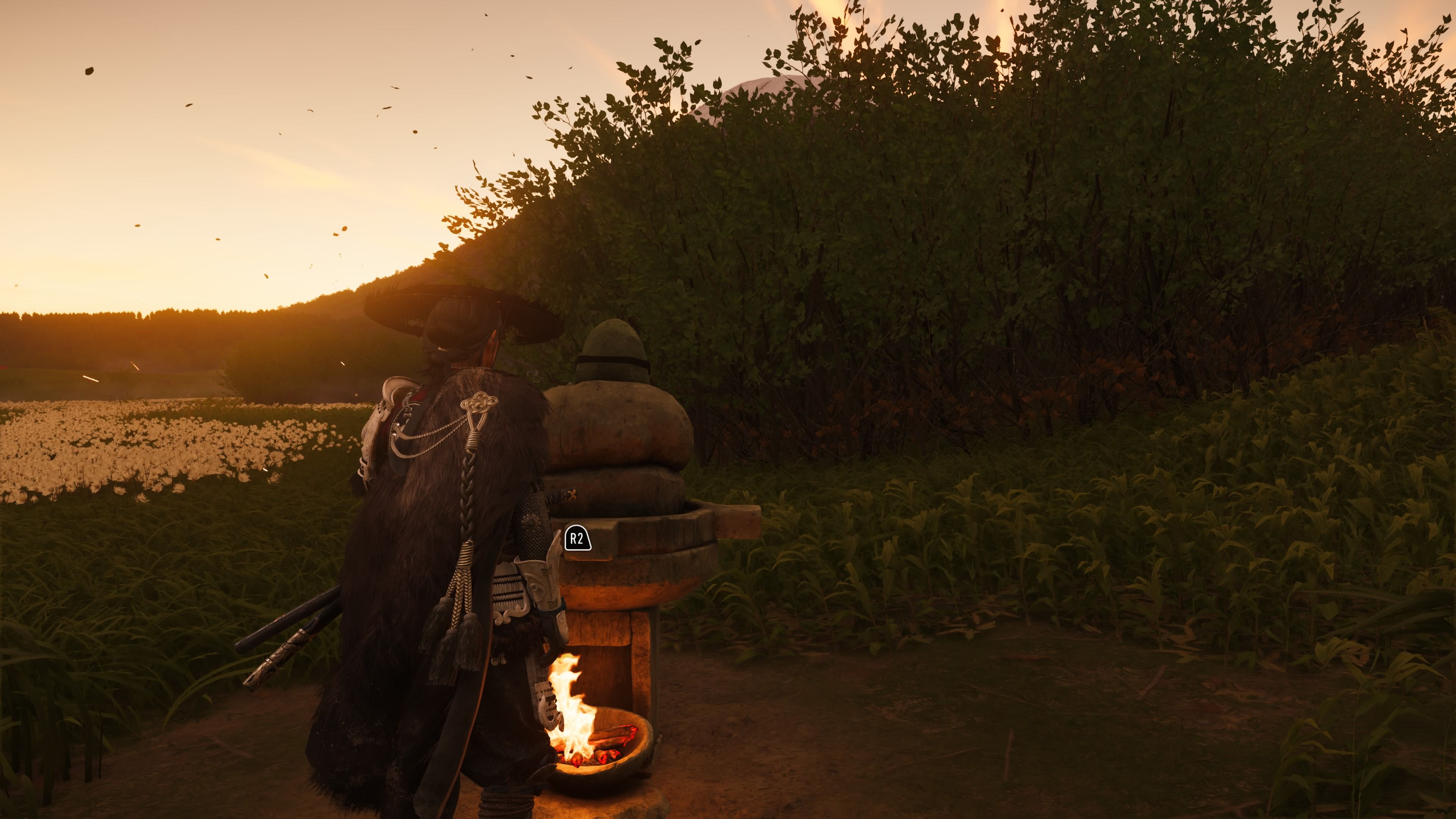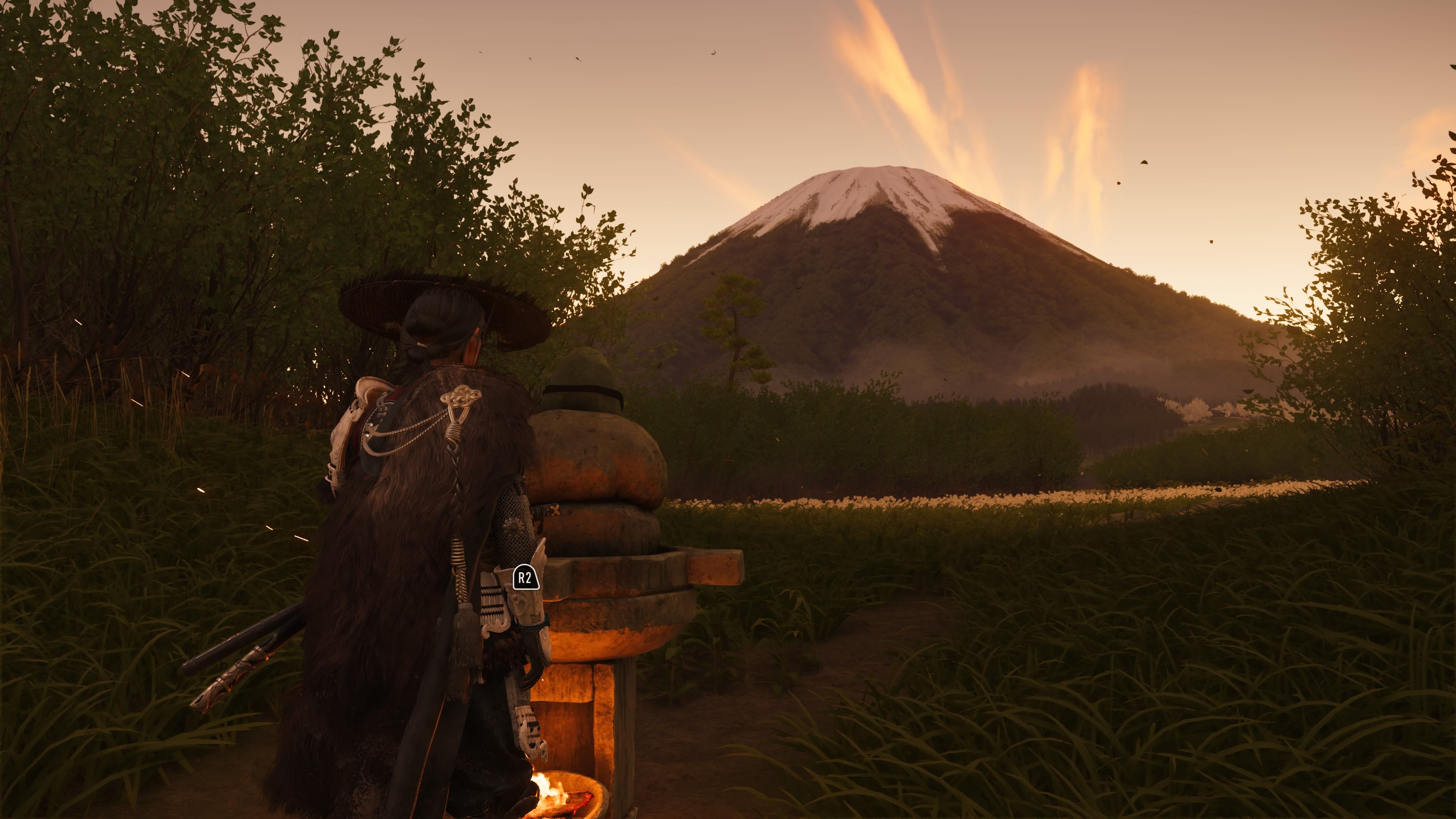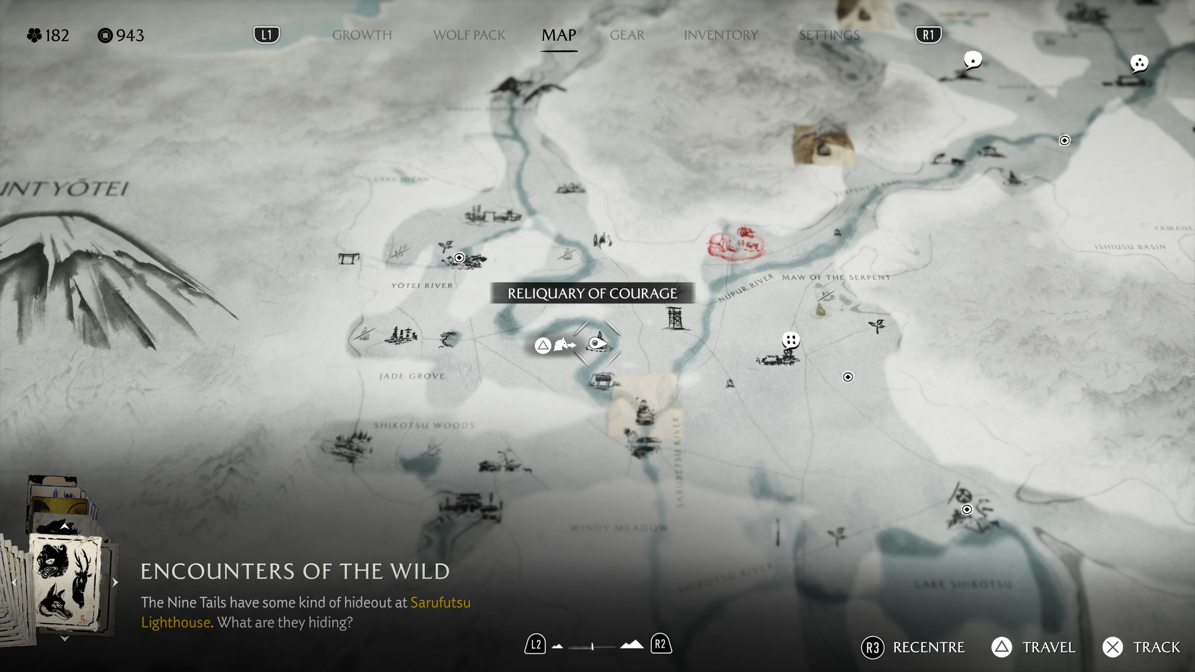 Okay, so I finally found the Reliquary of Courage! It’s tucked away in the western part of the Yotei Grasslands. Basically, you need to follow the Sarubetsu River upstream. Keep going until it splits – then take the left fork. You’ll eventually reach this open field, completely walled in by these huge bushes. The only landmark you can see peeking over them is Mount Yotei. And right in the middle of that little garden area is the Reliquary itself. When I checked out the altar, this riddle popped up: